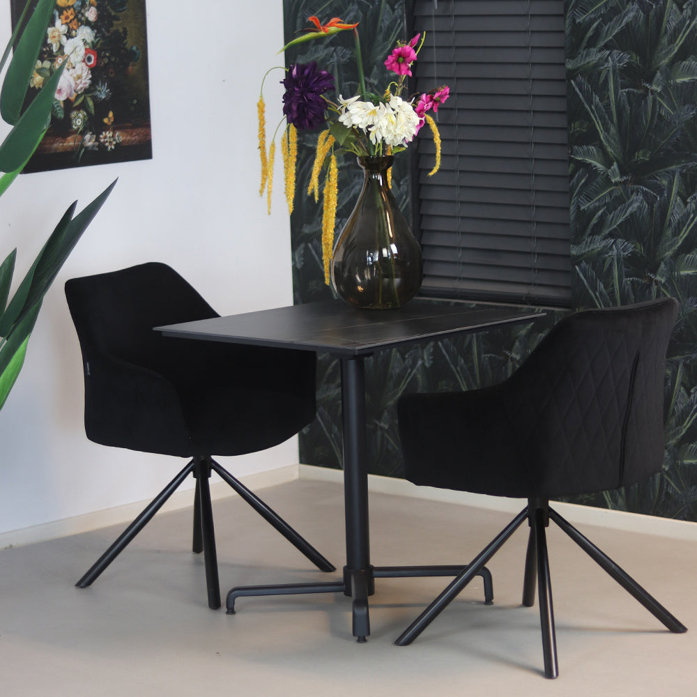 Inklapbare tafel Duuk marmer is de ideale tafel voor in de wat kleinere ruimtes. Doordat de tafel inklapbaar is kun je de tafel snel neerzetten en ook in kleine ruimtes makkelijk opbergen. Het blad van de tafel heeft een opvallende zwarte marmeren look waar mooie witte lijnen overheen lopen. Een echte eyecatcher dus! Door de mooie verdeeldheid van de lijnen geeft het de tafel een moderne en luxe uitstraling. De tafel is gemakkelijk om erbij te pakken tijdens een feestje maar ook de ideale ontbijttafel die na het ontbijt gewoon weer ingeklapt kan worden. Door de zwarte kleur in combinatie met witte lijnen is de tafel gemakkelijk te combineren met verschillende kleuren eetkamerstoelen.