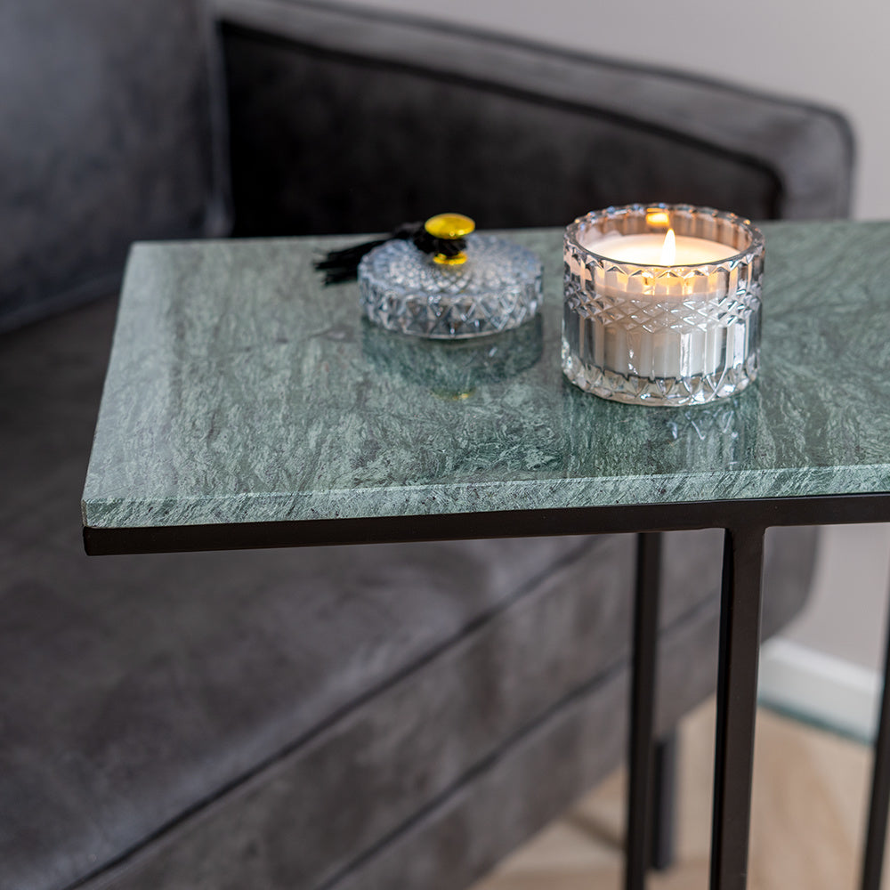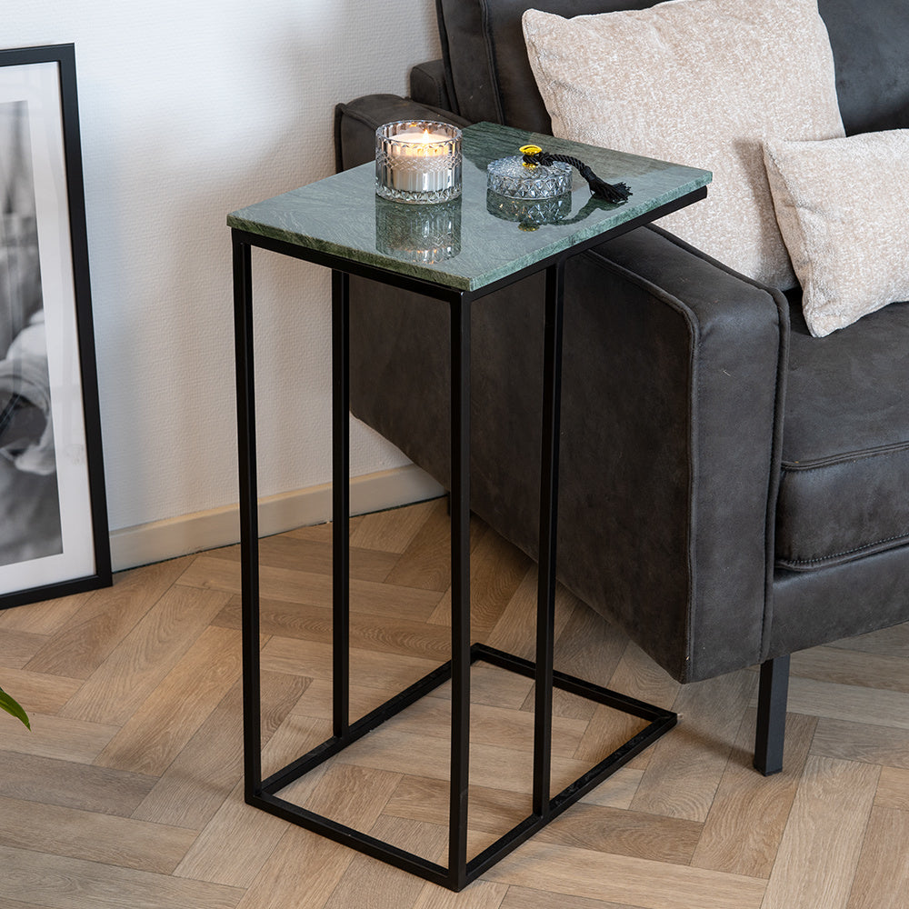 Moderne laptoptafel marmer Zoey groen is 70 cm hoog, waardoor die over de gemiddelde armleuning heen past. Het tafelblad heeft een afmeting van 44 cm breed en 31 cm diep. Het tafelblad is gemaakt van een groen marmer. Marmer kenmerkt zich door de nerven die door het steen heen lopen. Daarnaast heeft de steen van nature een mooie glans. Hierdoor is iedere tafel uniek.
