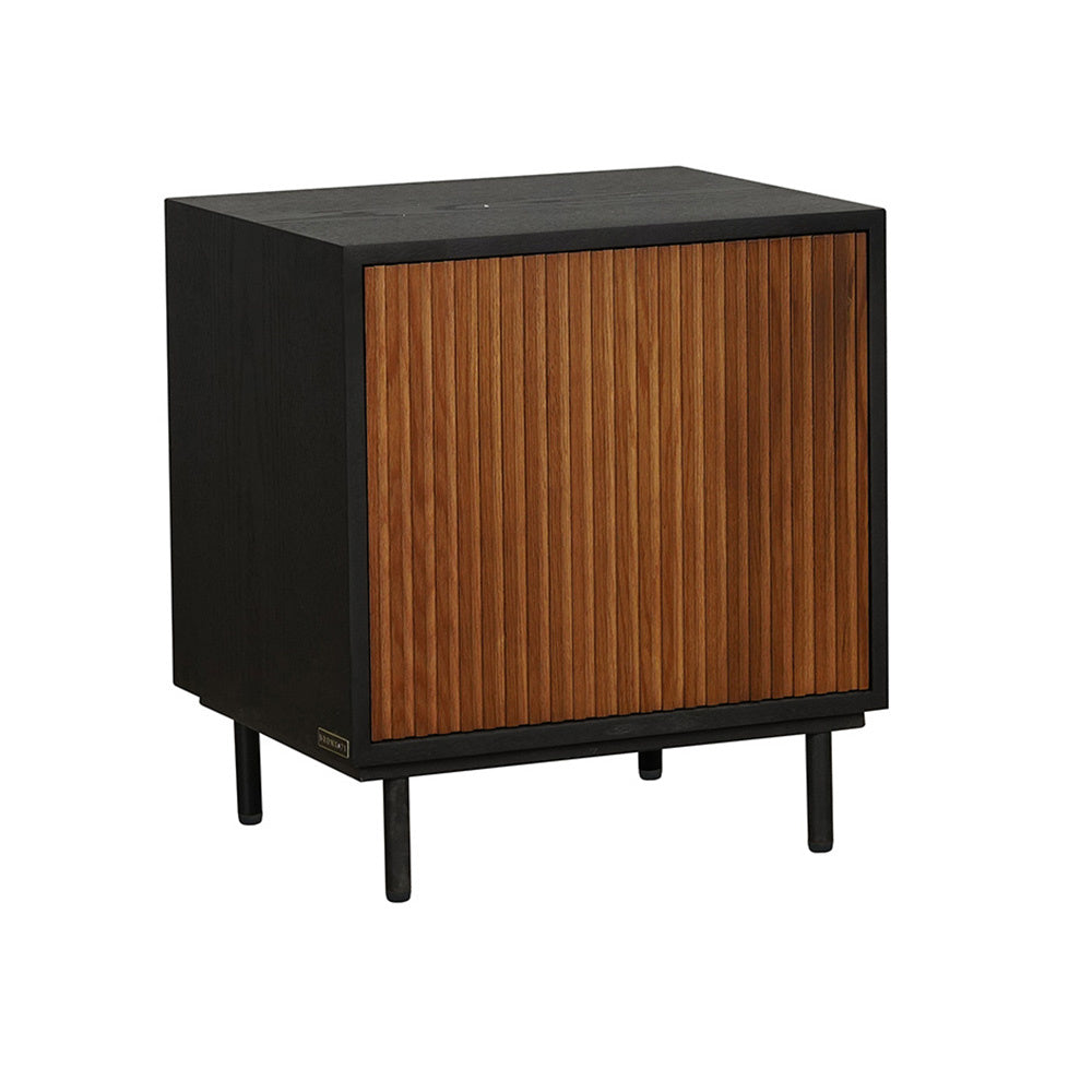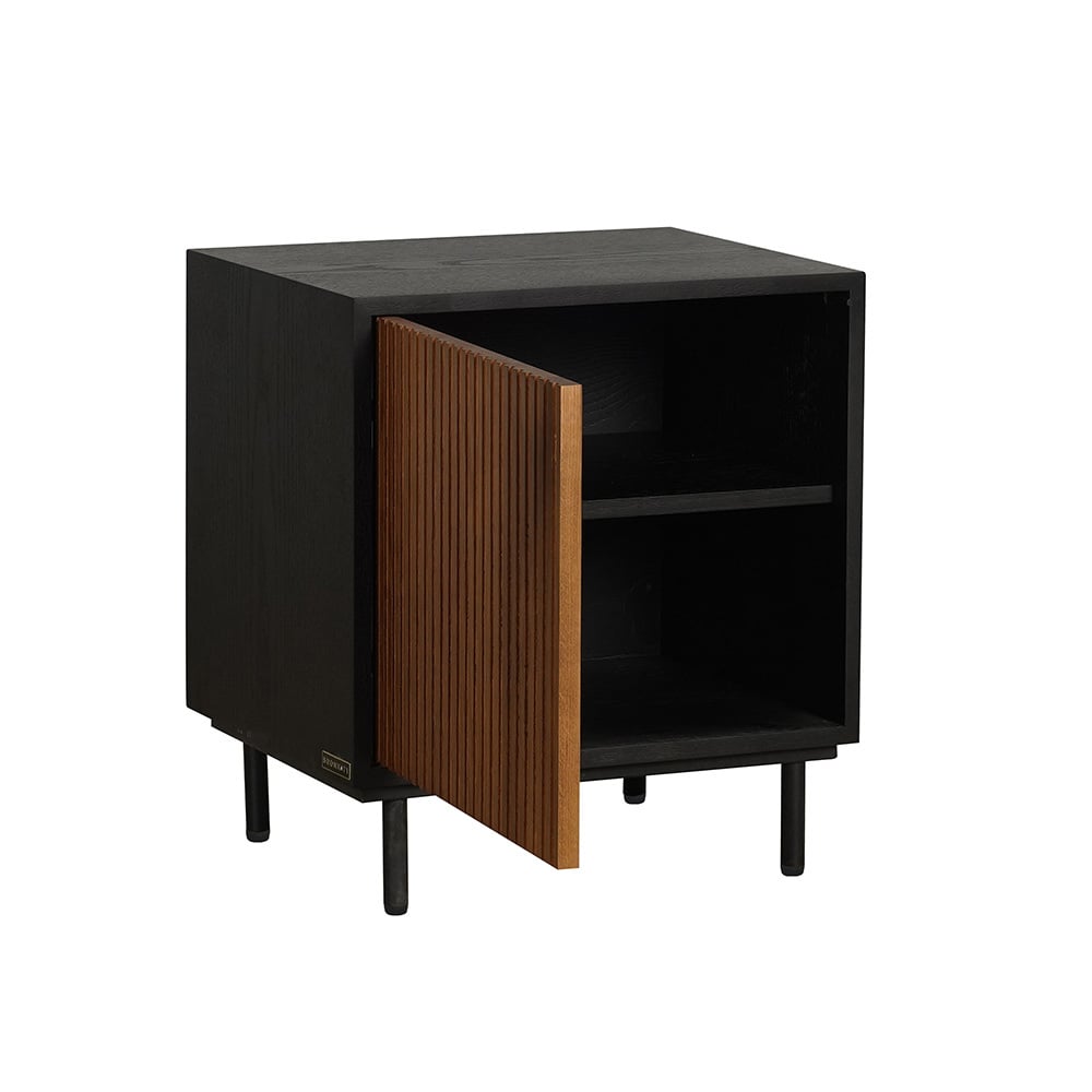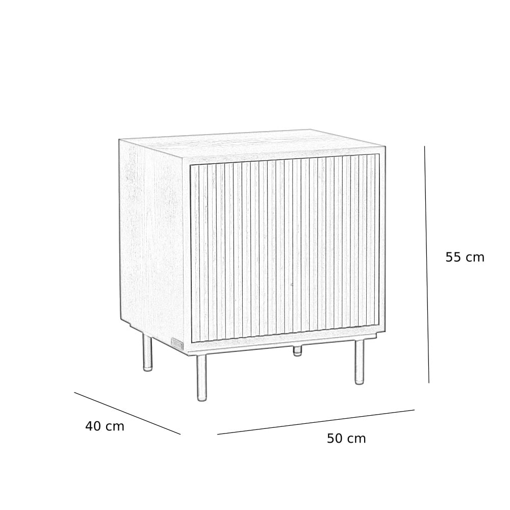 Het front van de kastdeur heeft een gestreept design, waardoor het nachtkastje een elegante uitstraling heeft. Het geribbelde design heeft dezelfde look als die van een houten wandpaneel en het meubel is daardoor ook perfect te matchen met deze interieurtrend. Ook is het kastdeurtje voorzien van een touch to open systeem zodat het geen handgrepen nodig heeft.