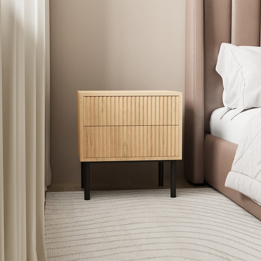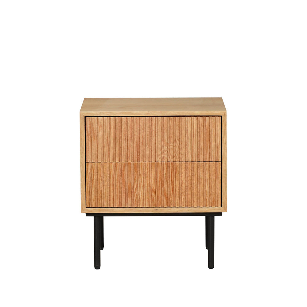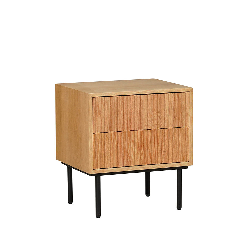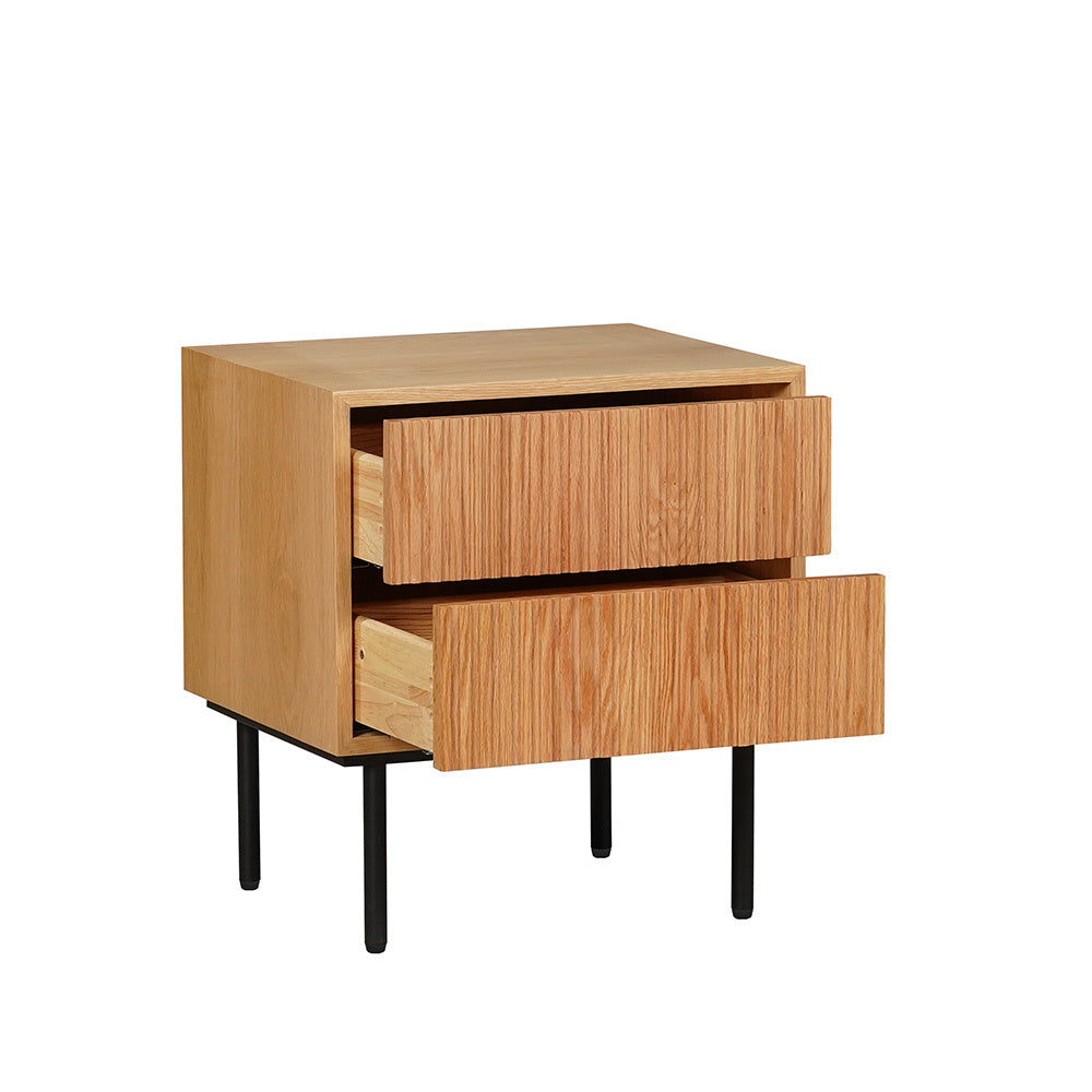 Nachtkastje Yoka is gemaakt van rubberhout met een laag eikenfineer, waardoor het meubel een rustieke uitstraling heeft. De twee uittrekbare lades zorgen ervoor dat het kastje voldoende opbergruimte heeft voor de spullen die je graag binnen handbereik hebt, maar niet in het zicht wil hebben liggen.