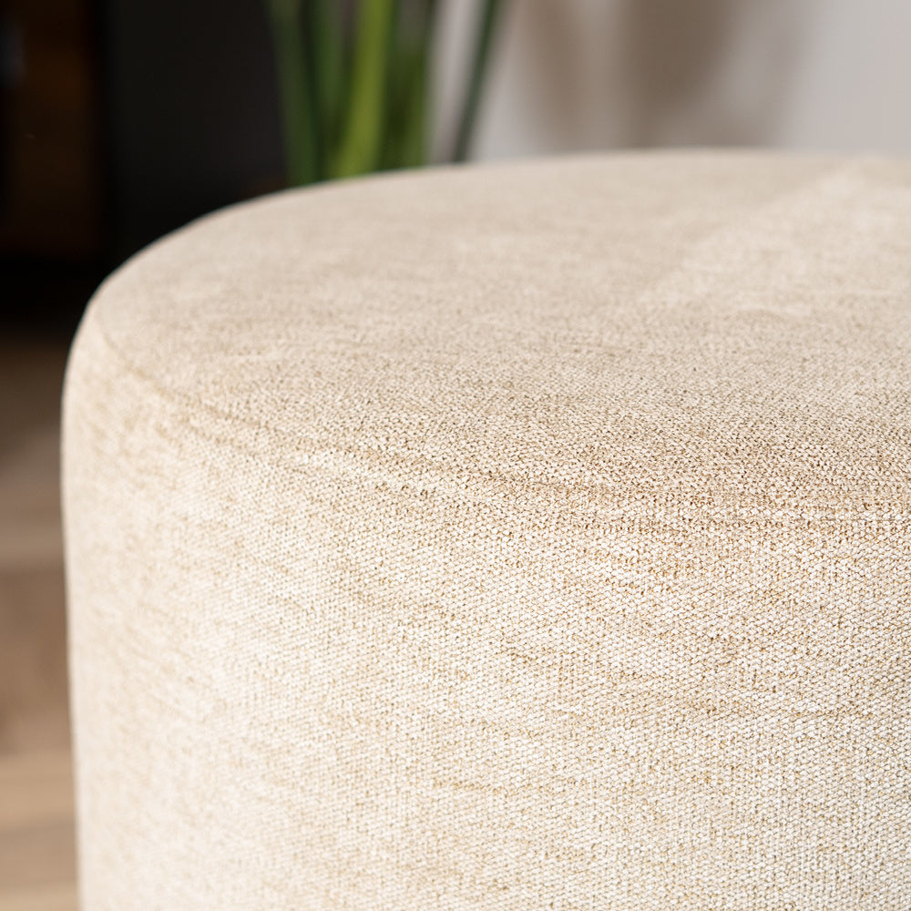 Poef Myles is te krijgen in de kleuren taupe, antraciet, zwart en wit. De poef heeft een diameter van 50 centimeter en is 37 centimeter hoog.
