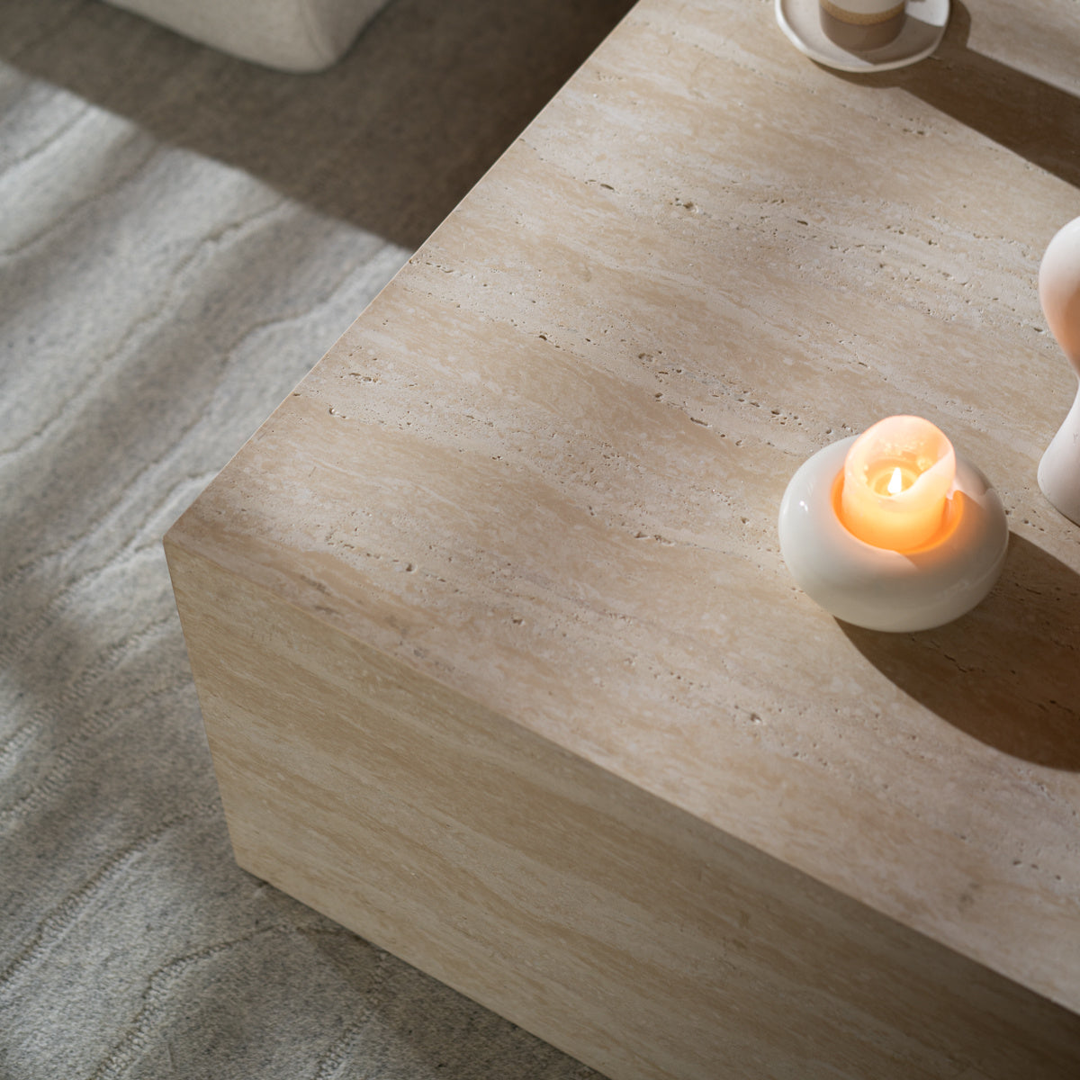 De Salontafel/element Ace travertin 75x75x40 is een veelzijdig meubelstuk dat niet alleen als salontafel kan worden gebruikt, maar ook perfect dienst kan doen als element tussen je bank.