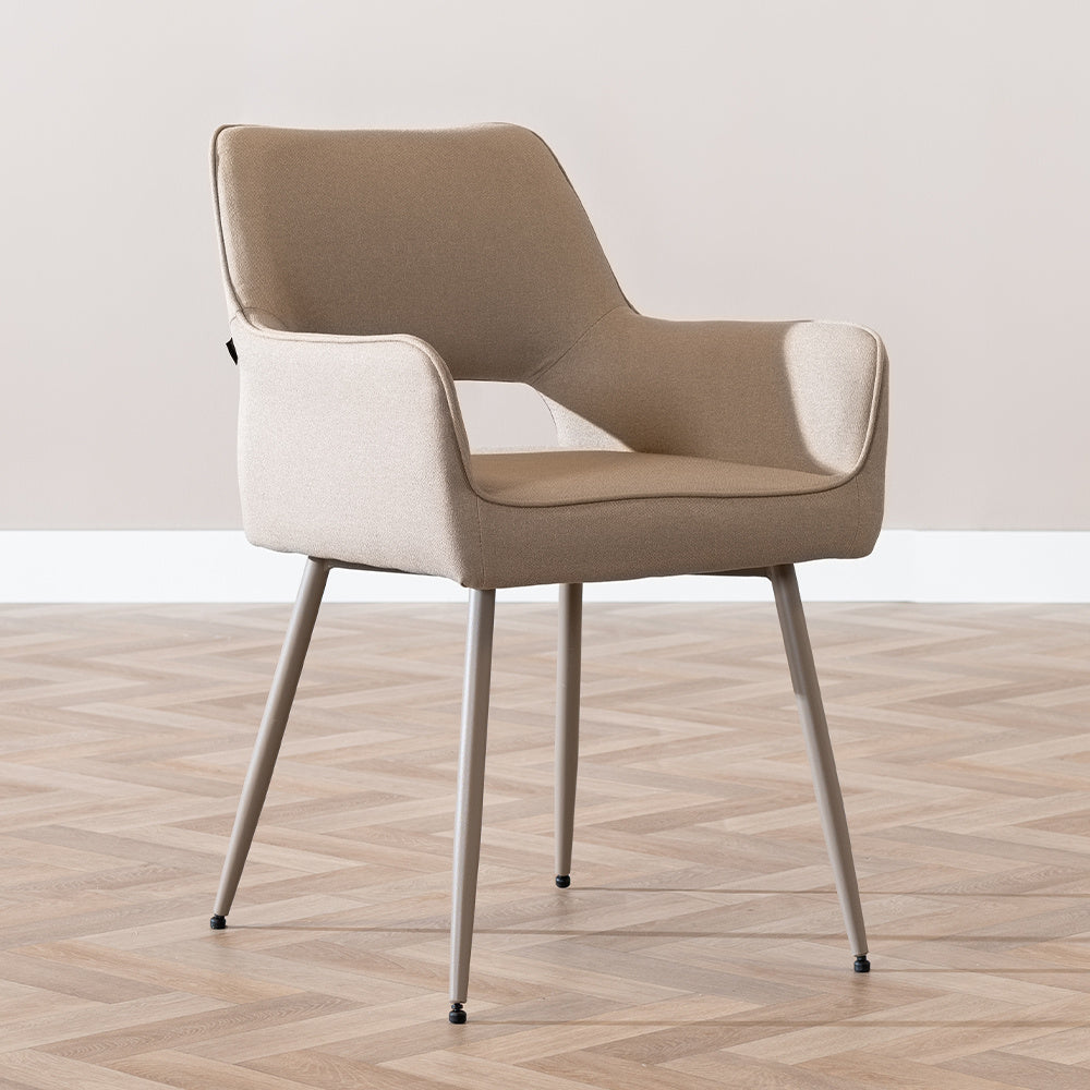 Het unieke aan de Olivia eetkamerstoel is dat het frame is uitgevoerd in een taupe kleur. Dit zorgt voor rust, eenvoud en speelt helemaal in op de huidige interieurtrend. Het frame is gemaakt van gepoedercoat metaal en matcht zo perfect met de zitting.De stoel Olivia heeft door de dichte armleuningen niet een heel breed zitvlak. Dit doet echter niks af aan het zitcomfort van deze stoel! Let op: Dit product wordt geleverd met kunststof vloerdoppen. Dit is niet geschikt voor iedere vloer. Wij verwachten dat je zelf de verantwoordelijkheid neemt om je vloer te beschermen met bijpassende vloerbeschermers.