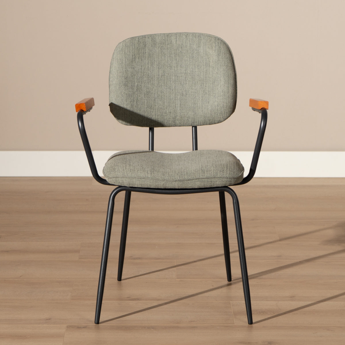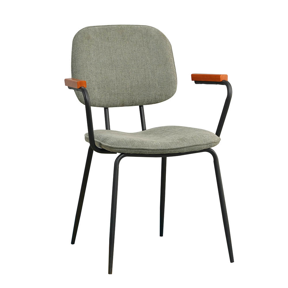Het frame van de Oskar eetkamerstoel is gemaakt van gepoedercoat metaal met een zwarte afwerking. De stoel heeft comfortabele armleuningen welke zijn voorzien van een houten steun.