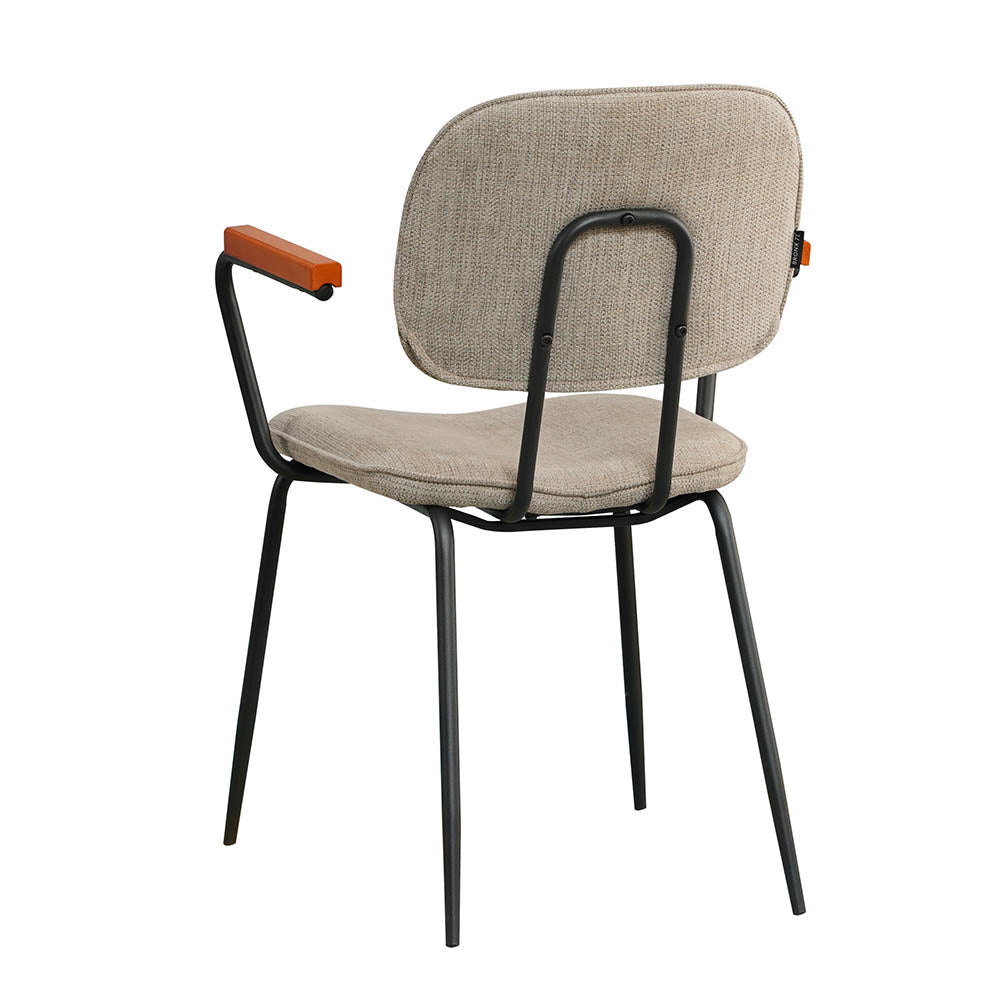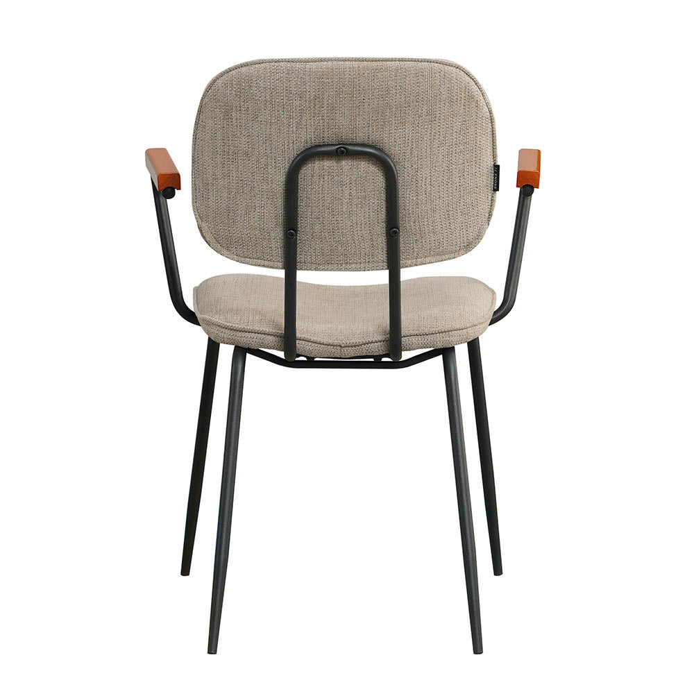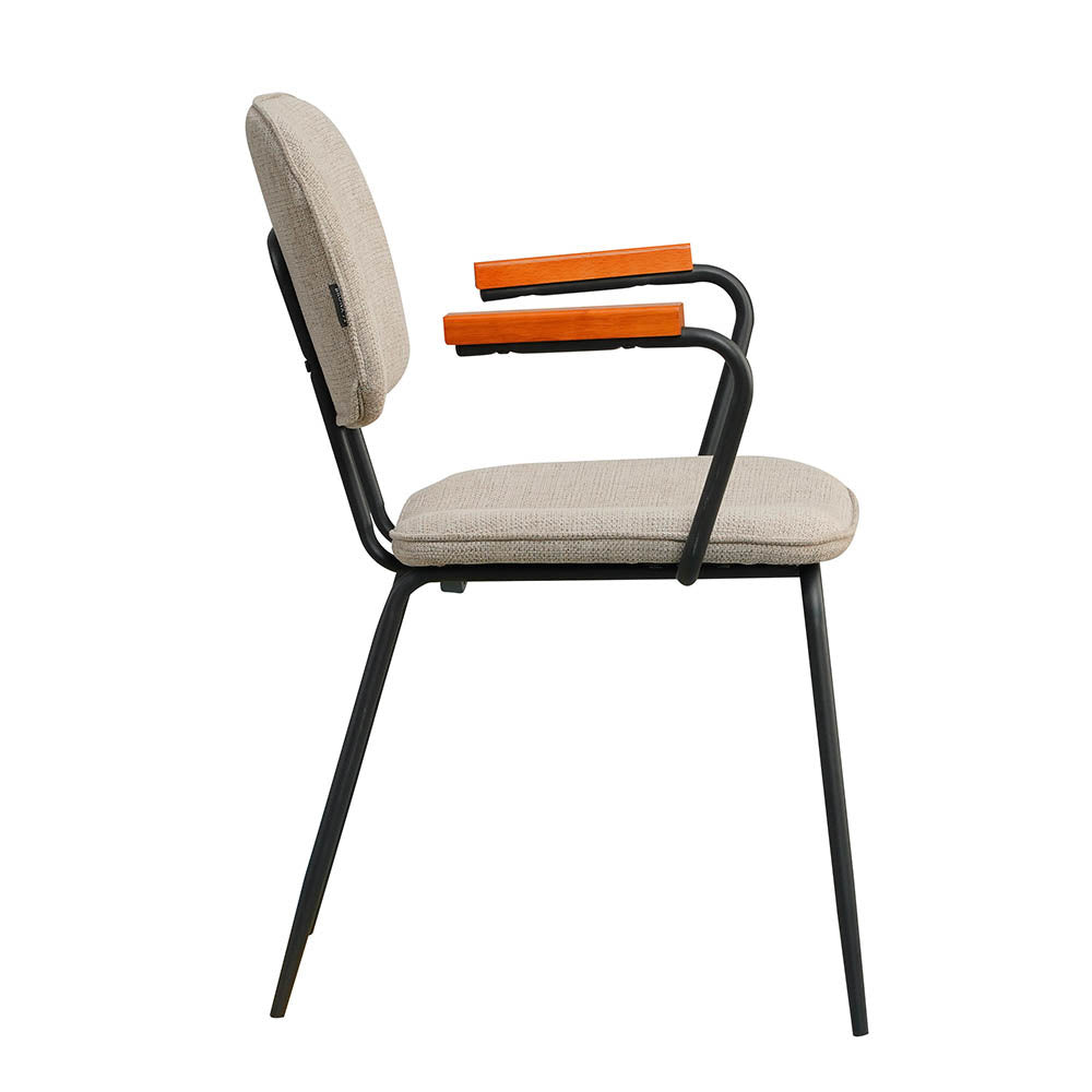 Het frame van de Oskar eetkamerstoel is gemaakt van gepoedercoat metaal met een zwarte afwerking. De stoel heeft comfortabele armleuningen welke zijn voorzien van een houten steun, gemaakt van rubberhout.