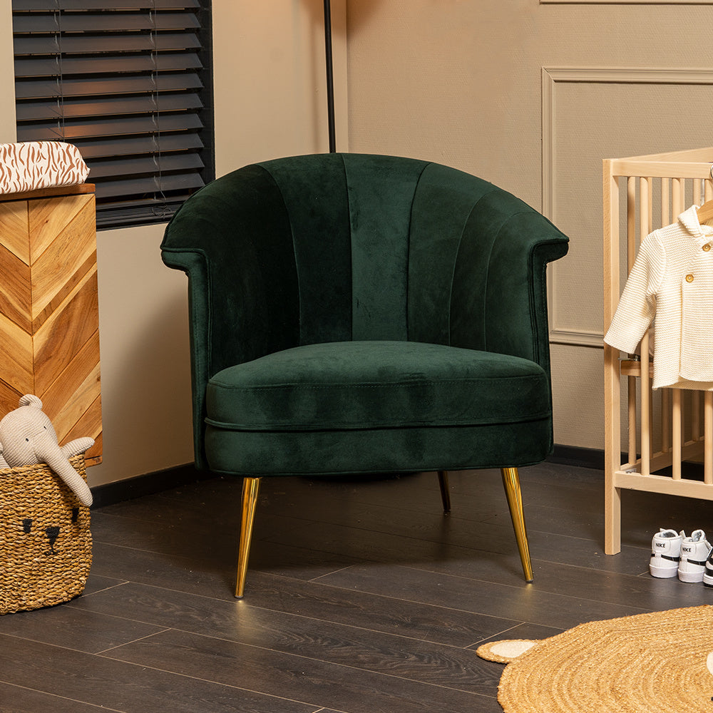 Babykamerstoel Amy heeft een zitting van velvetstof. Velvet is één van de interieurtrends op het moment en geeft een luxueuze uitstraling aan je interieur. Daarnaast is de velvetstof waterbestendig en heeft een martindale score 100.000, wat inhoudt dat deze fauteuil extreem slijtvast is. De poten van de fauteuil zijn gemaakt van metaal.