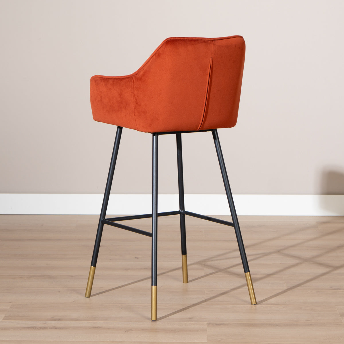 Het onderstel is gemaakt van zwart gepoedercoat metaal waardoor de kruk erg stevig en stabiel staat. De chique gouden pootjes maken dat je de hoogte van de kruk zelf kunt bepalen. De bijgeleverde pootjes zijn gemakkelijk onder het onderstel te draaien. De armleuningen en de dikke zitting maken de barkruk super comfortabel. Zo kun je uren blijven zitten.