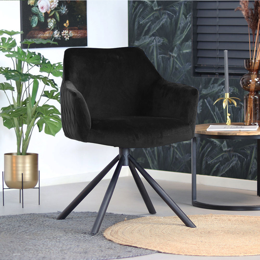 De velvet draaibare eetkamerstoel Furtado is een heus pareltje aan de eettafel! De stoel is bekleed met een zachte velvet stof en heeft een zwart gepoedercoat onderstel. Dit zorgt voor een stoere maar hippe uitstraling! De eetkamerstoel past perfect in een industrieel interieur, maar past ook perfect in een modern interieur. De zitting van de Furtado is 180 graden draaibaar en zal altijd terugdraaien naar een rechte zit. Hierdoor staat de eetkamerstoel altijd perfect aan de eetkamertafel! Praktisch en luxe gecombineerd!