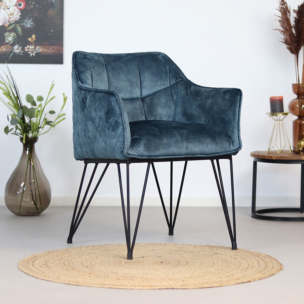De velvet eetkamerstoel Jayron is gemaakt van een luxueuze velvet stof. Deze design eetkamerstoel heeft een brushed metalen afwerking met een zilveren finish dit zorgt voor een luxe maar toch stoere uitstraling. Aan de achterkant en zijkant is de stoel voorzien van een stiksel in de vorm van ruitjes. Wat deze eetkamerstoel uniek maakt is het onderstel. Het onderstel is voorzien van opvallende, stoere poten waardoor deze eetkamerstoel meteen zal opvallen in je interieur! Daarnaast heeft eetkamerstoel Jayron ook nog een hele comfortabele zit door de armleuningen. Dat is pas thuis komen en lekker aan tafel aanschuiven!