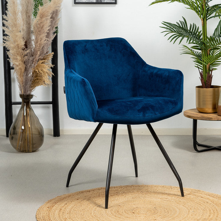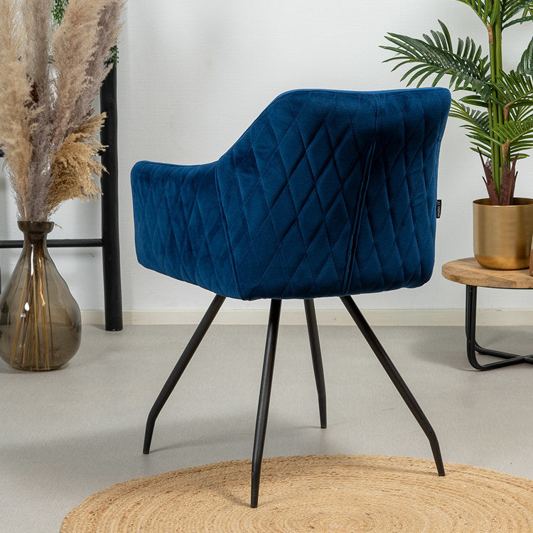 De Nelly eetkamerstoel velvet heeft een mooie zitting, met aan de achterkant van de zitting een mooi ruitpatroon. De eetkamerstoel Nelly heeft armleuning met een comfortabele zitting. De luxe stof van de eetkamerstoel heeft een martindale score van 70.000, wat betekent dat de stof heel slijtvast is! Daarnaast is de velvet stof waterbestendig, wat de stoel perfect maakt voor ieder interieur. Het frame van de eetkamerstoel is gemaakt van zwart metaal wat van binnen naar buiten loopt. De eetkamerstoel Nelly is verkrijgbaar in de kleuren taupe, koper, okergeel, antraciet, donkergroen, zwart en donkerblauw.