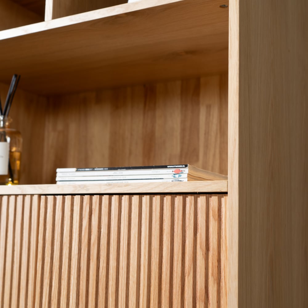 De fronten van de kastdeuren hebben een gestreept design, waardoor de houten kast een elegante uitstraling heeft. Het geribbelde design heeft dezelfde look als die van een houten wandpaneel en het meubel is daardoor ook perfect te matchen met deze interieurtrend. Ook zijn de deuren voorzien van een softclose systeem. Een soft close kastdeur kan heel makkelijk geruisloos gesloten worden en zal als deze te hard wordt dichtgedaan niet snel beschadiging aan het meubel veroorzaken.