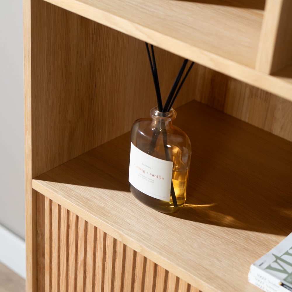 Wandkast Bradley is gemaakt van rubberhout met een laag eikenfineer, waardoor het meubel een rustieke uitstraling heeft. De hoge wandkast is ideaal om extra opbergruimte te creëren in huis. Door de hoogte van 220 cm benut je de ruimte optimaal zonder dat de open kast veel ruimte van de kamer inneemt. Achter de twee kastdeurtjes heb je voldoende opbergruimte voor je boeken, speelgoed of documenten die je niet in het zicht wilt hebben. De planken in de kast kun je zelf afstellen op de hoogte die je nodig hebt om je spullen goed op te kunnen bergen.