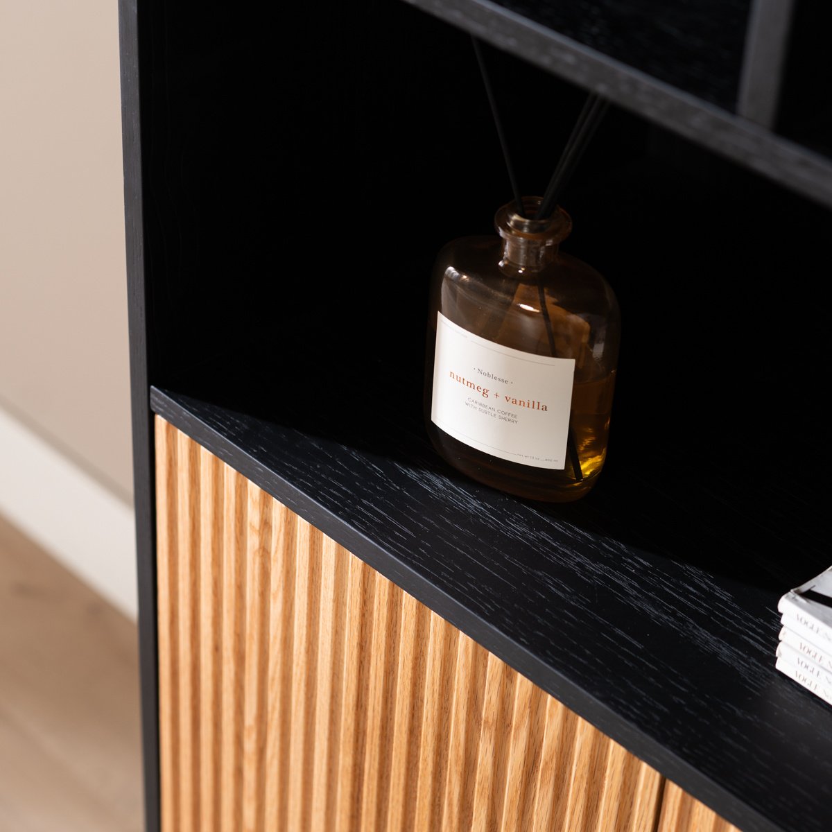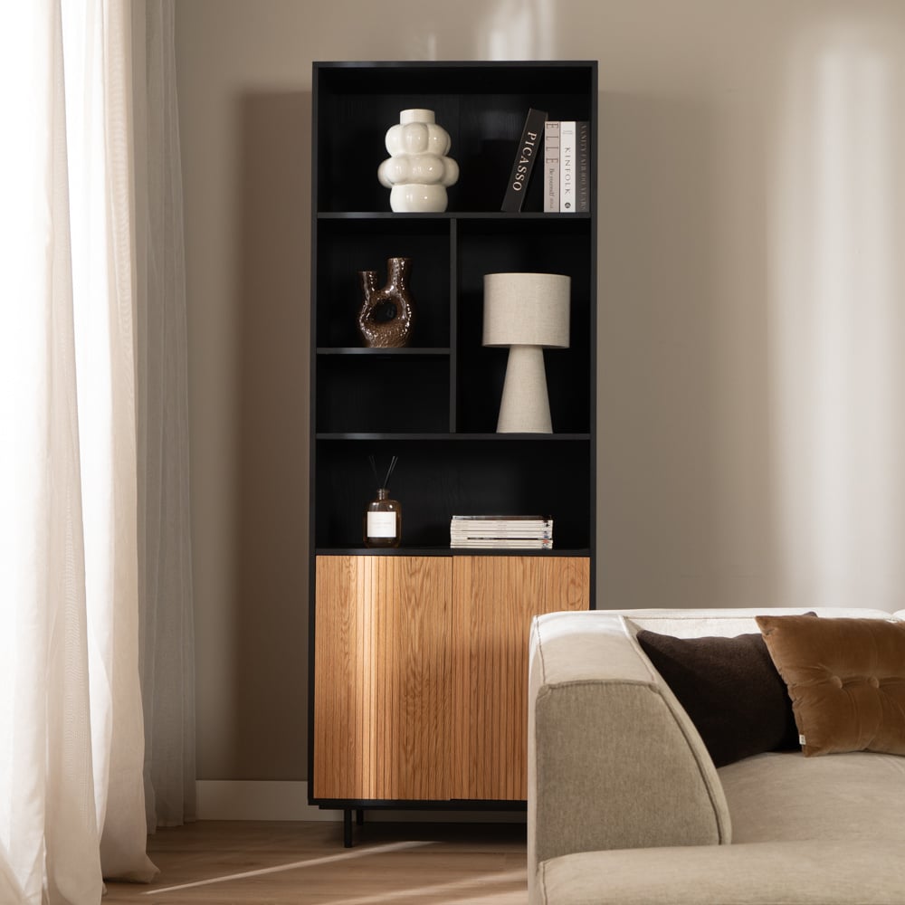 Wandkast Bradley is gemaakt van rubberhout met een laag eikenfineer, waardoor het meubel een rustieke uitstraling heeft. De hoge wandkast is ideaal om extra opbergruimte te creëren in huis. Door de hoogte van 220 cm benut je de ruimte optimaal zonder dat de open kast veel ruimte van de kamer inneemt. Achter de twee kastdeurtjes heb je voldoende opbergruimte voor je boeken, speelgoed of documenten die je niet in het zicht wilt hebben. De planken in de kast kun je zelf afstellen op de hoogte die je nodig hebt om je spullen goed op te kunnen bergen.