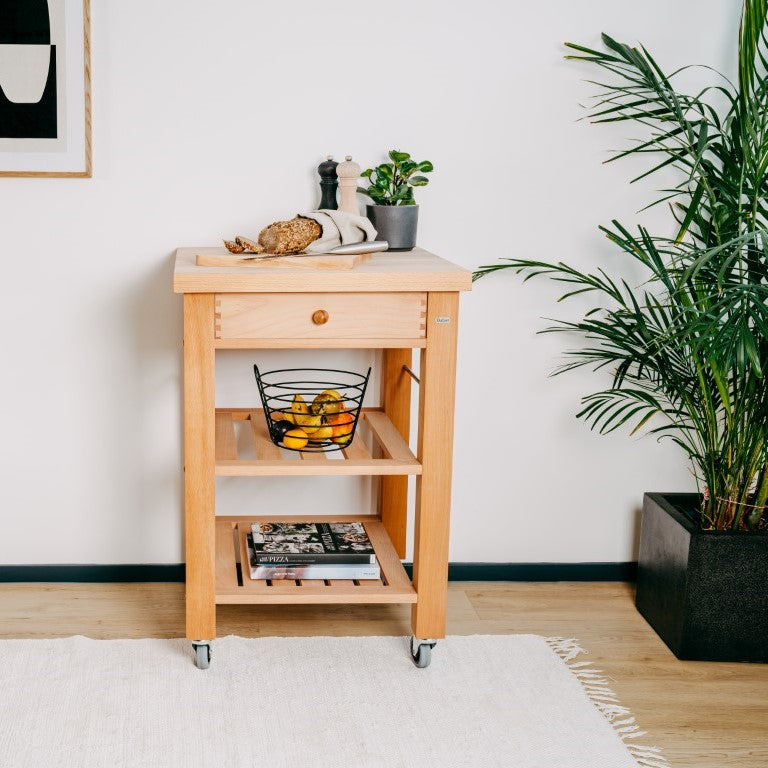 Deze robuuste trolley van Butler is gemaakt van duurzaam, gestoomd beukenhout en heeft een langshouten bovenblad van 4 centimeter dik.