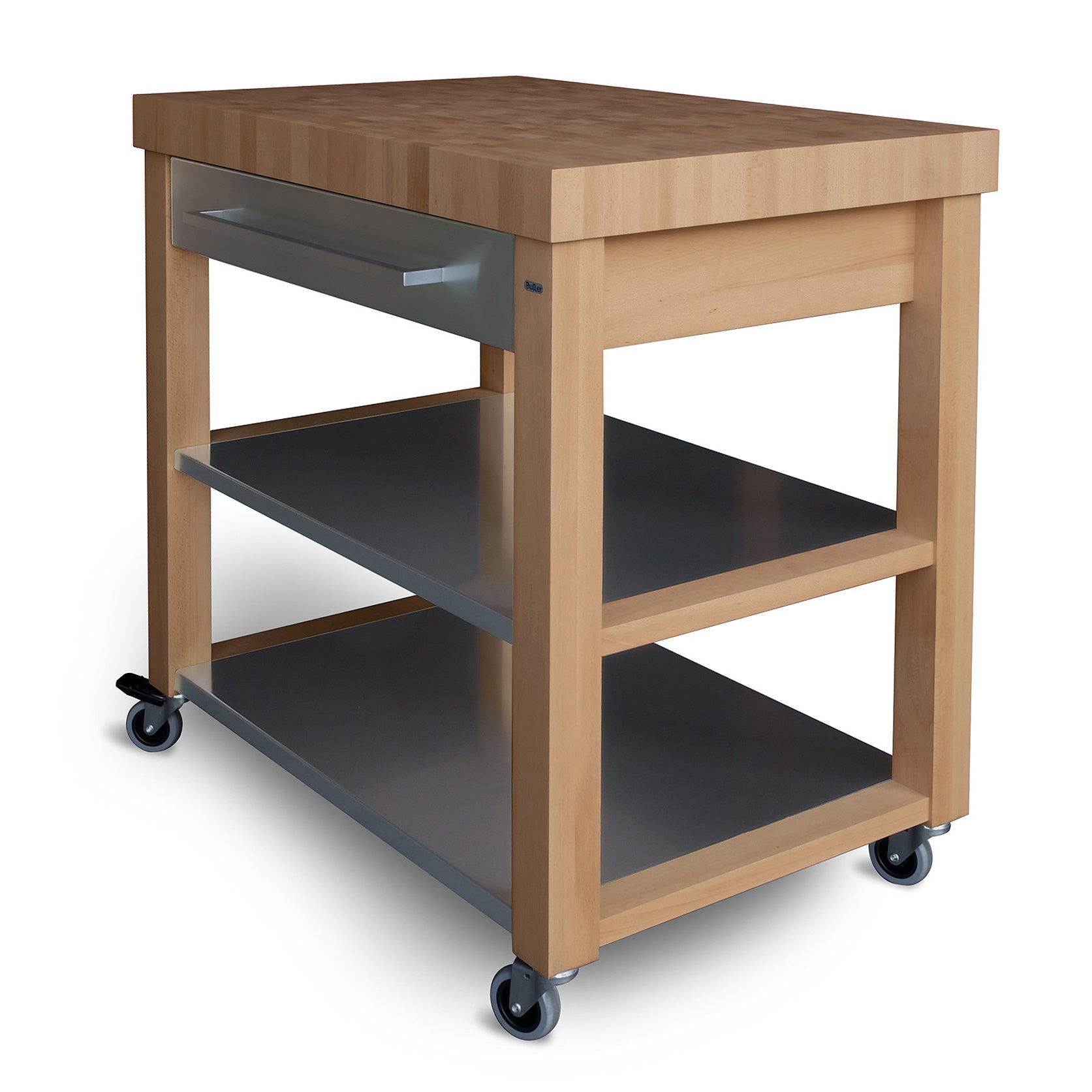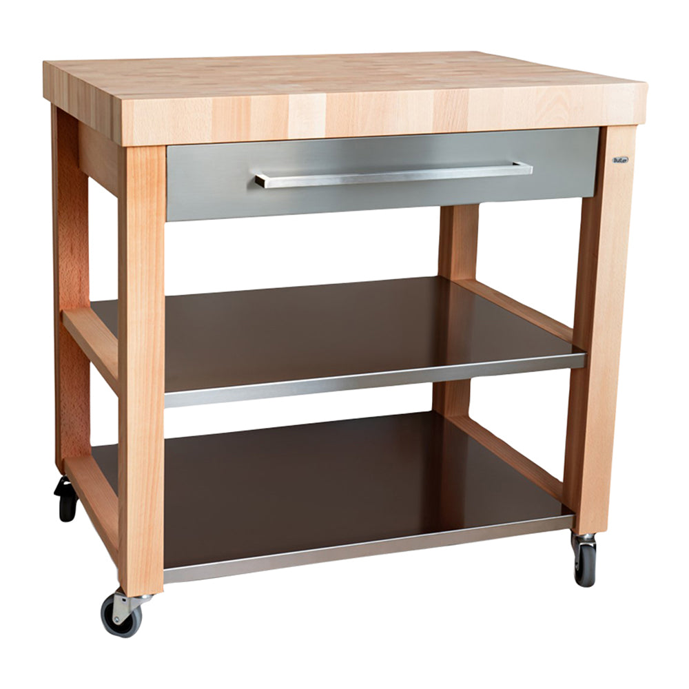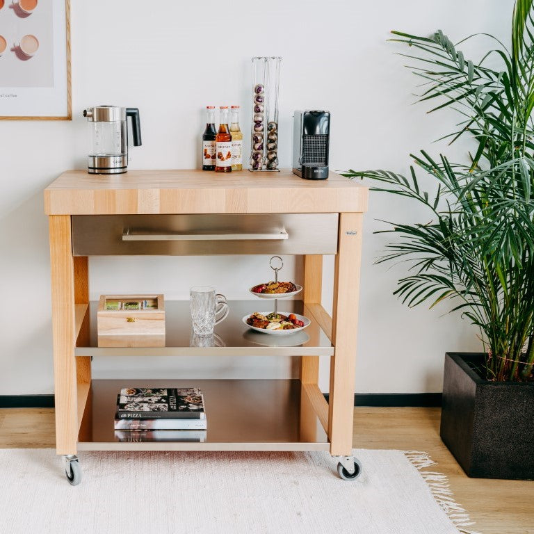 Deze robuuste trolley van Butler is gemaakt van duurzaam, gestoomd beukenhout en heeft een stoer, kopshouten bovenblad van maar liefst 7 centimeter dik.
