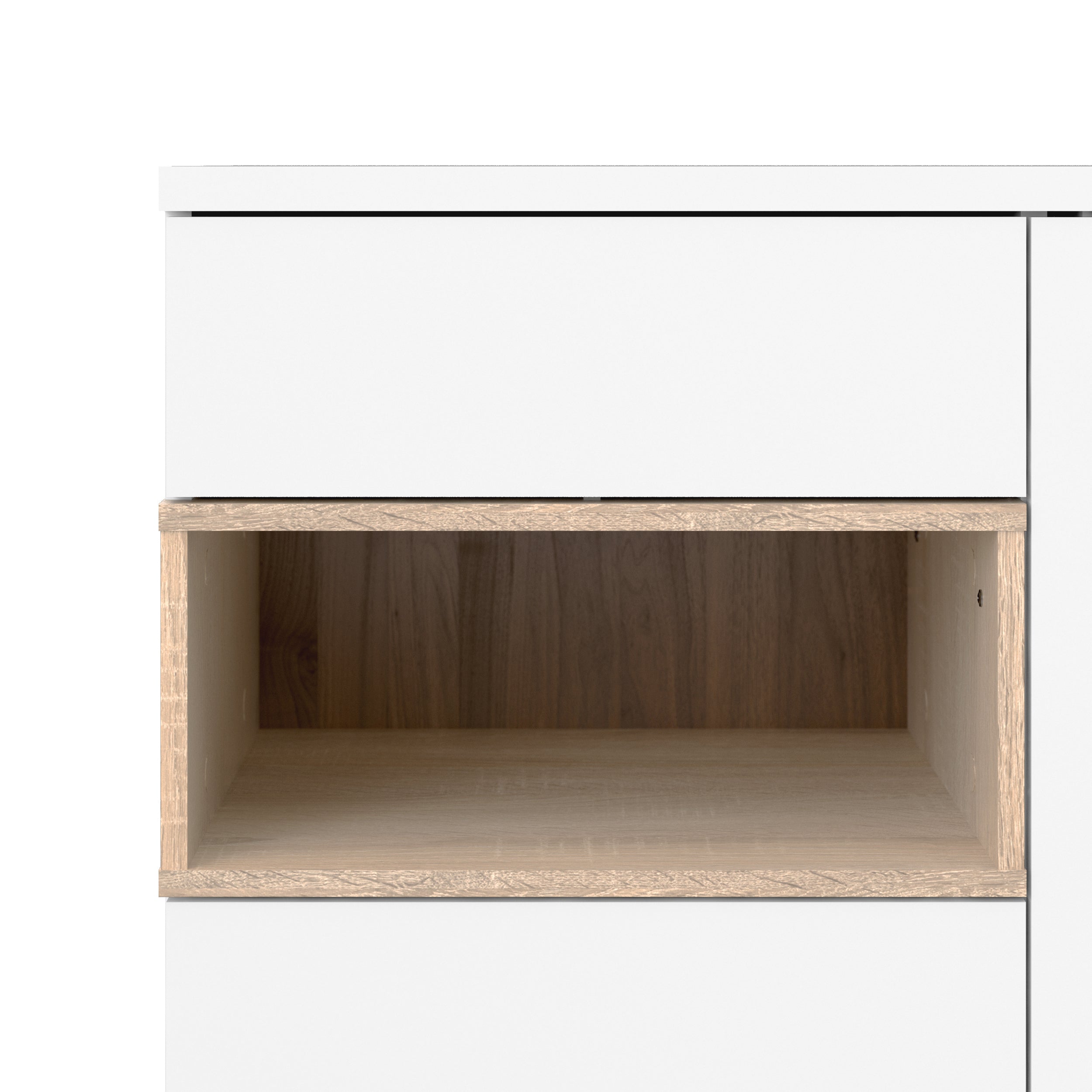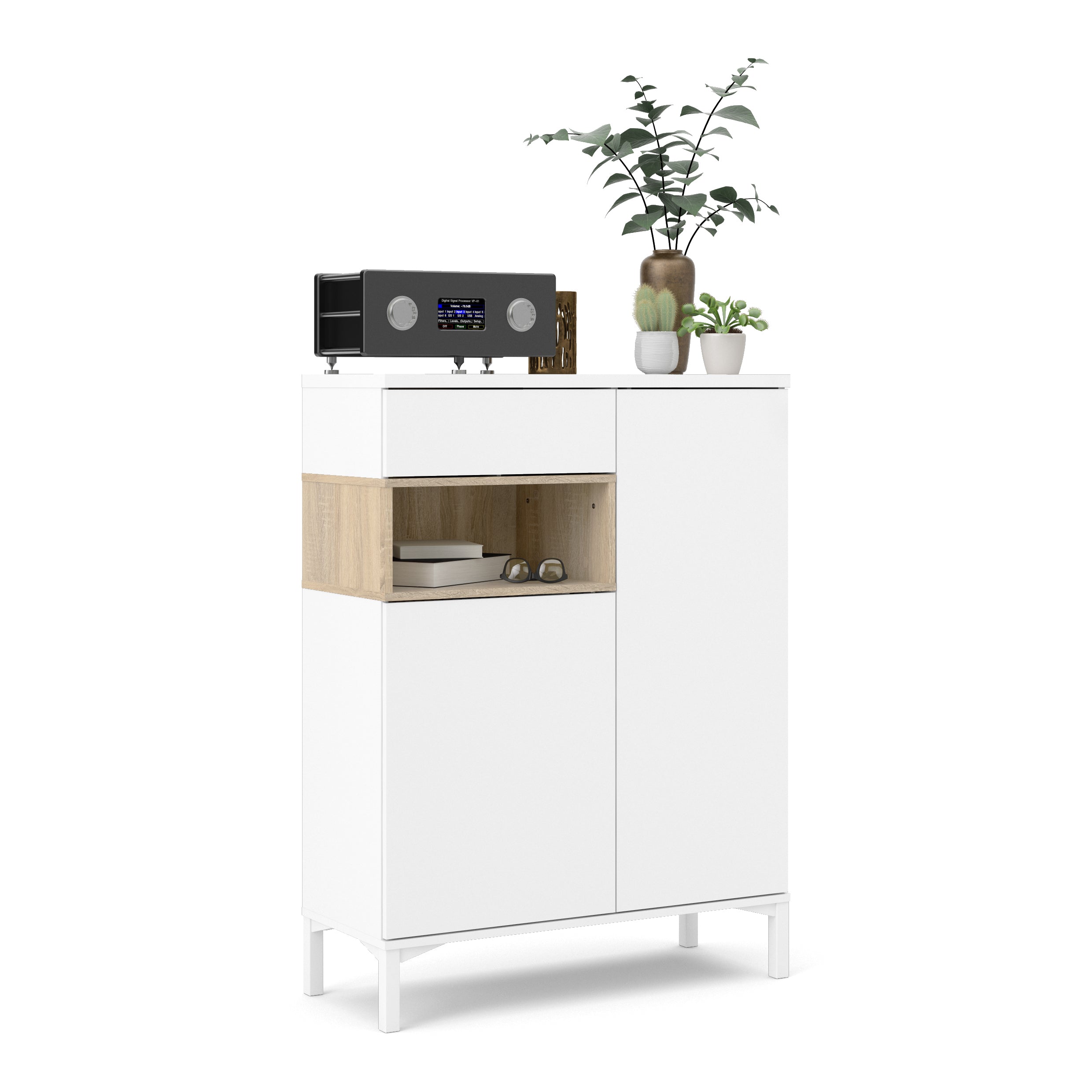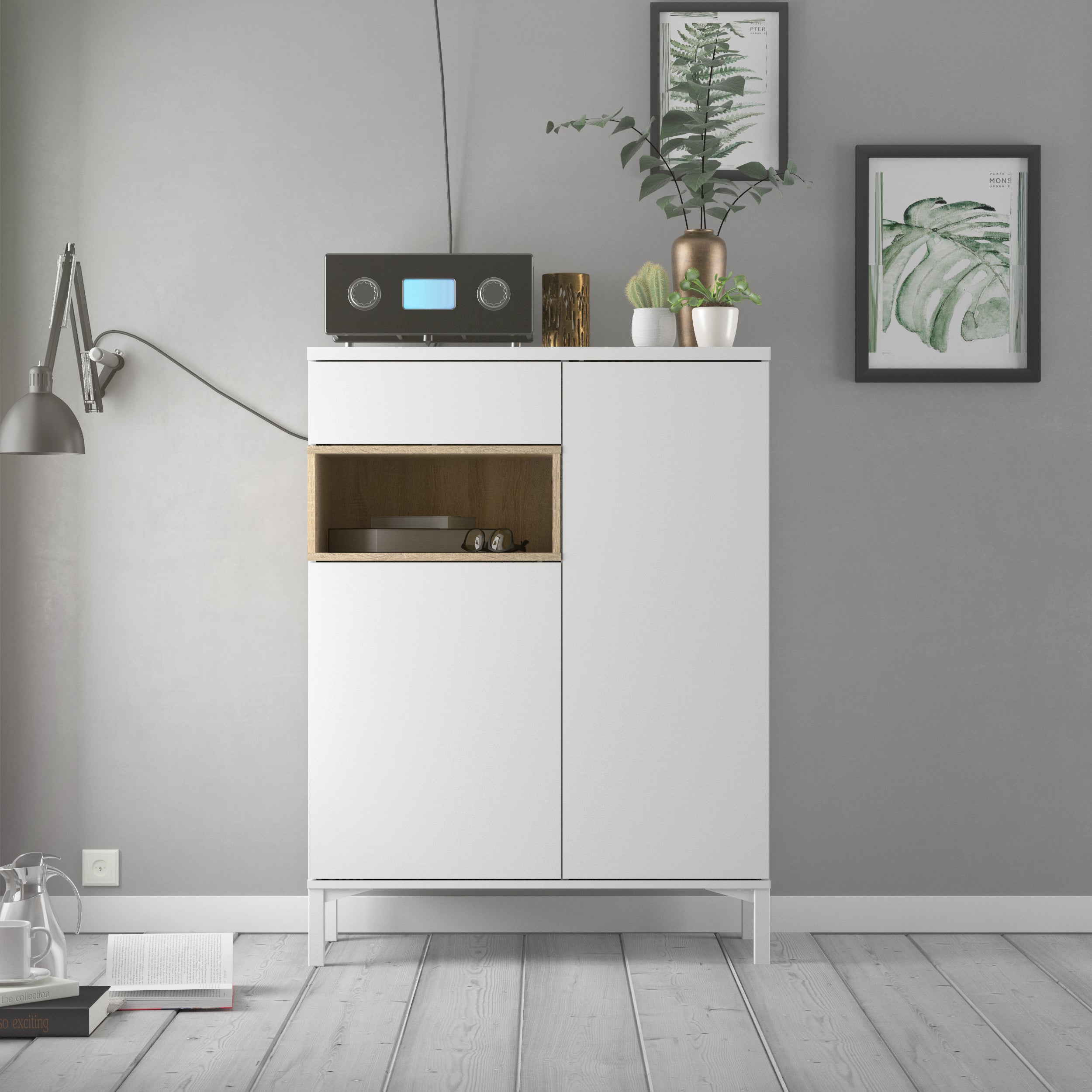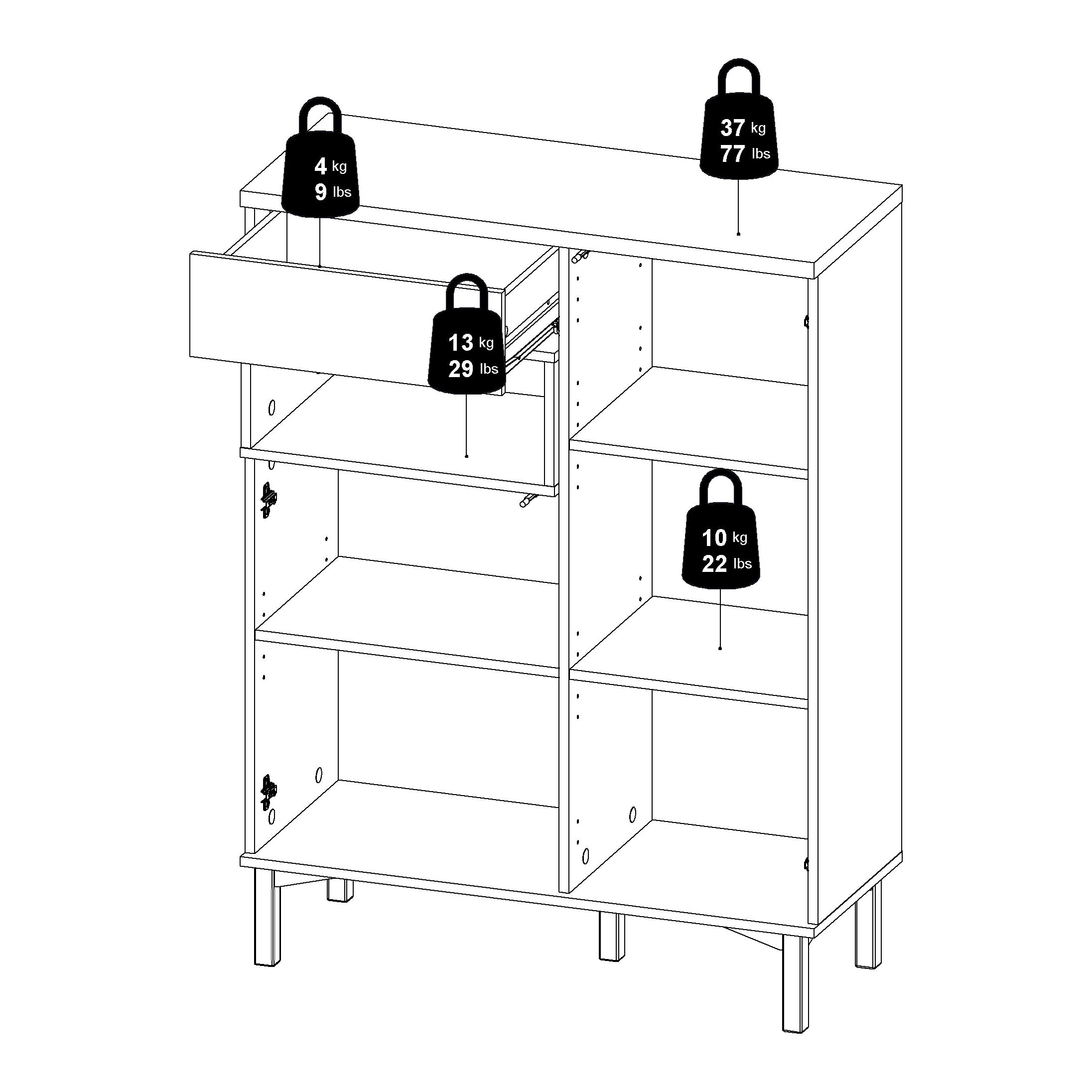 - De kast heeft één lade en zes opbergvakken waarvan vijf gesloten