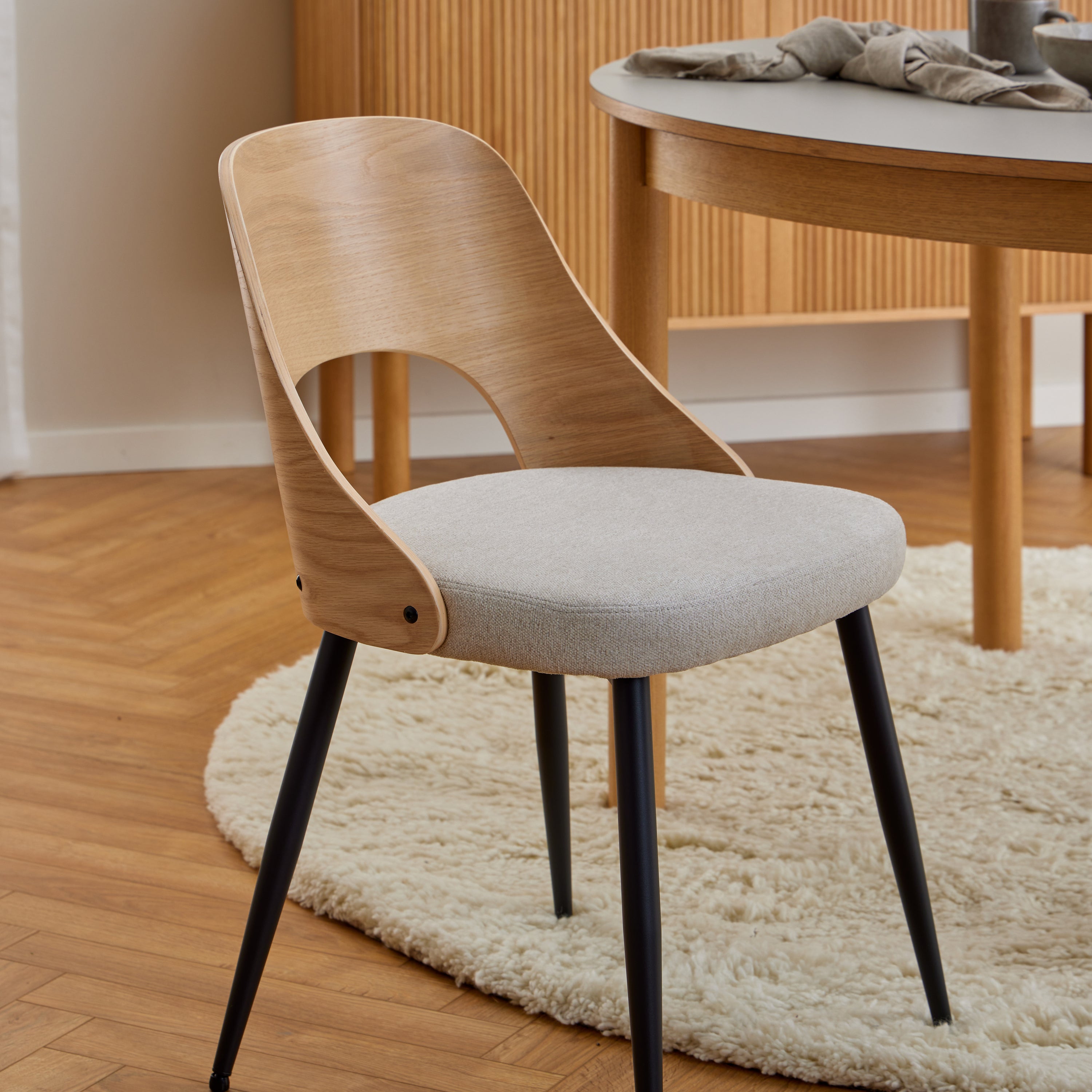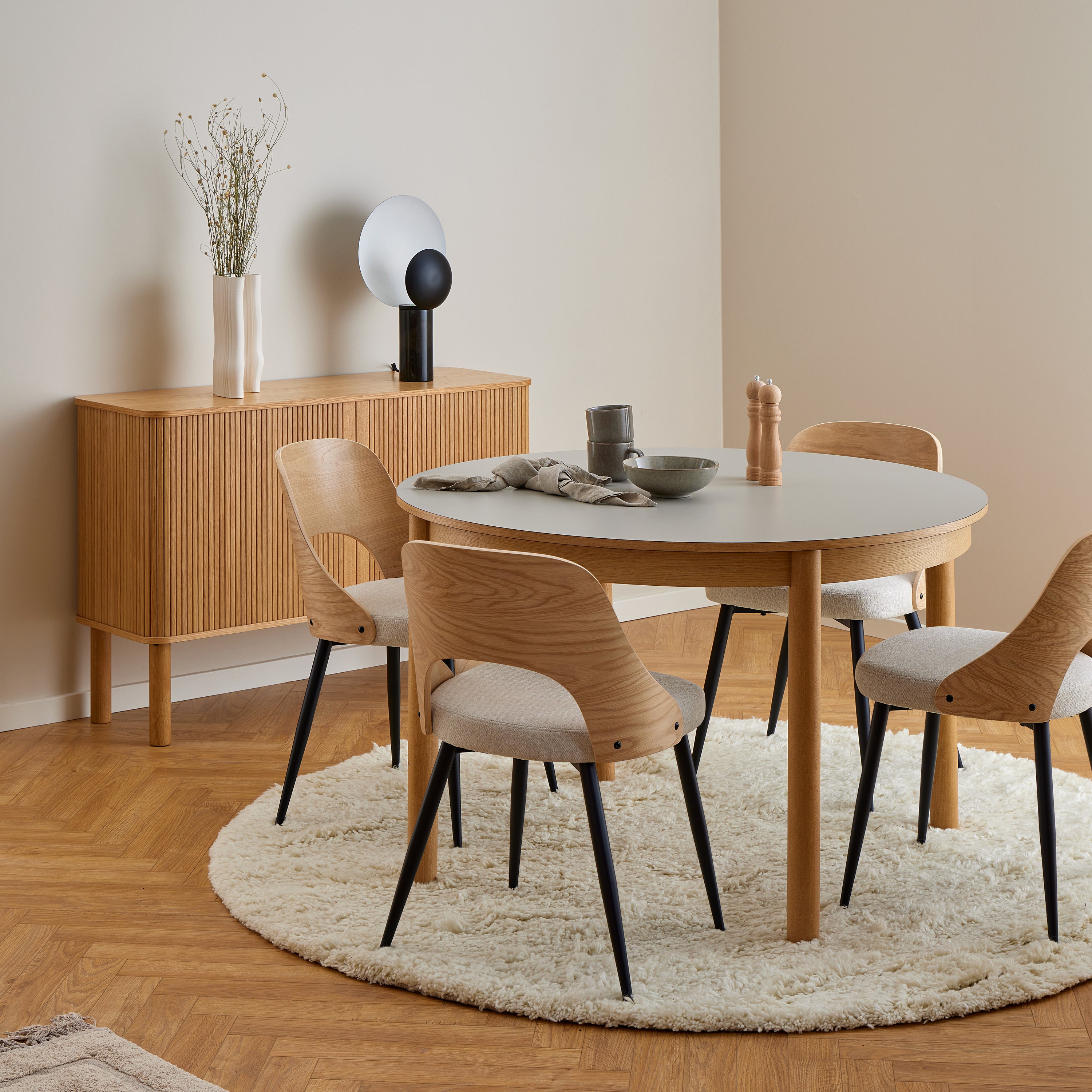 - Mooie samenstelling van: gelakt eikenfineer, chenille en gepoedercoat staal