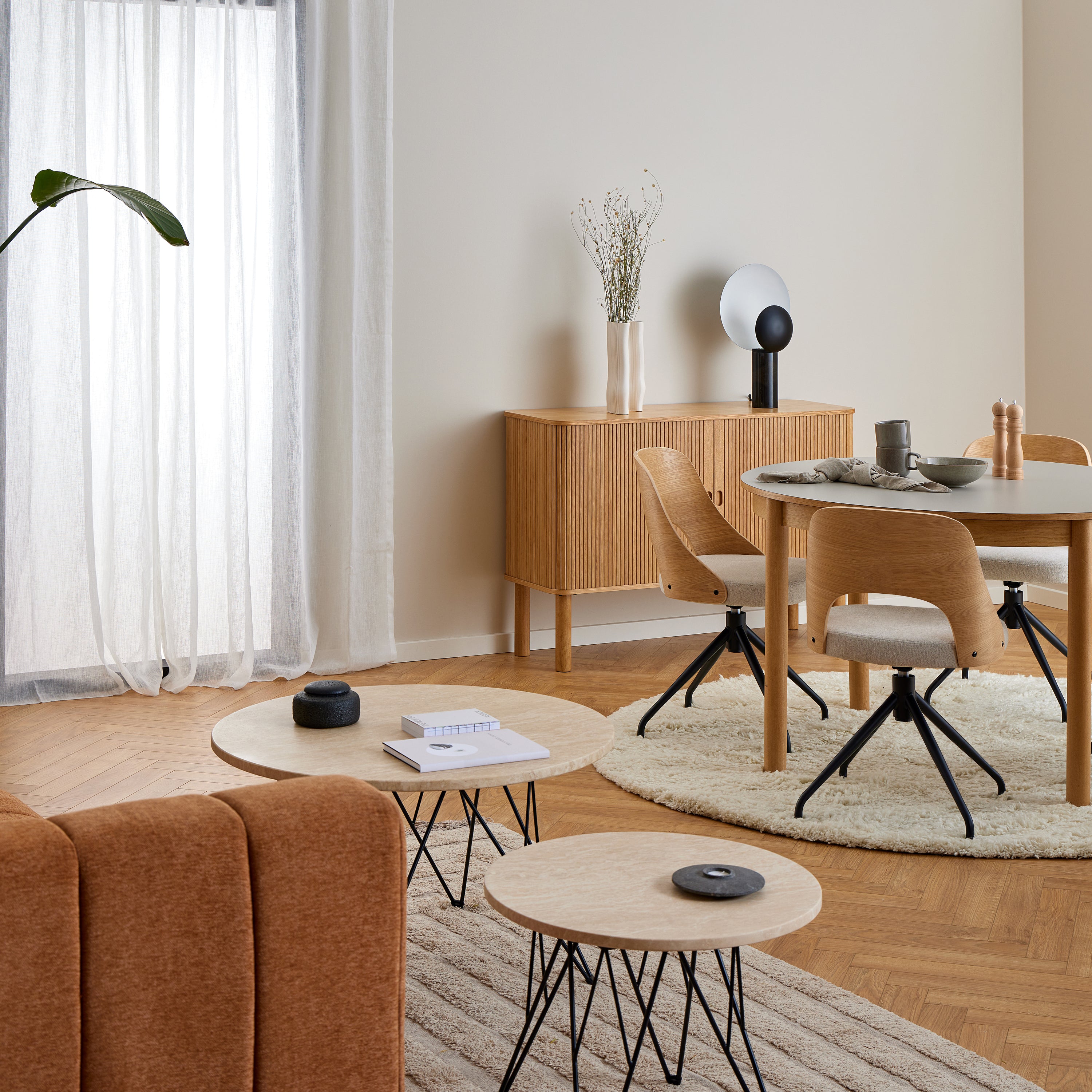 - Mooie samenstelling van: gelakt eikenfineer, chenille en gepoedercoat staal
