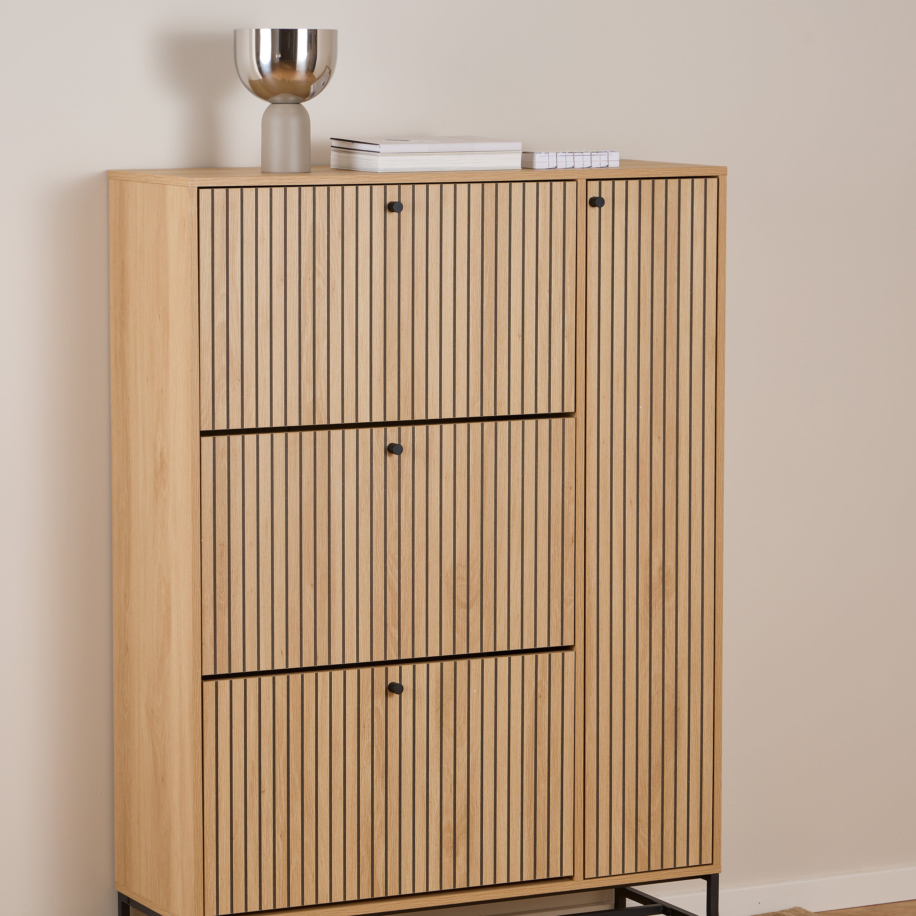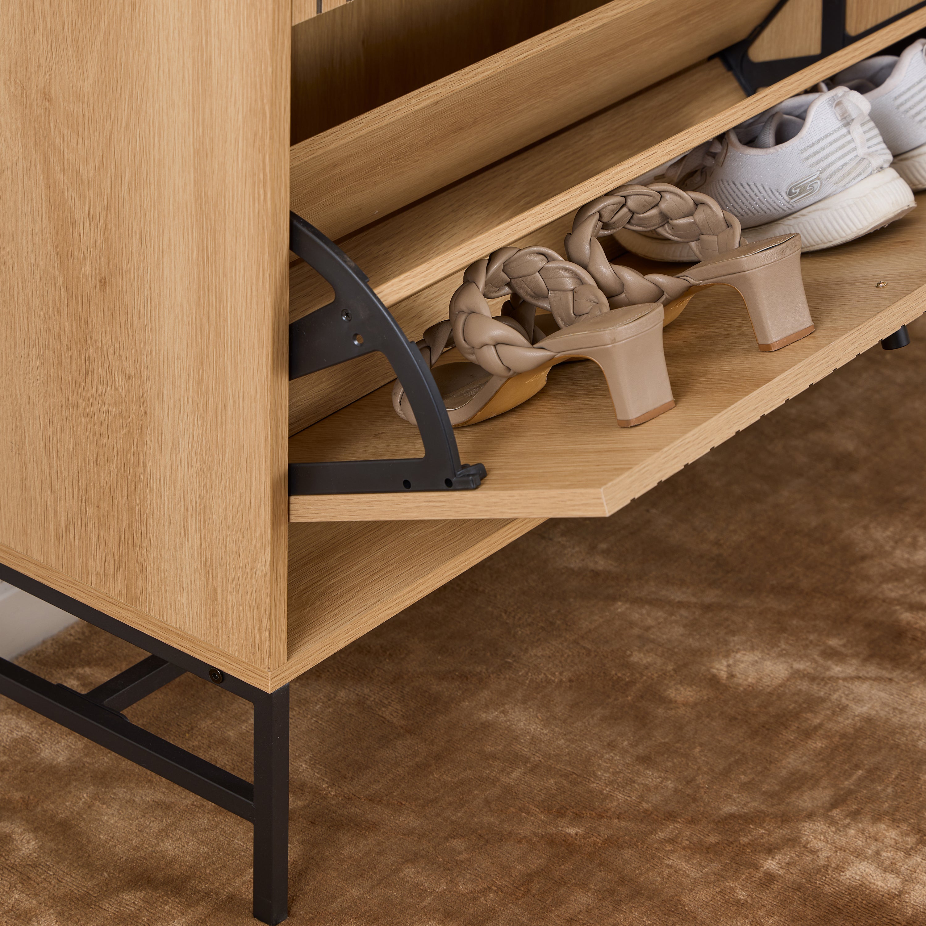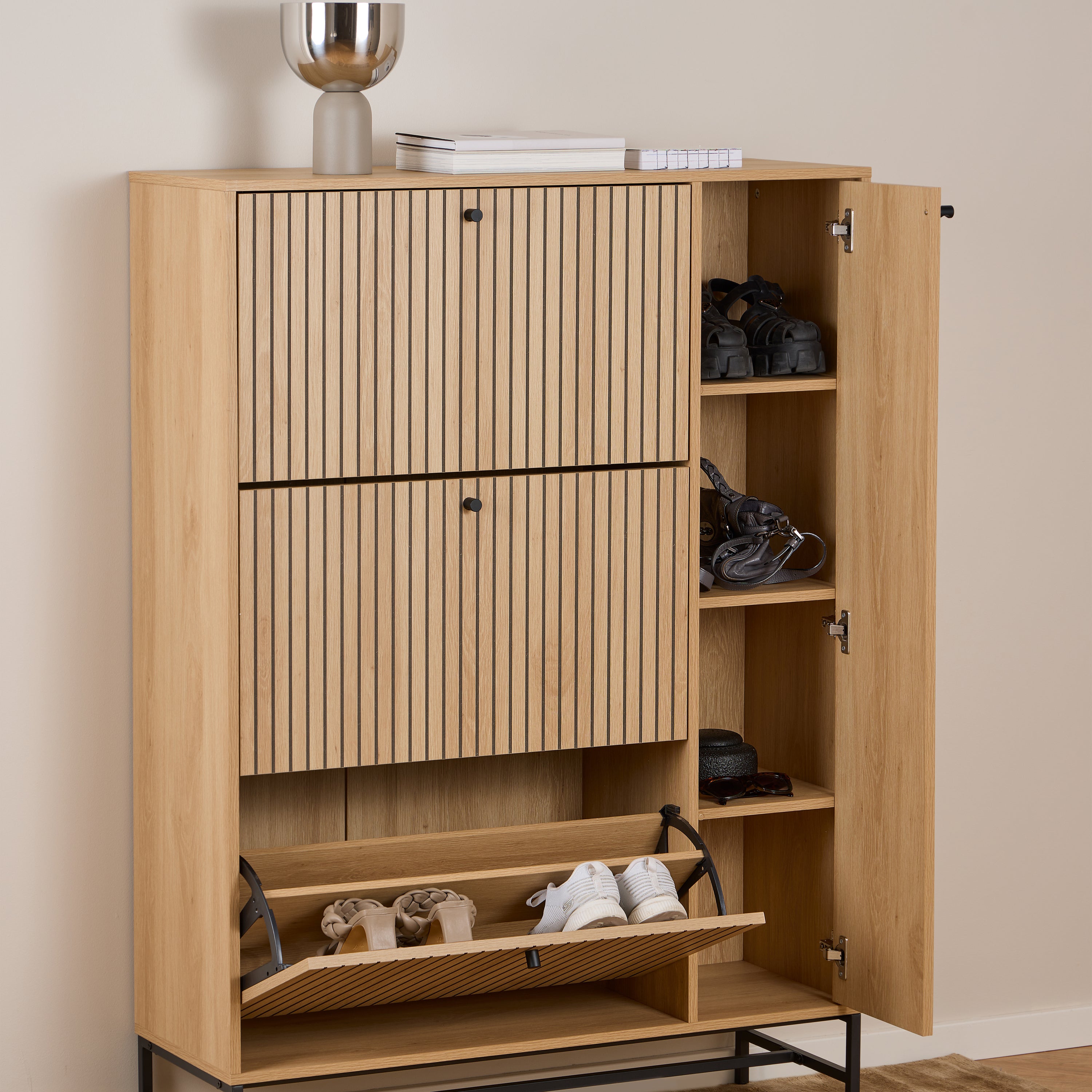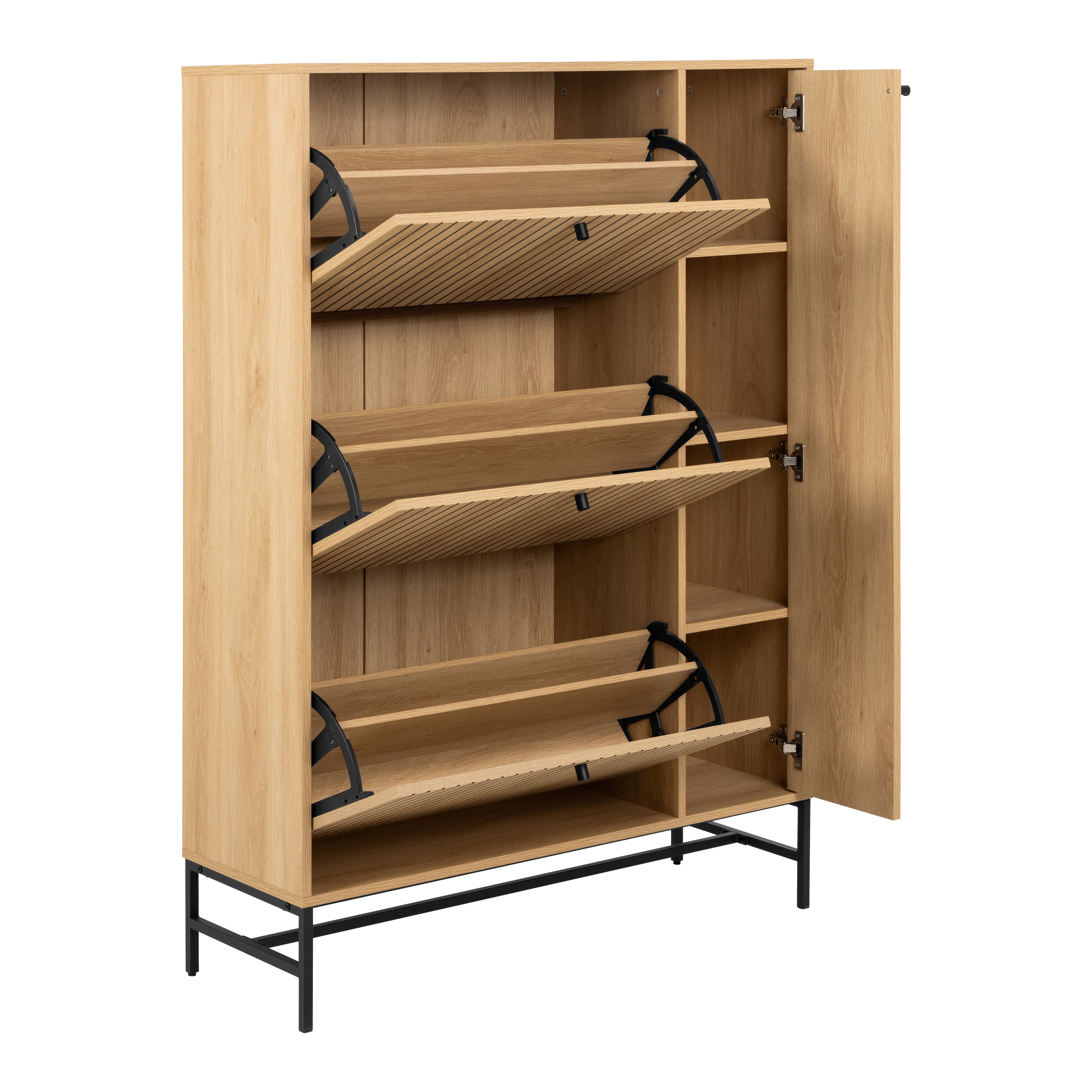 - Met drie uitklapbare lades en drie planken voor alles van schoenen tot je favoriete accessoires