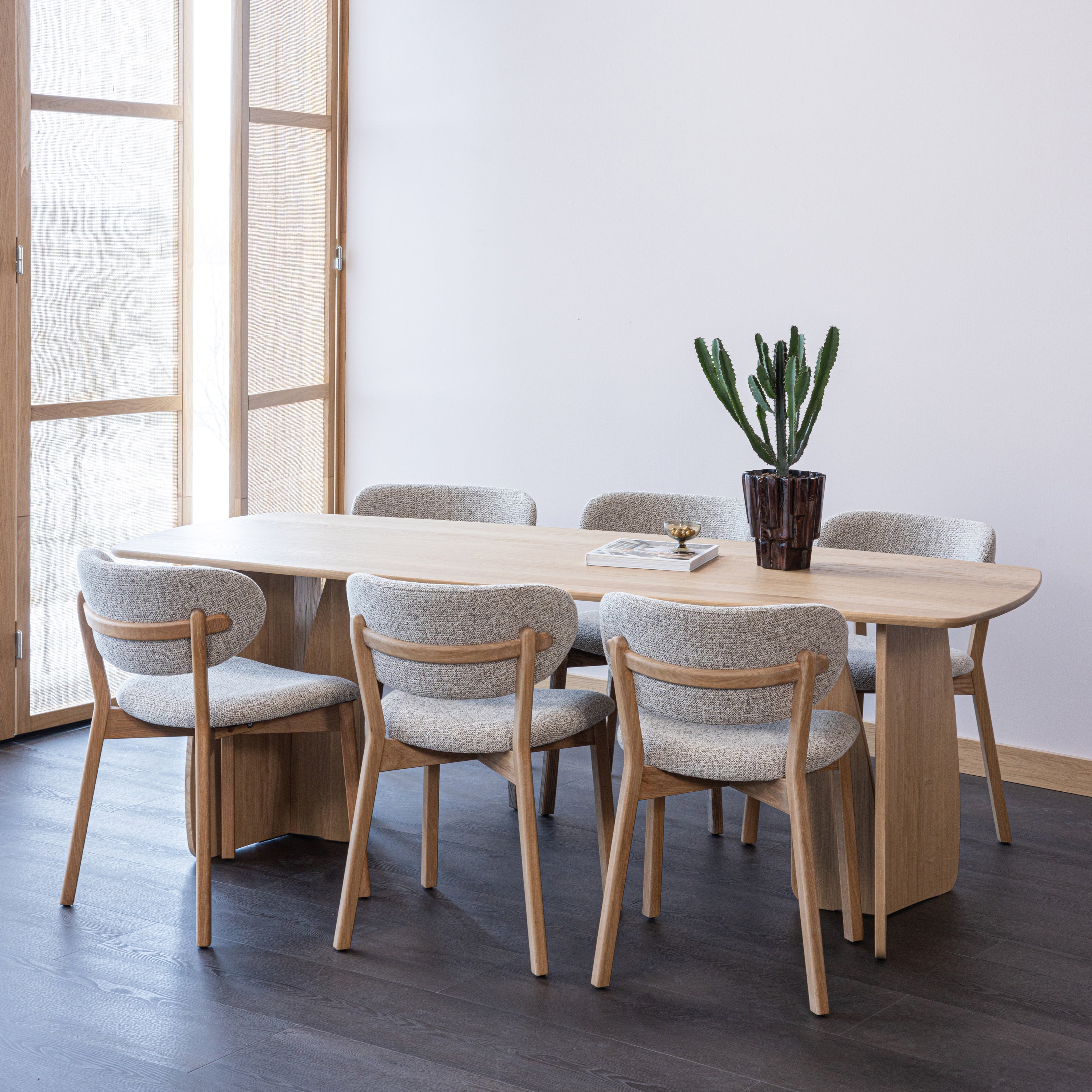Het Deens ovale tafelblad combineert het beste van twee werelden: de ruimtelijkheid van een rechthoek met de zachtheid van een ovaal. Geen harde hoeken, wel maximale zitruimte. Het organische onderstel - met zijn vloeiende lijnen en subtiele doorkijk - geeft de tafel een sculpturale uitstraling. Vanuit elke hoek een nieuw perspectief. Met 3 verschillende maten is de tafel perfect passend voor zowel compacte eetruimtes als royale woonkeukens.