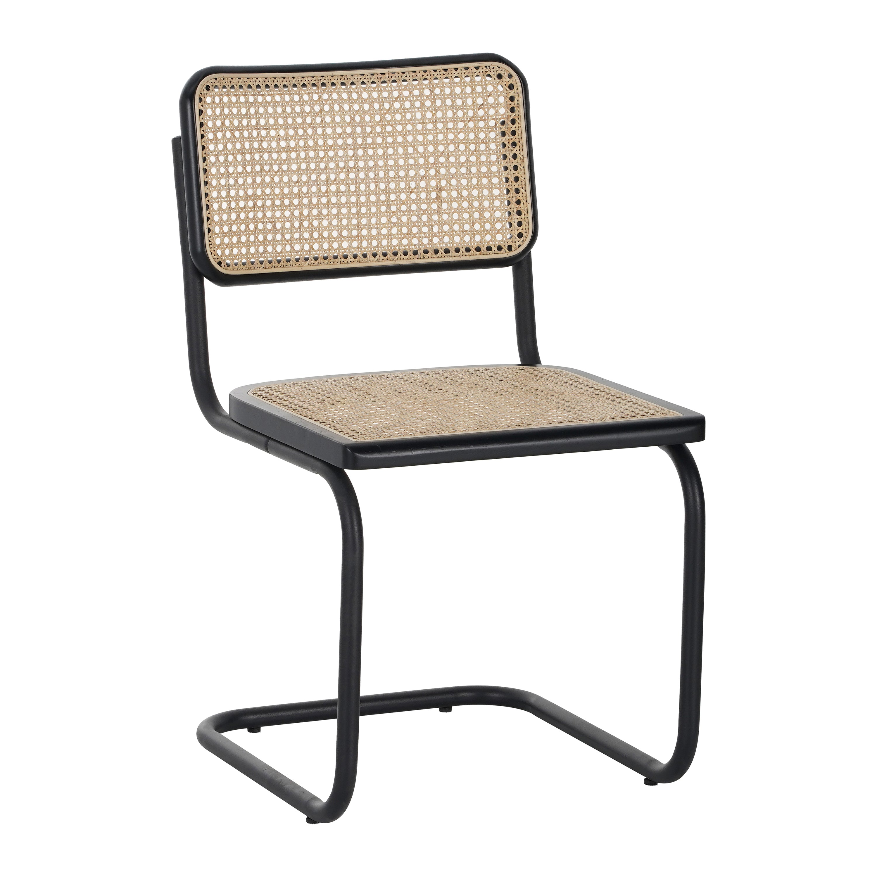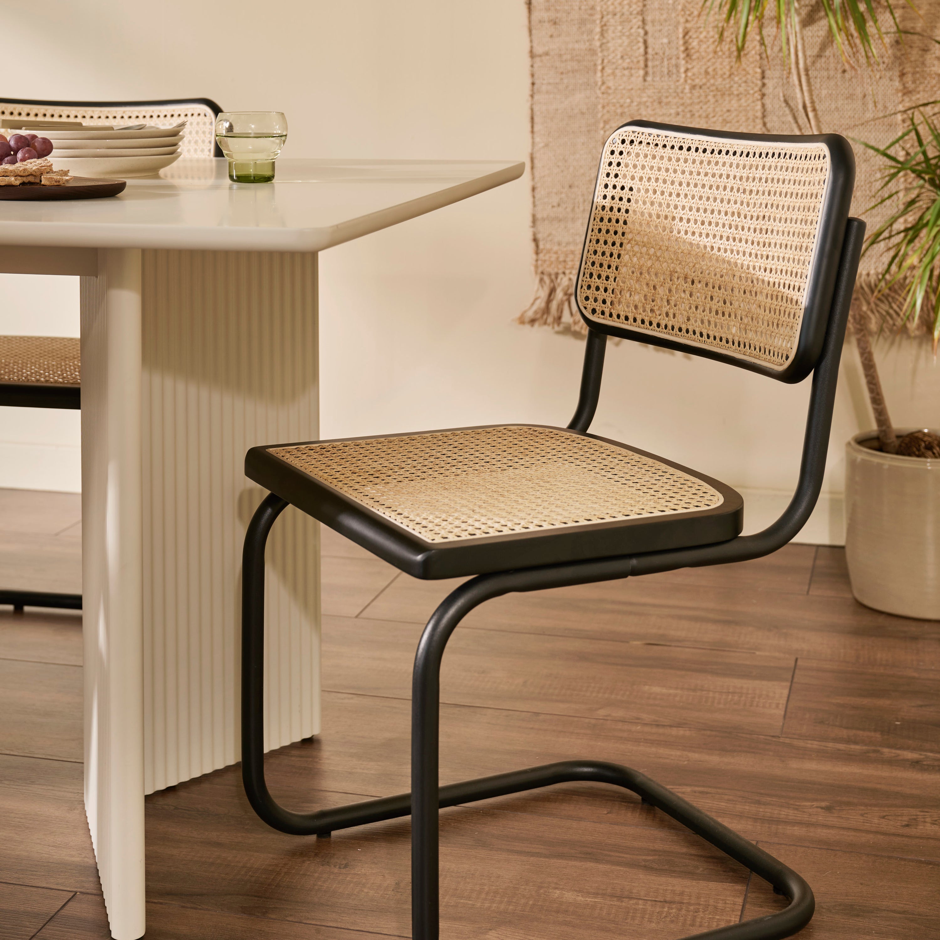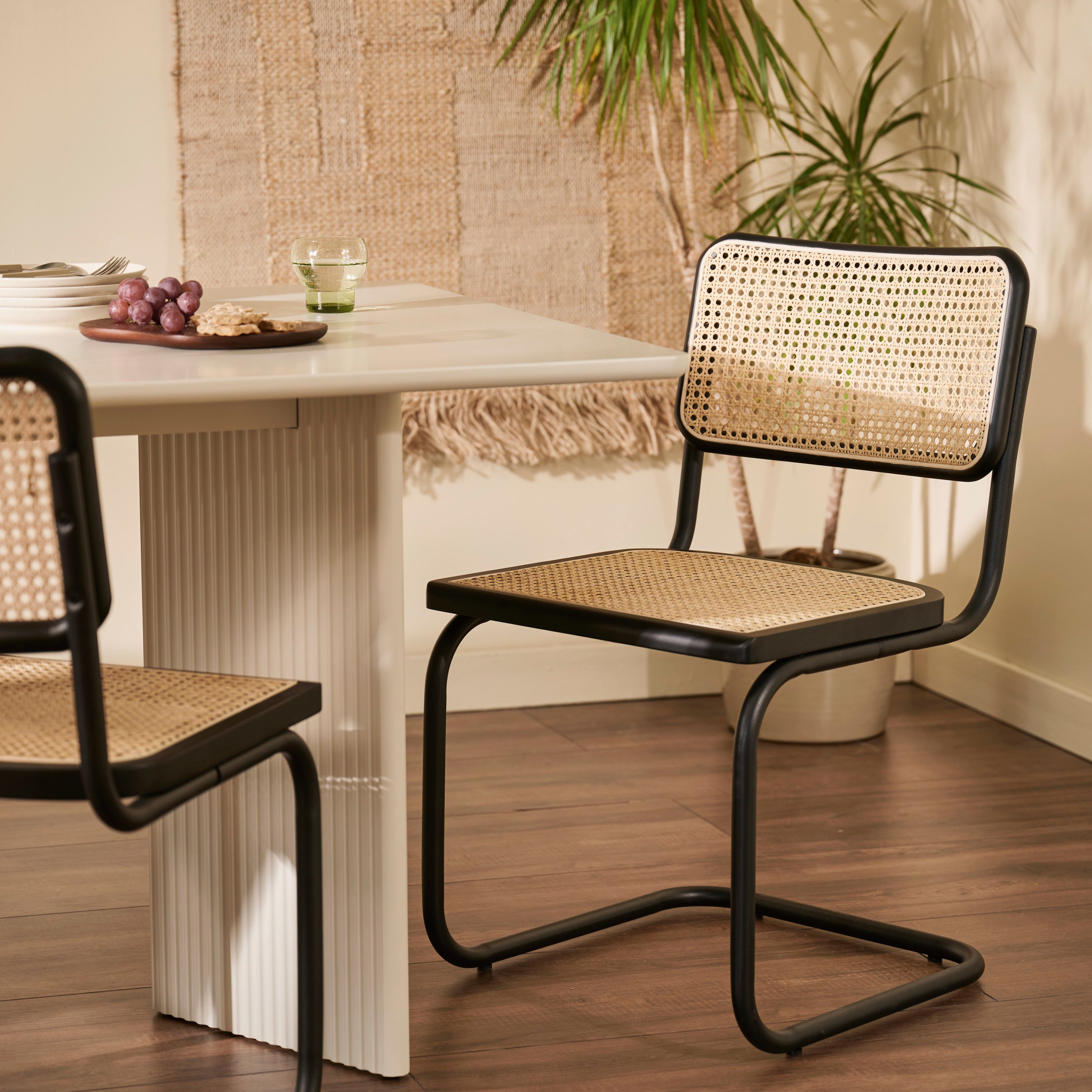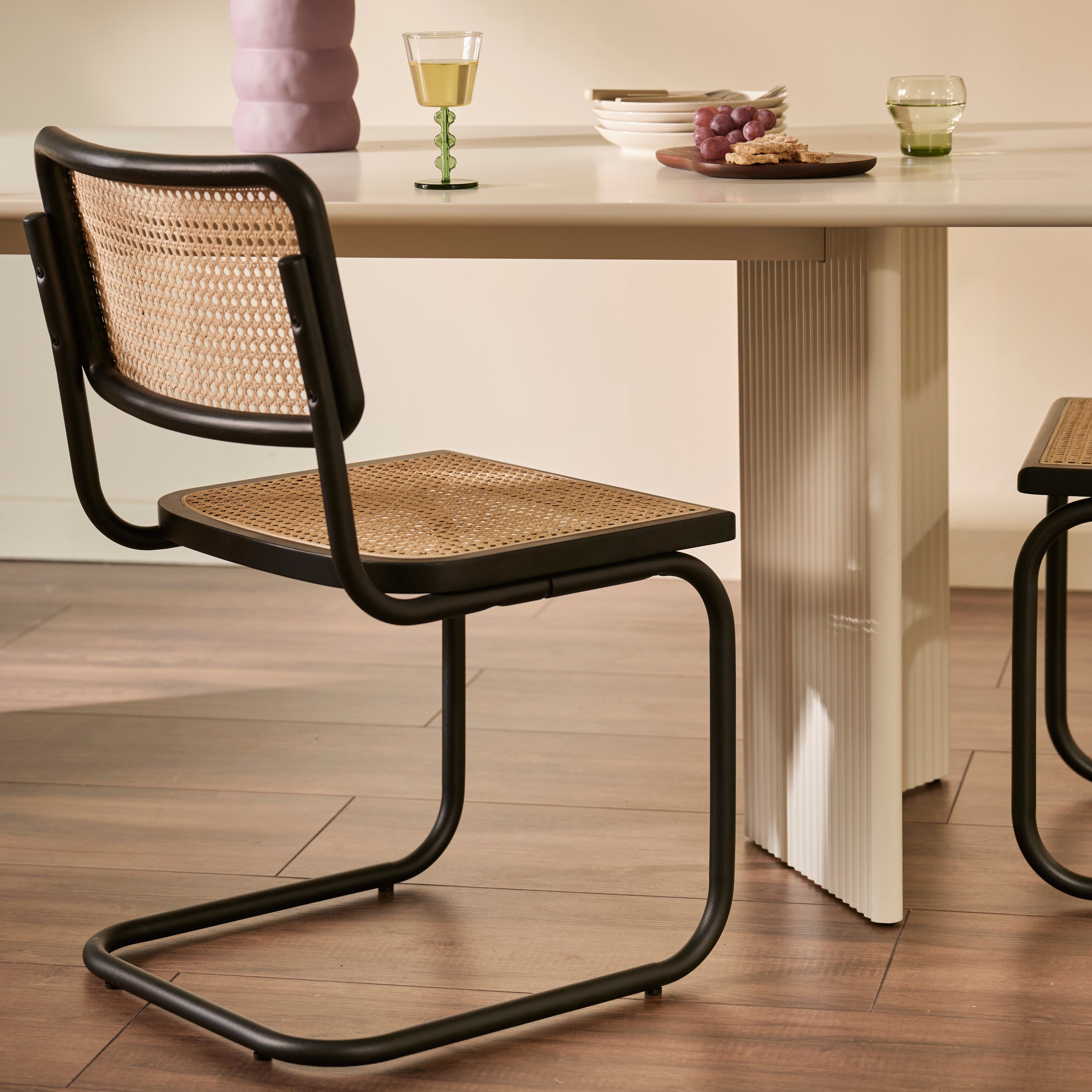 Geef je eethoek een retro touch met de Vento eetkamerstoel van by fonQ. Het geweven bamboe webbing patroon en het metalen frame creëren een stijlvolle en unieke uitstraling. Perfect voor een karaktervolle eetkamer!