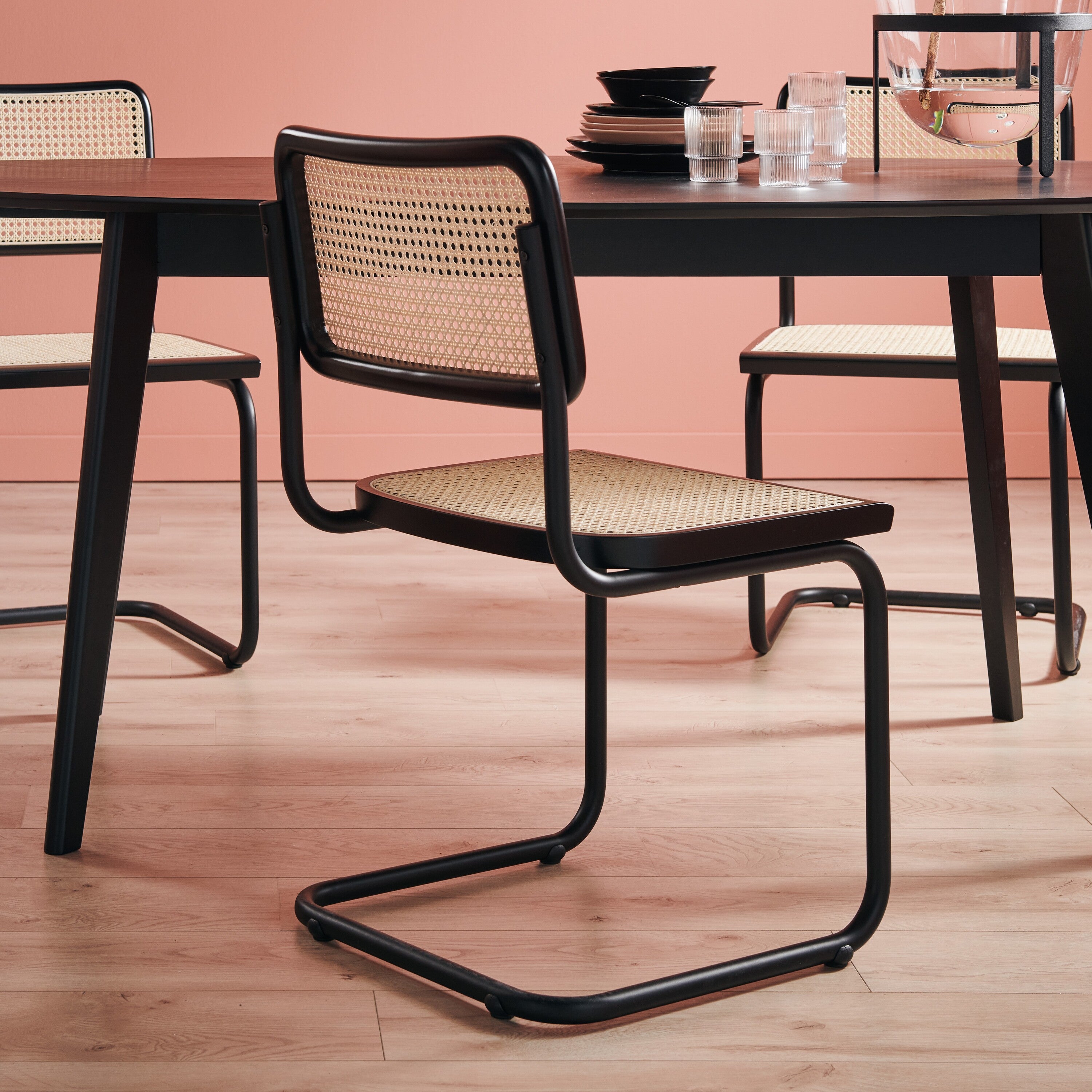 Geef je eethoek een bohemian touch met de Wave eetkamerstoel van by fonQ. Dit pareltje heeft haar looks te danken aan het geweven webbing patroon van bamboe. Het contrast van het lichte hout en het zwarte frame maakt de stoel helemaal af. Mooi hè!