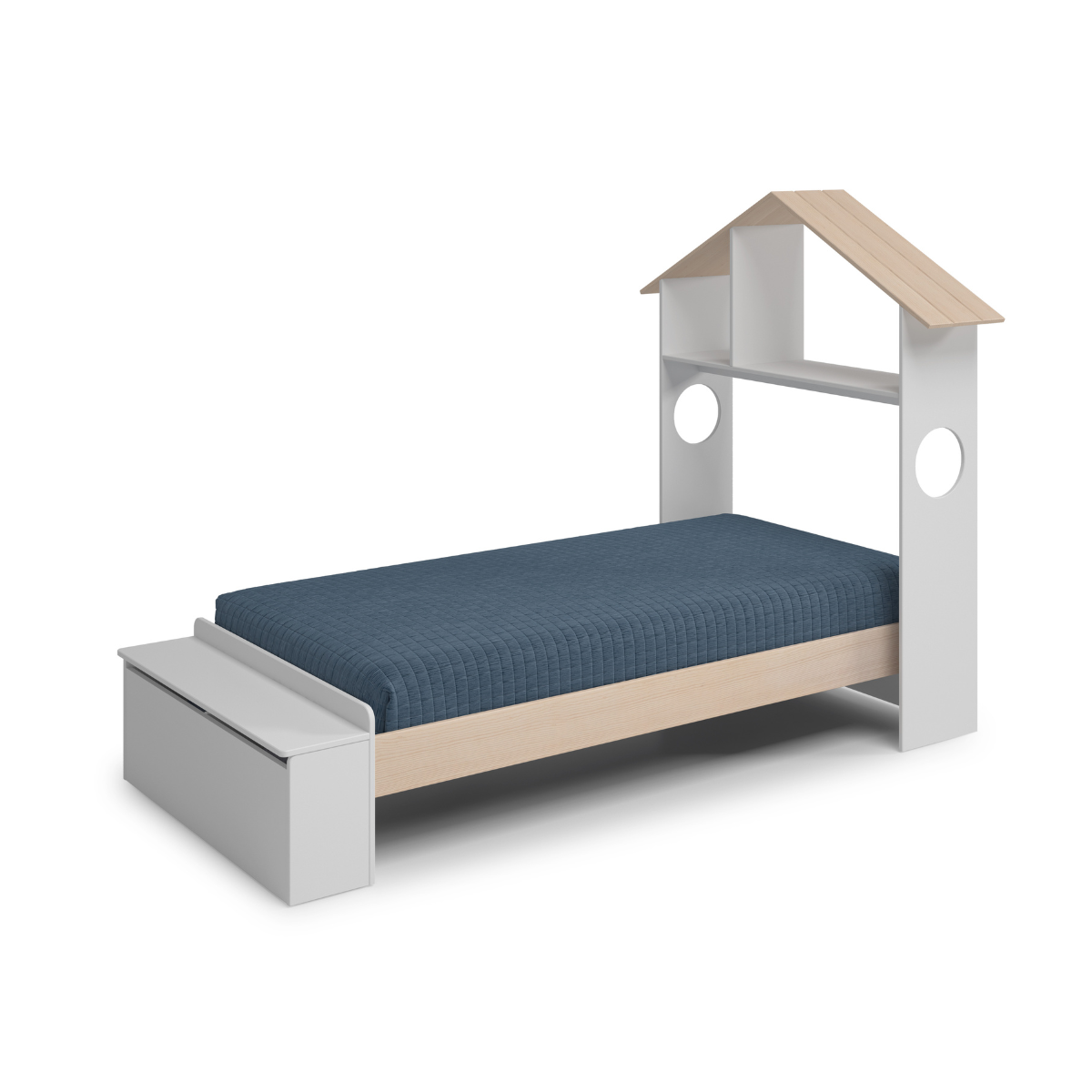 - Bed met origineel hoofdbord in de vorm van een huis en geïntegreerde planken.
