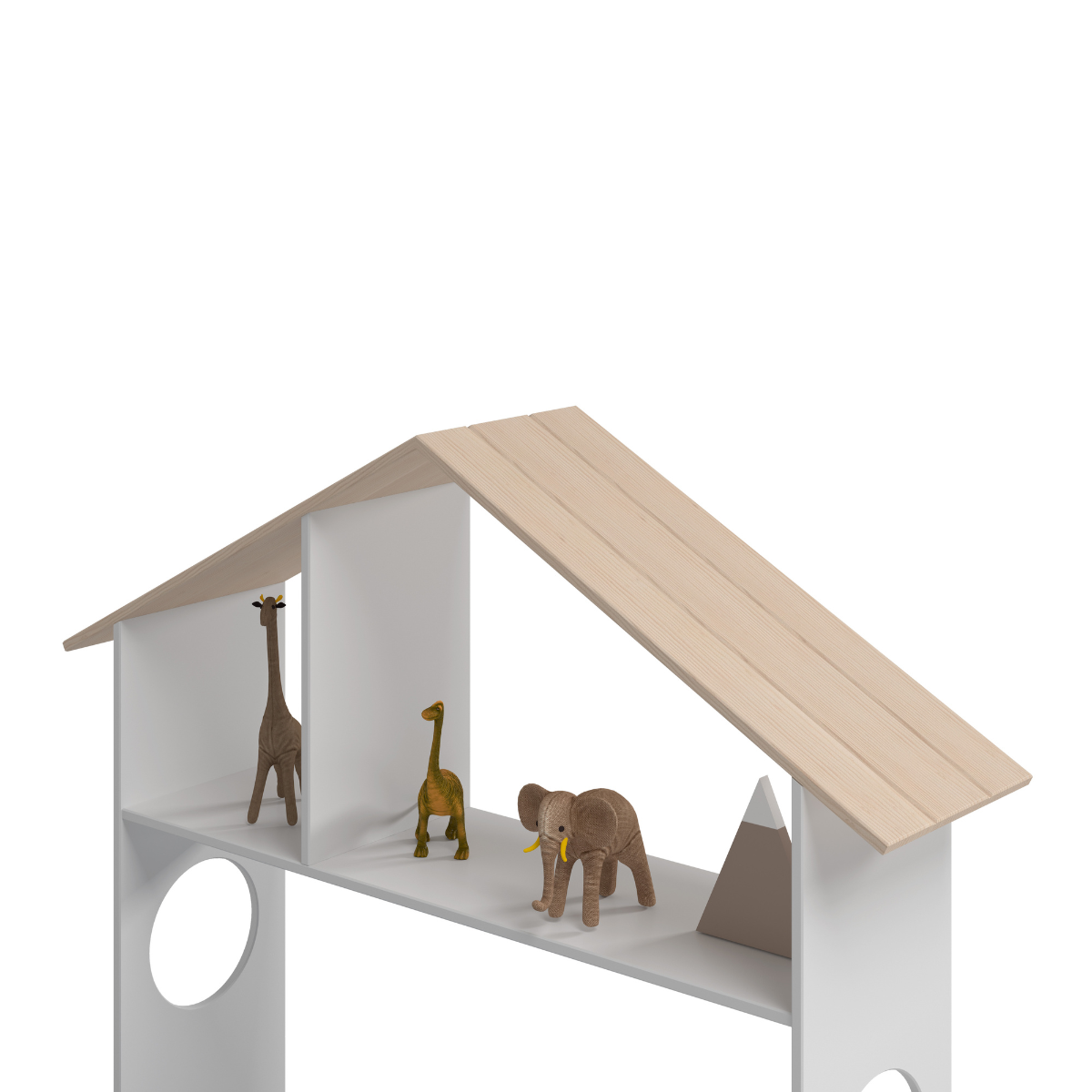 - Bed 90x190 cm met hoofdbord in huisvorm en planken.