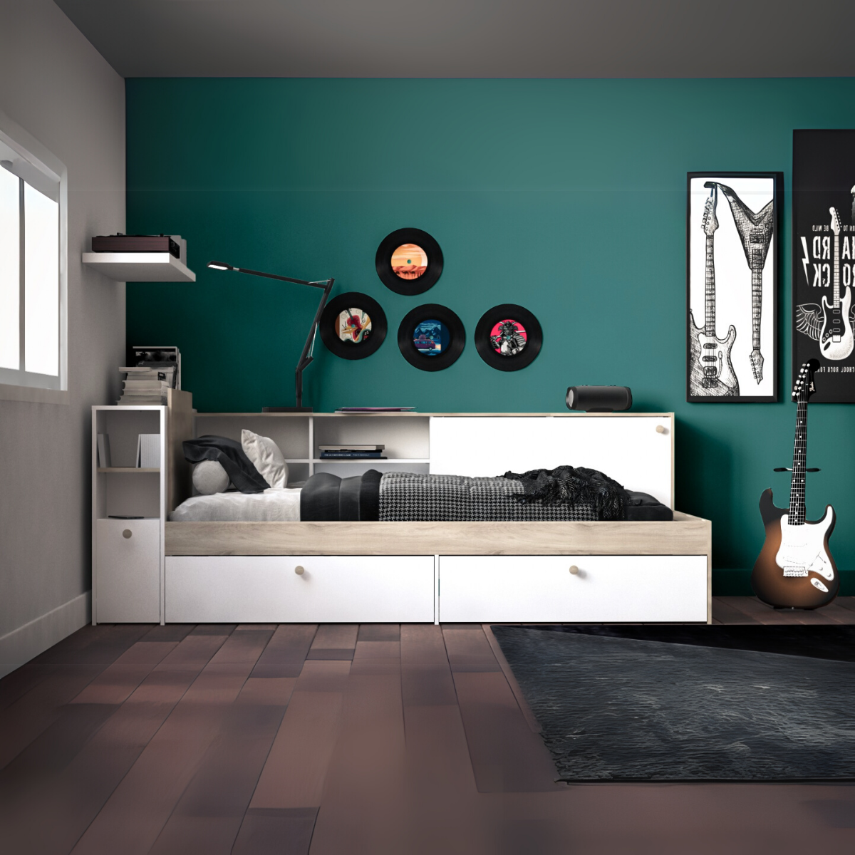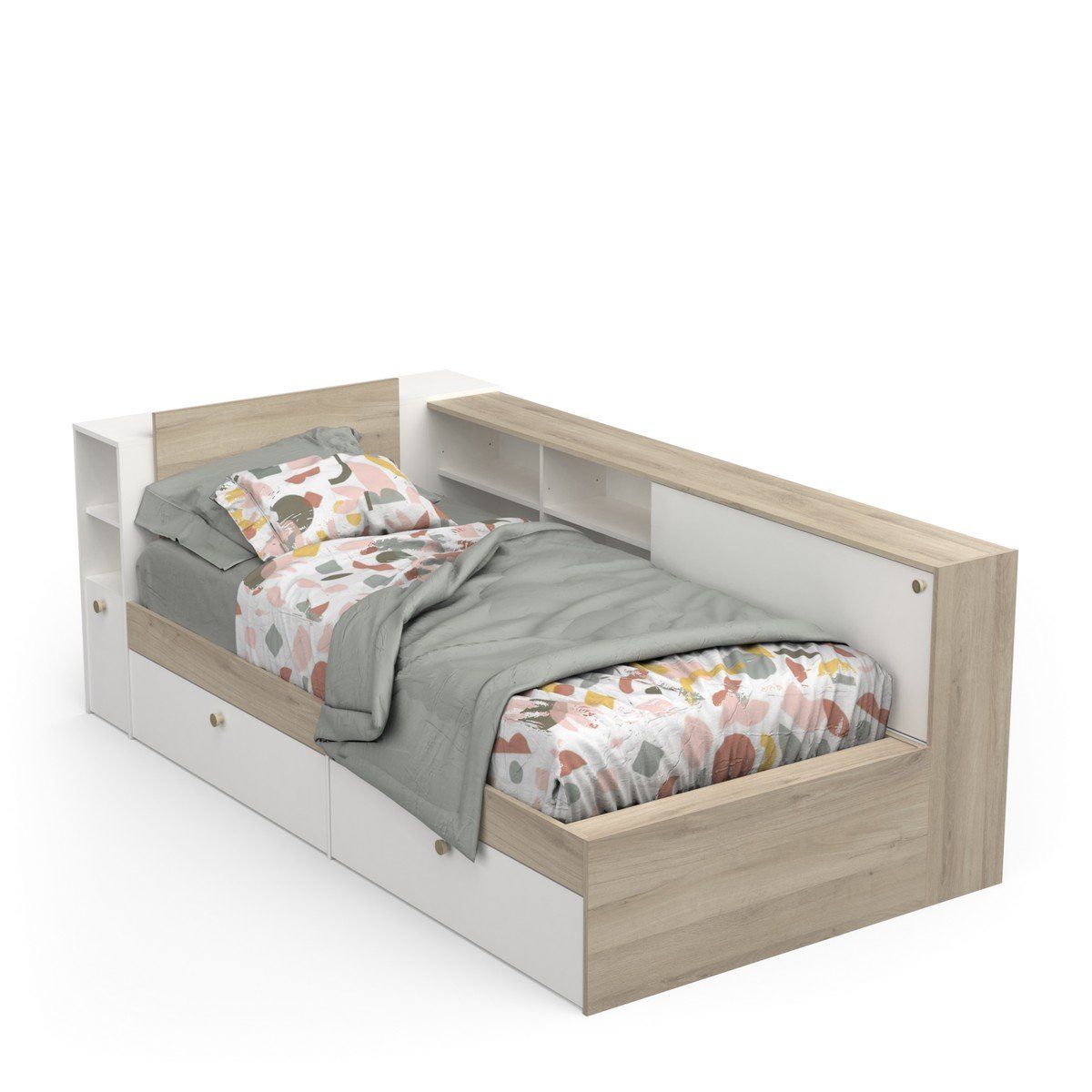 Ontdek ons Bed met opbergruimte in 90x190/200 cm - L119,2 cm, ideaal voor extra opbergruimte in de slaapkamer van uw kind. Dit bed stelt u in staat om uw spullen op te bergen. De vele opbergmogelijkheden maken dit bed ook geschikt voor andere toepassingen zoals een nachtkastje. Hierdoor bespaart u ruimte op de vloer. Het eigentijdse design past bij elk interieur. Productkenmerken: Decor eiken kronberg en wit / Decor eiken kronberg en mat zwart. Gemaakt van 15 en 18 mm spaanplaat. Bestaat uit een bed (zijkanten 18 mm dik, hoofd- en voeteneinde 15 mm dik), onder het bed 2 laden op geleiders (bruikbare afmetingen L 94,9 x D 33,7 x H 14,6 cm maximale belasting 9 kg), een hoofdeinde met 2 vakken en vaste plank maximale belasting 2 kg (bruikbare afmetingen L 23,7 x D 23,9 x H 21,5 cm), 1 deur en 1 groot plateau (bruikbare afmetingen L 119,2 x D 26,8 cm maximale belasting 13 kg), een zijomgeving met 4 vakken met 2 verstelbare planken op 3 niveaus (bruikbare afmetingen L 49,15 x D 20,8 x H 18,1 cm), 1 groot plateau (bruikbare afmetingen L 201,1 x D 24,2 cm maximale belasting 20 kg) en 1 schuifdeur. 4 plastic knopvormige handgrepen in kronberg kleur. Matrassen en lattenbodems zijn niet inbegrepen. Lattenbodems worden aanbevolen. Maximale belasting 100 kg. Zelf te monteren. Voor huishoudelijk gebruik. Productafmetingen: Lengte 119,2 x Breedte 229,4 x Hoogte 87,7 cm - Netto gewicht: 78,58 kg. Afmetingen pakketten: Pakket nr. 1: Lengte 40,7 cm x Hoogte 10 cm x Diepte 108 cm - Bruto gewicht: 21,5 kg. Pakket nr. 2: Lengte 51,1 cm x Hoogte 10 cm x Diepte 126,5 cm - Bruto gewicht: 26 kg. Pakket nr. 3: Lengte 26,1 cm x Hoogte 12,5 cm x Diepte 208,5 cm - Bruto gewicht: 34 kg. Totaal bruto gewicht: 81,5 kg.