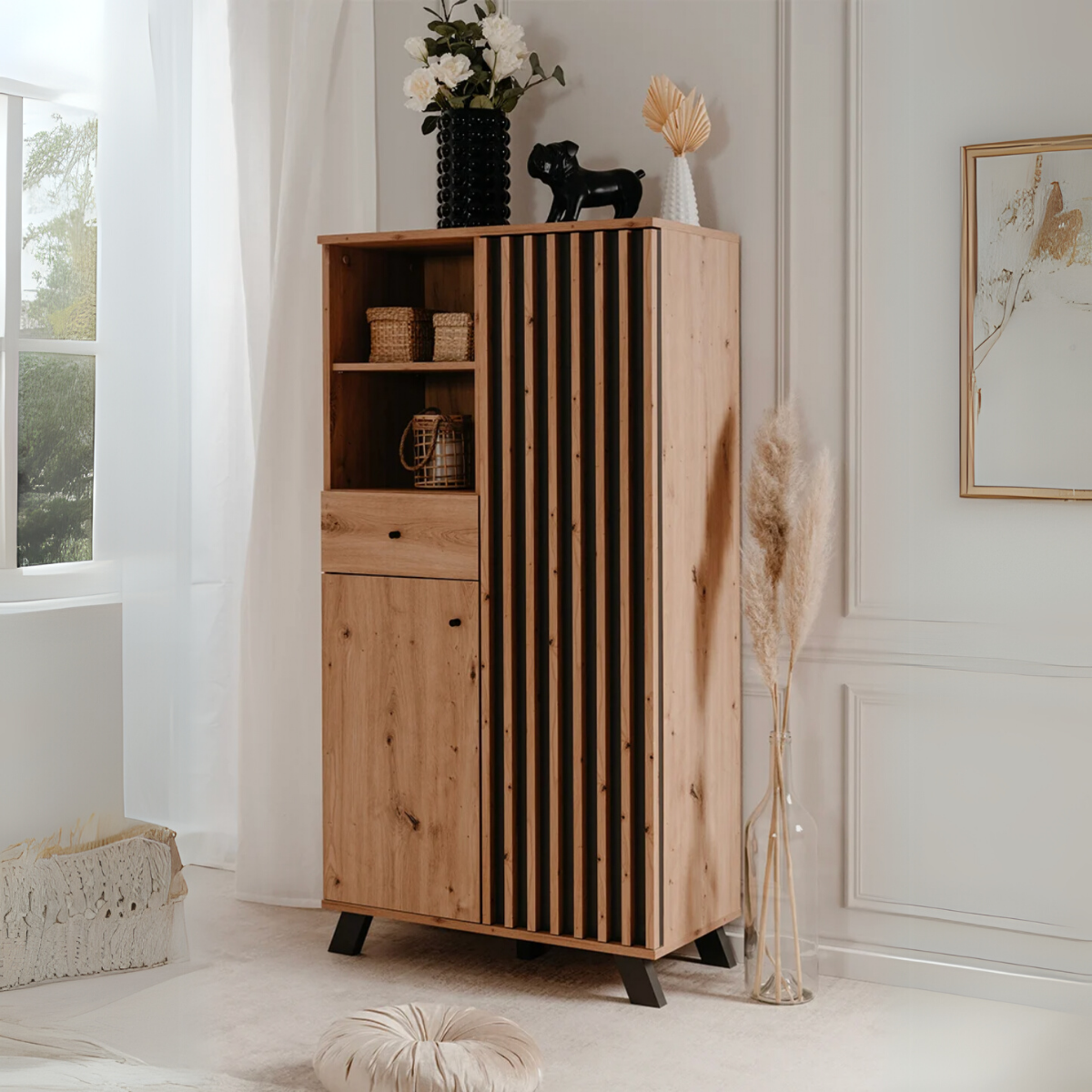 Productkenmerken: 2 deuren, 2 vakken, 1 lade. Eiken ambacht / antraciet kleur. Europese fabricage (Polen). Productafmetingen: Lengte 80 cm x Hoogte 156 cm x Breedte 40 cm. Nettogewicht: 55,9 kg. Verpakkingsafmetingen: Verpakking nr. 1: Lengte 153 cm x Hoogte 48 cm x Breedte 12 cm - Bruto gewicht: 31 kg. Verpakking nr. 2: Lengte 100 cm x Hoogte 48 cm x Breedte 14 cm - Bruto gewicht: 28,3 kg. Totaal bruto gewicht: 59,3 kg.