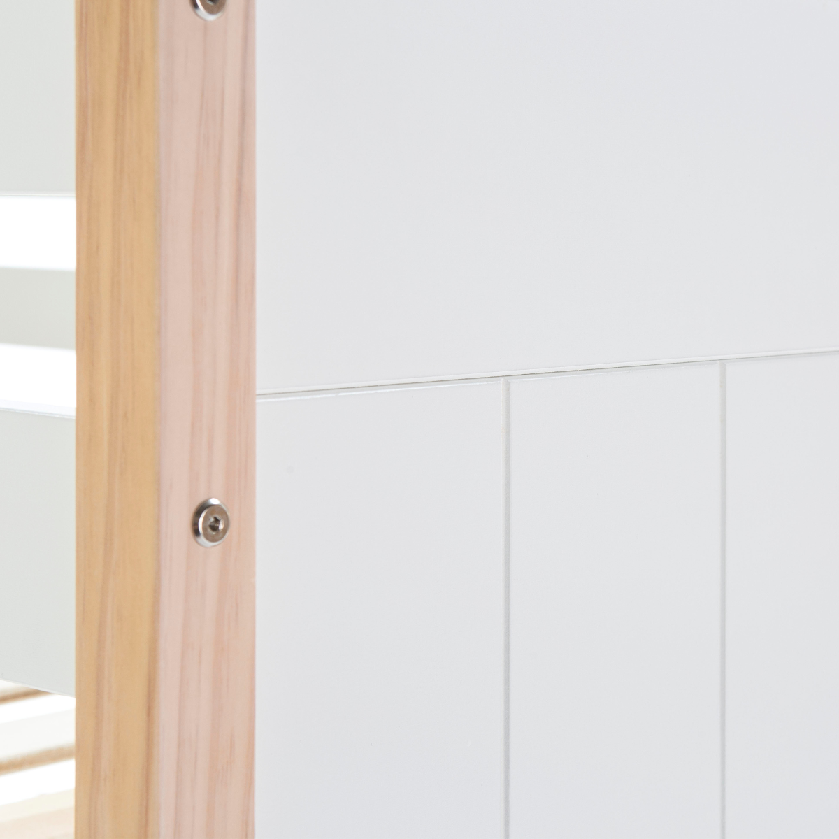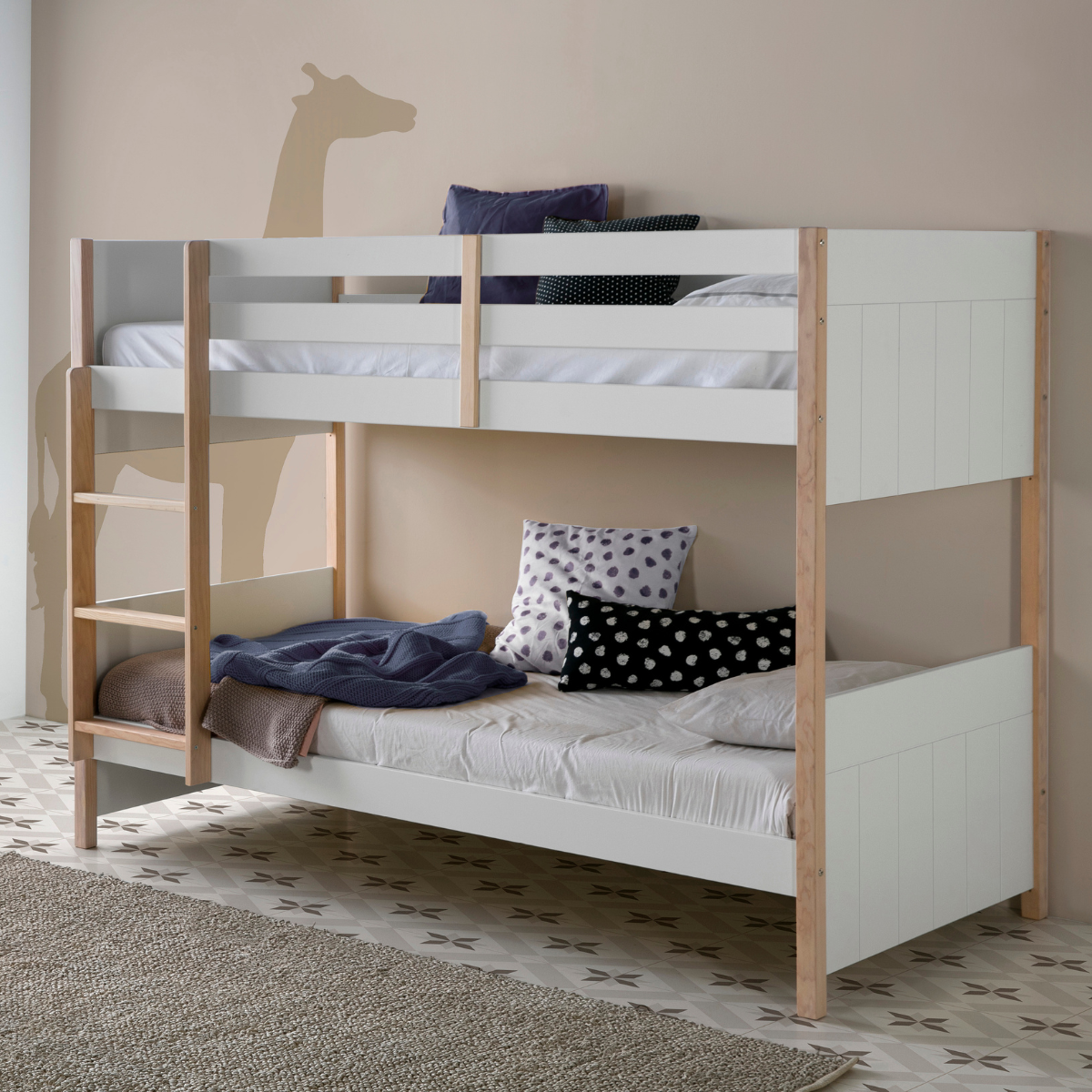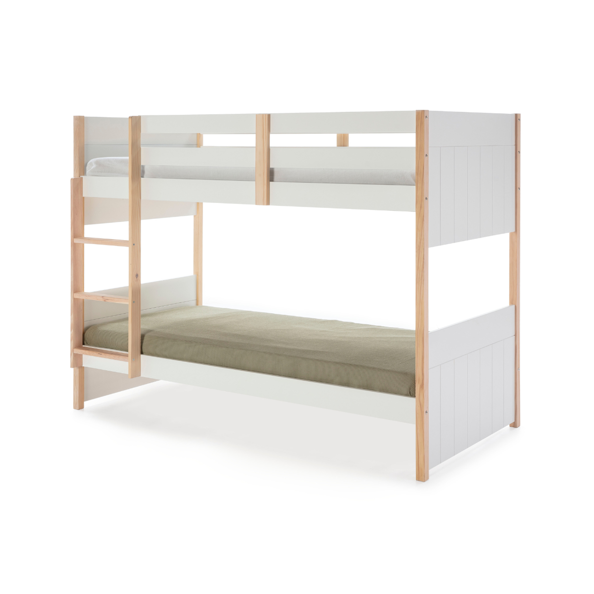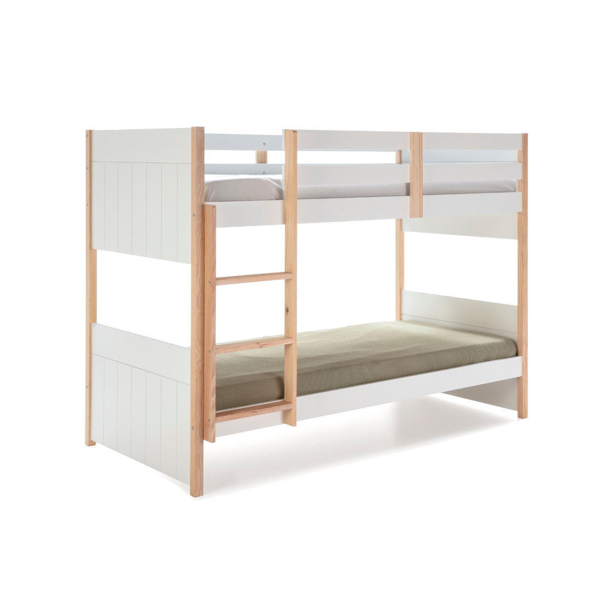 - Stapelbed met 90x190 cm slaapoppervlakken in wit gelakte en lichte houtafwerking.