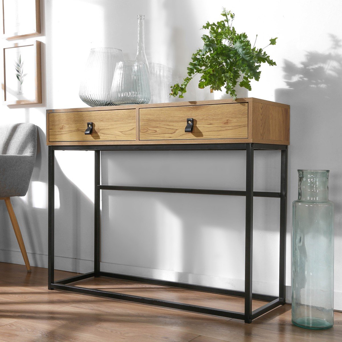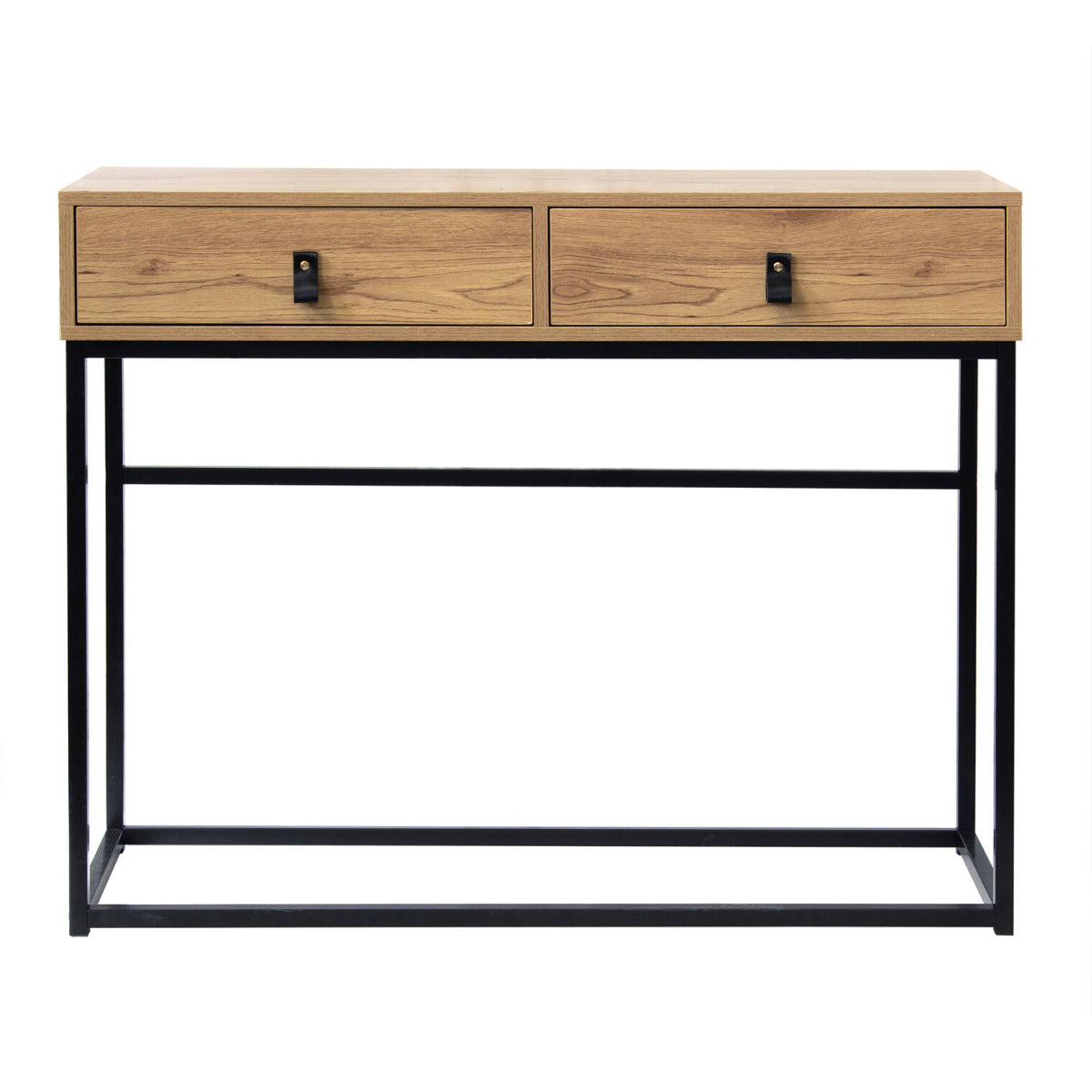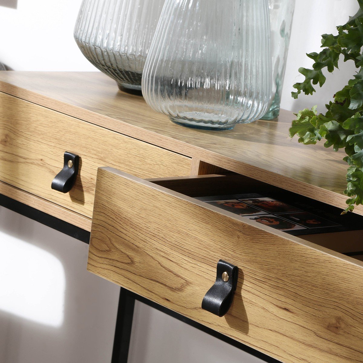 Ben je op zoek naar een stijlvolle console voor je woonkamer of hal? Ontdek deze console met 2 laden en metalen poten, eikenkleurig.