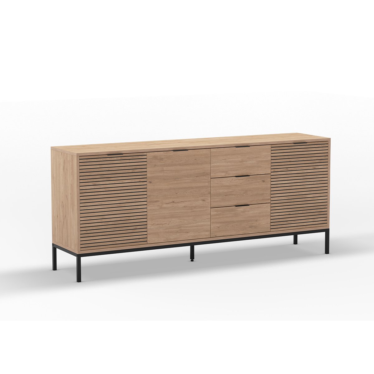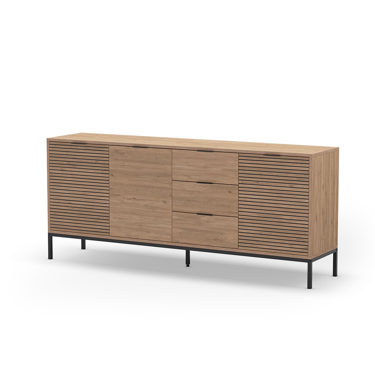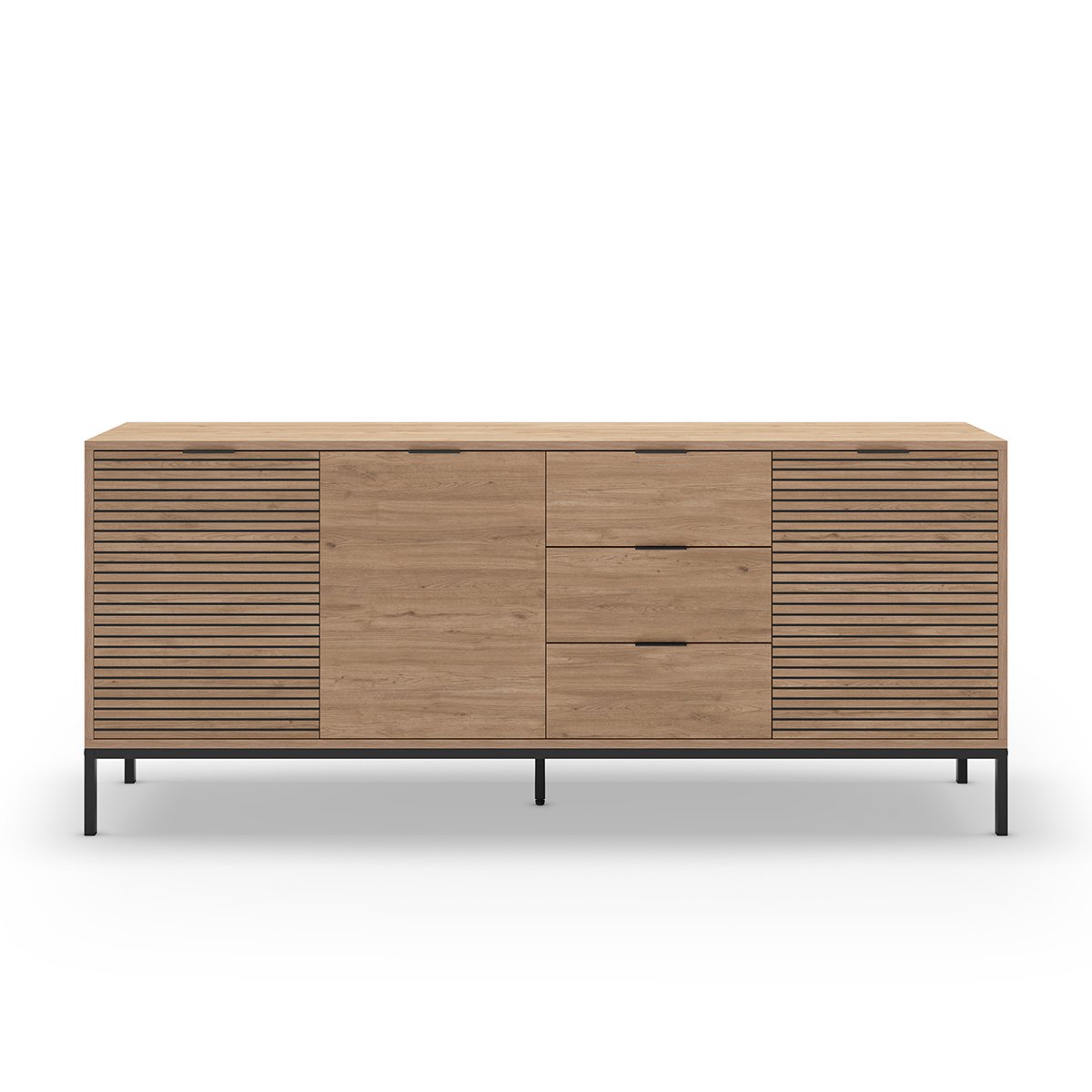 Productkenmerken: Gemaakt van 18 mm gelamineerde spaanplaten. Eiken kleur met zwarte groeven. Zwarte metalen poten en fijne zwarte metalen handgrepen. Deze grote buffetkast van 180 cm is ontworpen om aan uw behoeften te voldoen en een moderne en industriële touch aan uw interieur toe te voegen. Het biedt royale opbergruimte voor uw boeken, elektronische apparatuur, servies en keukengerei. Productafmetingen: Lengte 180 cm x breedte 40 cm x hoogte 80 cm - Nettogewicht: 57,5 kg. Verpakkingsafmetingen: Verpakking 1: Lengte 187 cm x breedte 45,5 cm x hoogte 12 cm - Brutogewicht: 35,15 kg. Verpakking 2: Lengte 68,5 cm x breedte 47,5 cm x hoogte 20 cm - Brutogewicht: 24,8 kg. Totaal brutogewicht: 59,95 kg.