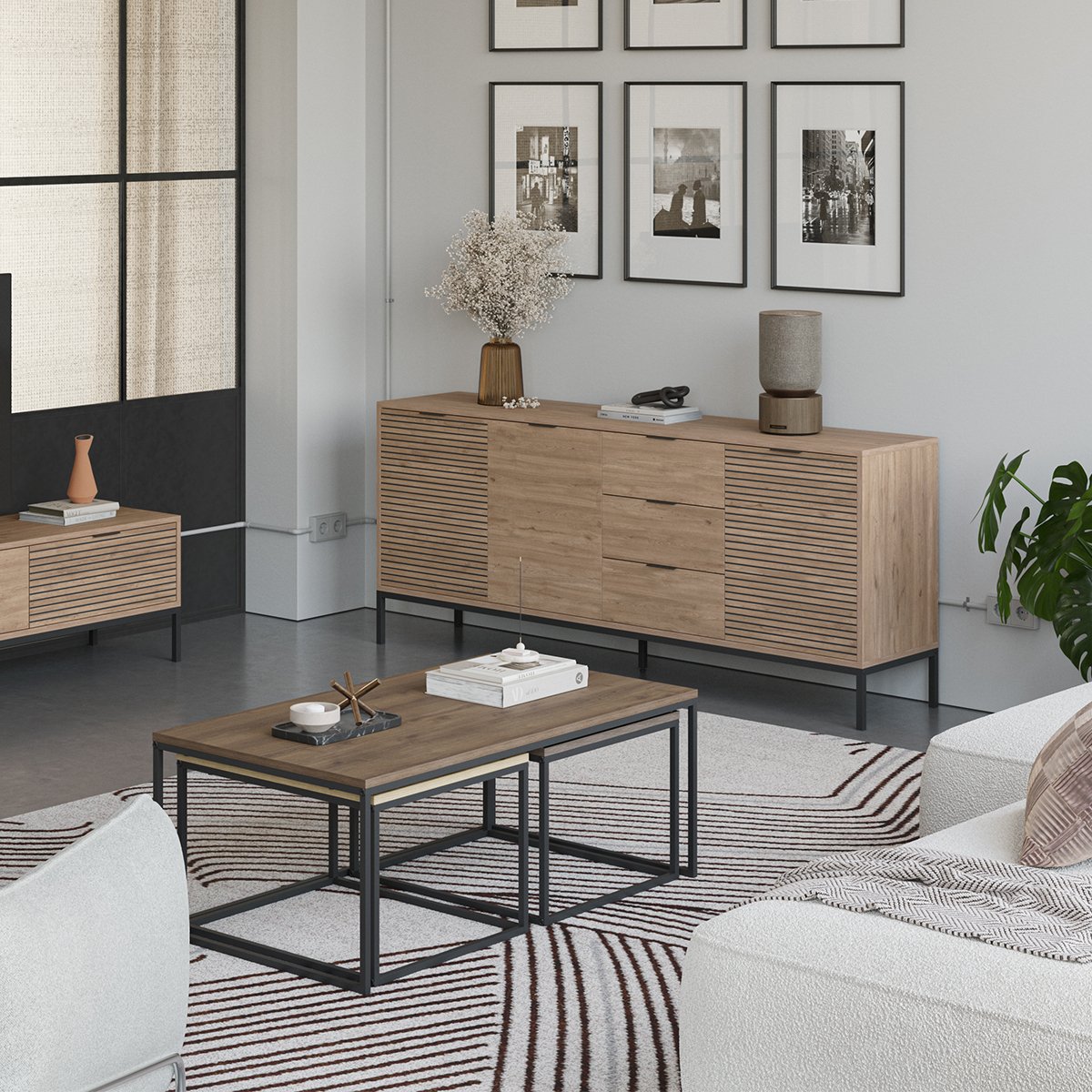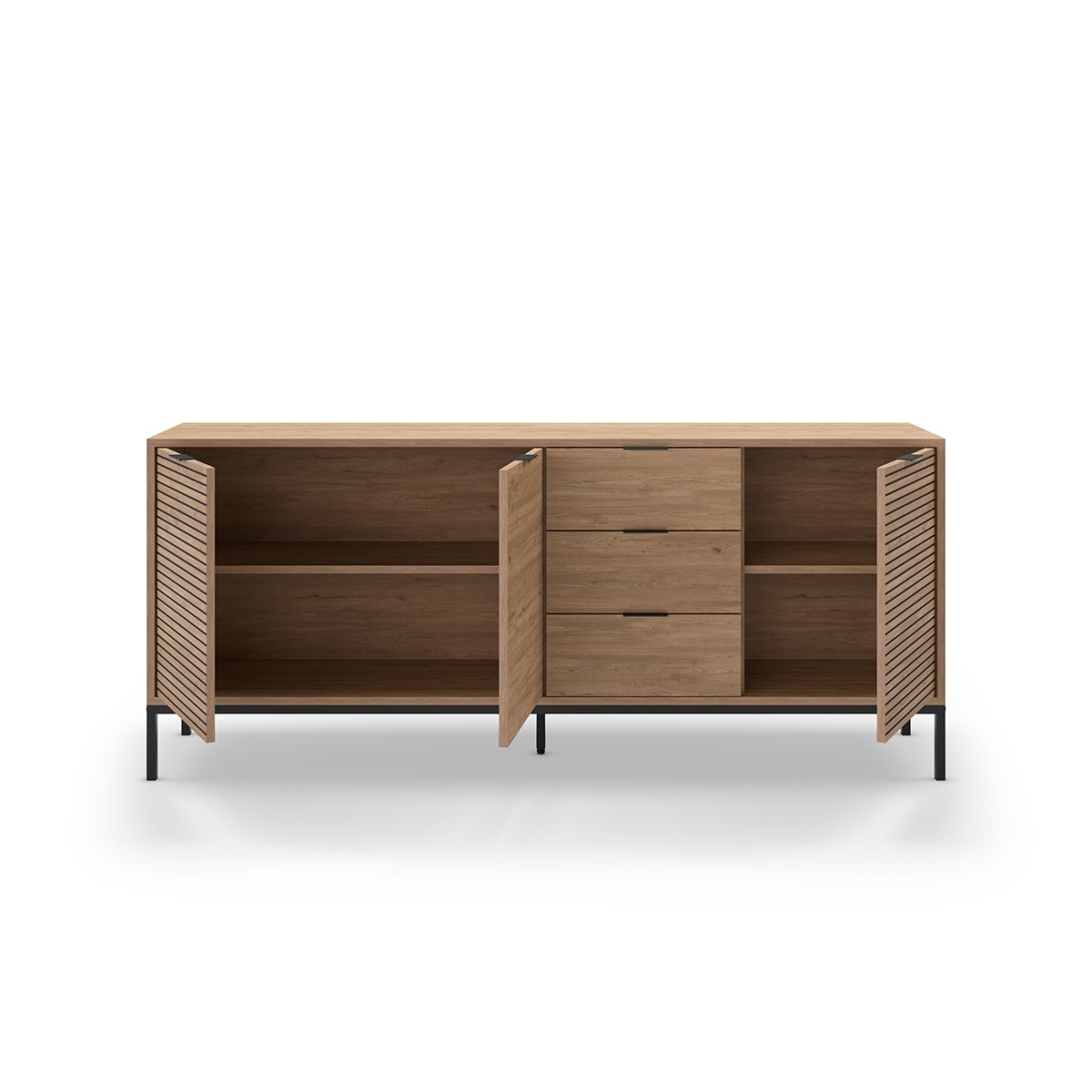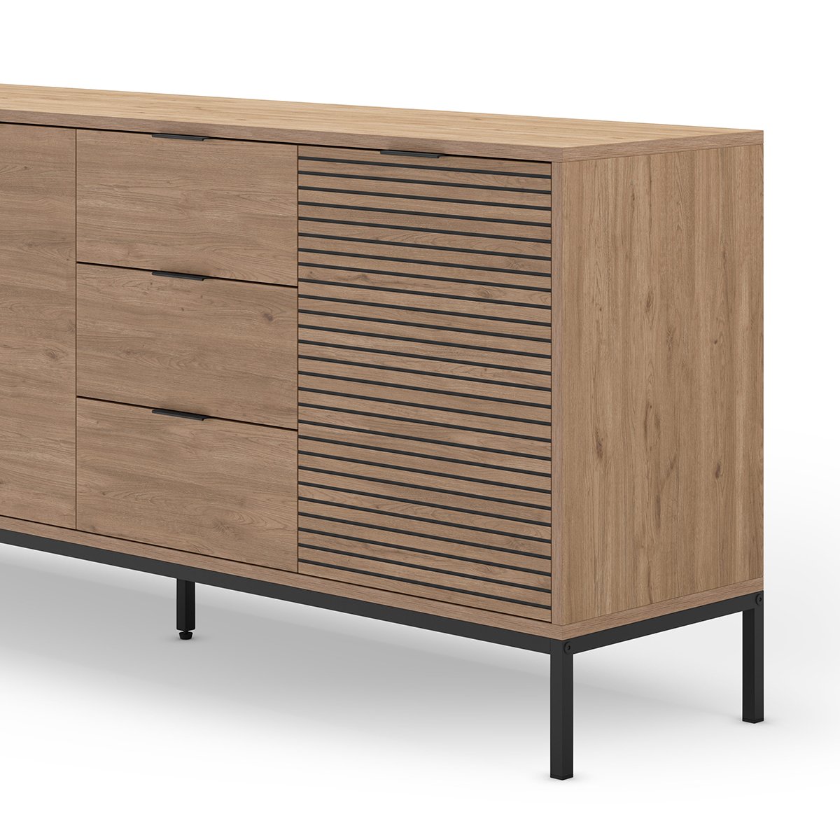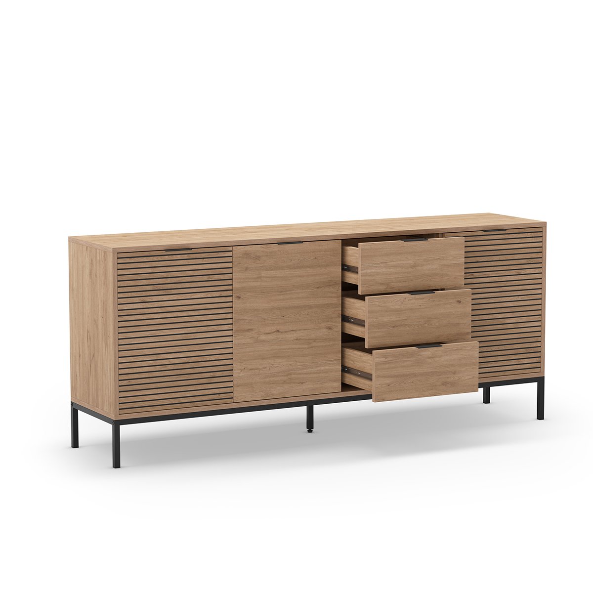 Productkenmerken: Gemaakt van 18 mm gelamineerde spaanplaten. Eiken kleur met zwarte groeven. Zwarte metalen poten en fijne zwarte metalen handgrepen. Deze grote buffetkast van 180 cm is ontworpen om aan uw behoeften te voldoen en een moderne en industriële touch aan uw interieur toe te voegen. Het biedt royale opbergruimte voor uw boeken, elektronische apparatuur, servies en keukengerei. Productafmetingen: Lengte 180 cm x breedte 40 cm x hoogte 80 cm - Nettogewicht: 57,5 kg. Verpakkingsafmetingen: Verpakking 1: Lengte 187 cm x breedte 45,5 cm x hoogte 12 cm - Brutogewicht: 35,15 kg. Verpakking 2: Lengte 68,5 cm x breedte 47,5 cm x hoogte 20 cm - Brutogewicht: 24,8 kg. Totaal brutogewicht: 59,95 kg.