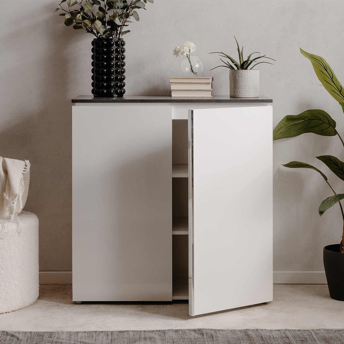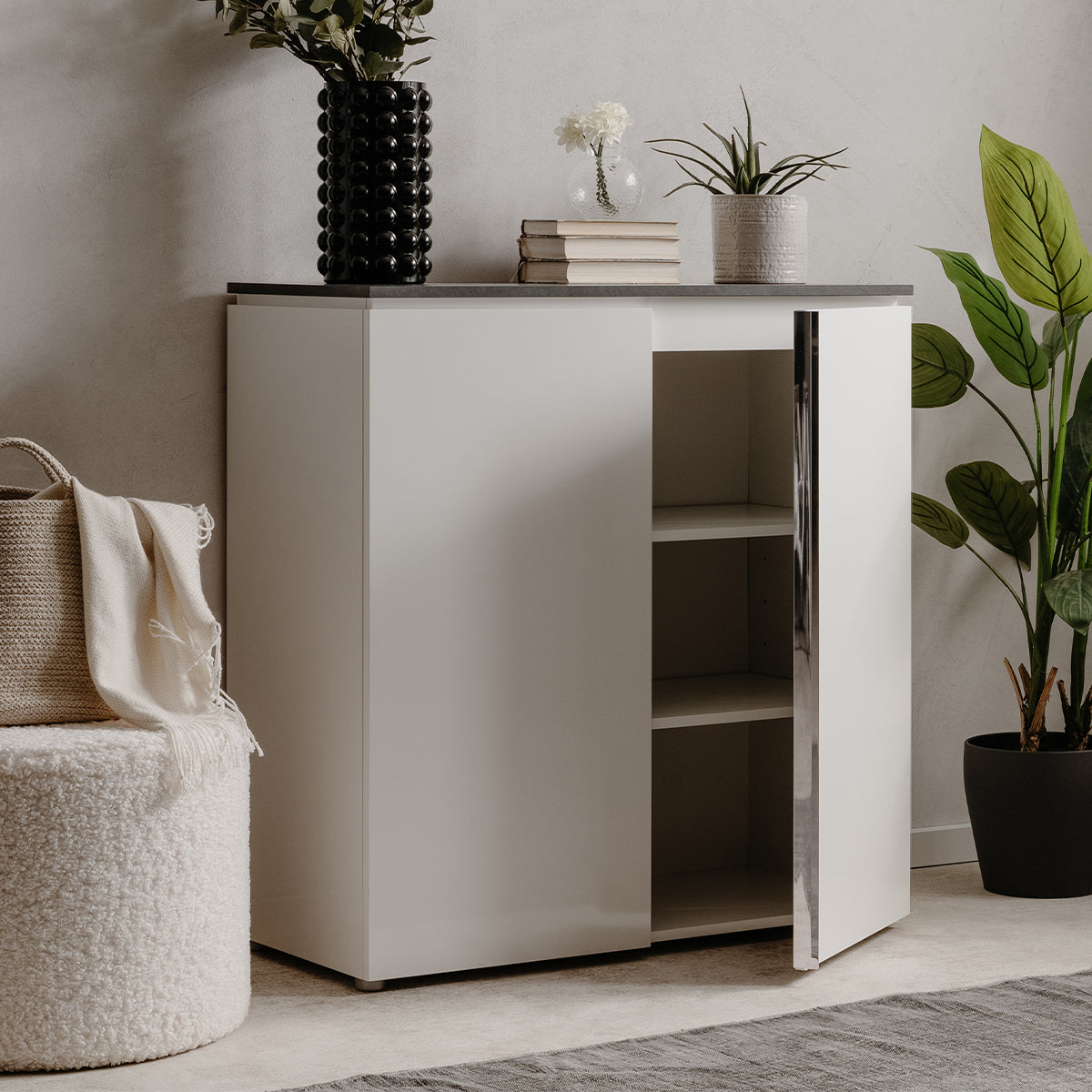 Productkenmerken: Grote plastic handgrepen met chroom effect, dun blad van 15 mm dikte en zwevend uiterlijk. 2 deuren en 2 planken aan de binnenkant. Productafmetingen: Lengte 88,5 cm x breedte 40 cm x hoogte 92 cm - Nettogewicht 31,9 kg. Pakketafmetingen: Pakket nr. 1: Lengte 99 cm x hoogte 9 cm x diepte 47 cm - Bruto gewicht: 15,4 kg. Pakket nr. 2: Lengte 105 cm x hoogte 9,5 cm x diepte 51 cm - Bruto gewicht: 18,9 kg. Totaal bruto gewicht: 34,3 kg.