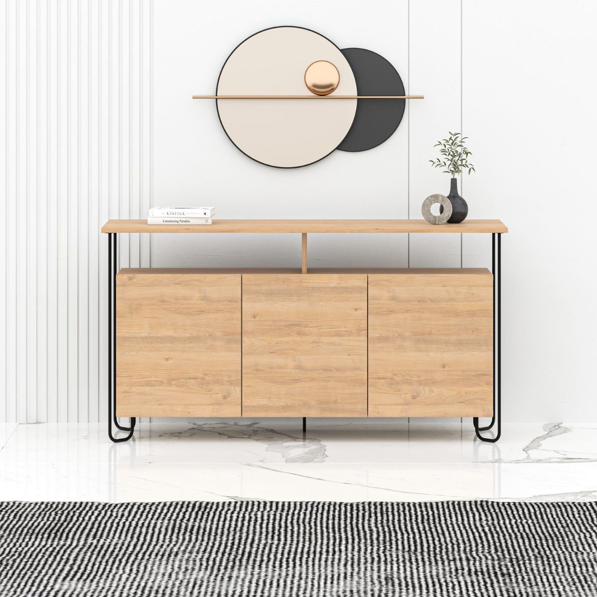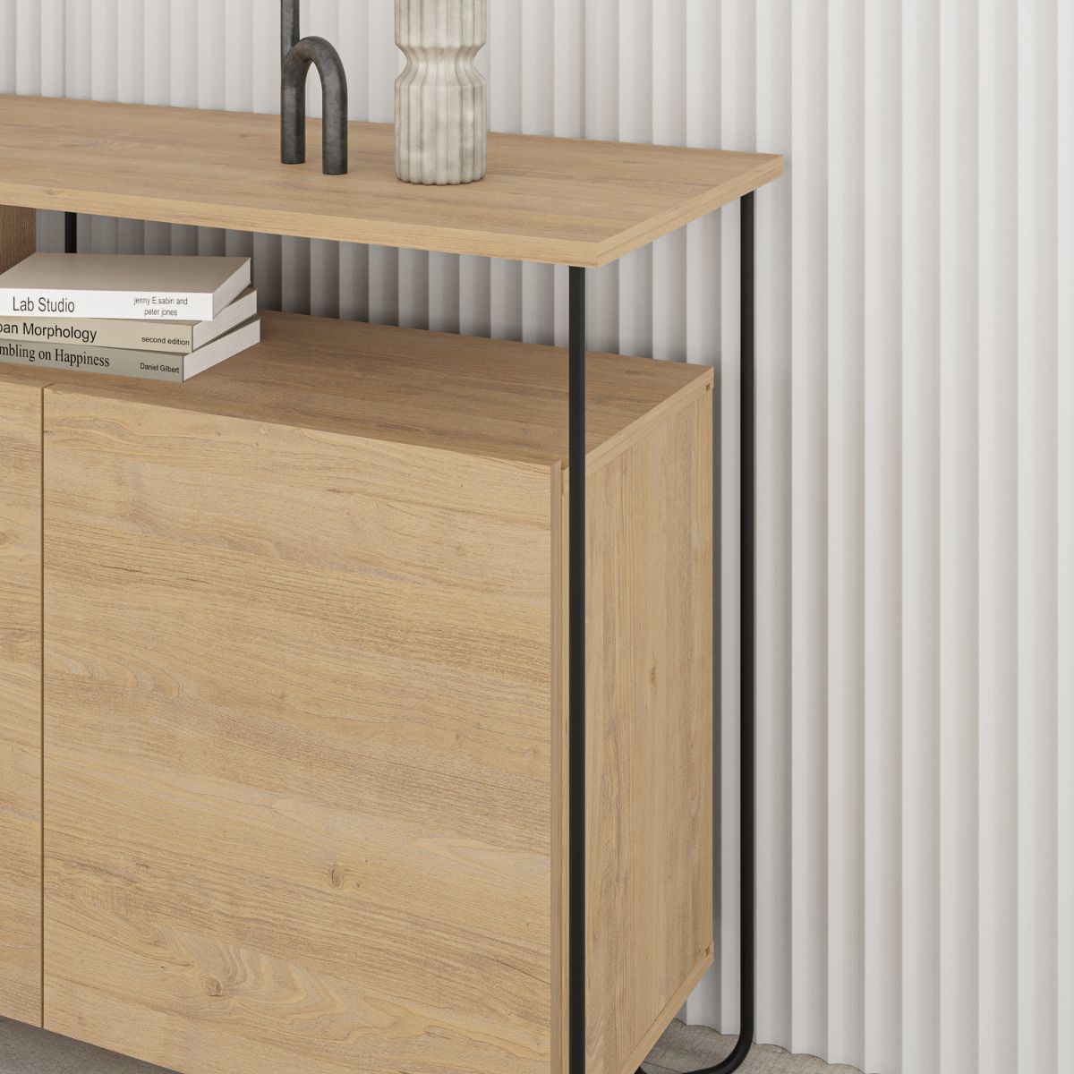Productkenmerken: Structuur van 18 mm gelamineerde spaanplaat in eikenkleur. Metalen poten, afgeronde vorm. Deuren met push-open systeem. De bijzonderheid van dit meubelstuk ligt in het dubbele blad, het eigentijdse ontwerp en de afgeronde zwarte poten geven het een moderne esthetiek. Productafmetingen: Lengte 130 cm x breedte 40 cm x hoogte 80 cm - Nettogewicht: 35,5 kg. Verpakkingsafmetingen: Pakket nr. 1: Lengte 45,8 cm x breedte 23,7 cm x hoogte 144,6 cm - Bruto gewicht: 42 kg.