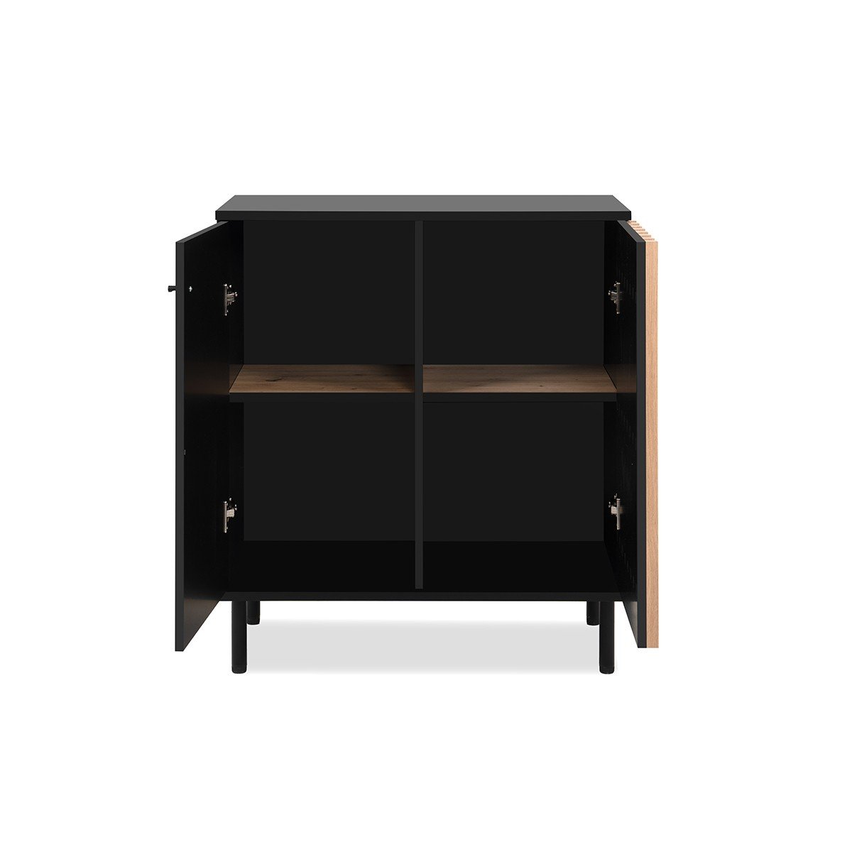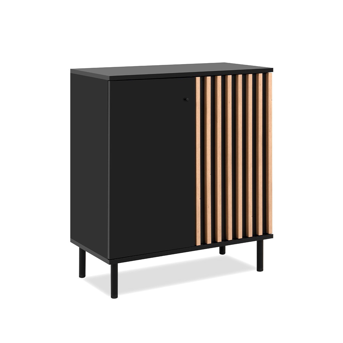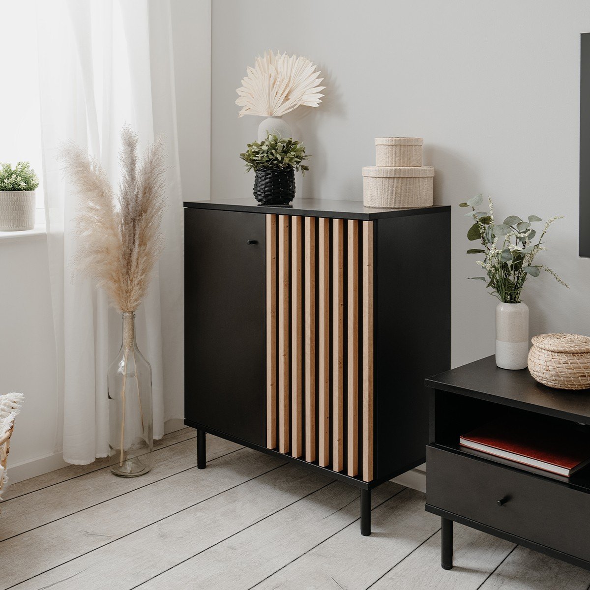 Productkenmerken: Lamellen van MDF in eiken ambachtelijke kleur en achterwand in matzwarte kleur. Zwarte metalen handgrepen. Anti-vingerafdruk zwart decor. Afgeronde metalen poten. ABS-randen. 2 deuren (1 massief en 1 met lamellen), 1 plank achter elke deur. Productafmetingen: Lengte 80 cm x breedte 40 cm x hoogte 90 cm - Nettogewicht: 32 kg. Verpakkingsafmetingen: Doos nr. 1: Lengte 89,5 cm x Hoogte 10 cm x Diepte 48 cm - Bruto gewicht: 16 kg. Doos nr. 2: Lengte 97 cm x Hoogte 47,5 cm x Diepte 11,5 cm - Bruto gewicht: 19 kg. Toatl bruto gewicht : 34,5 kg.