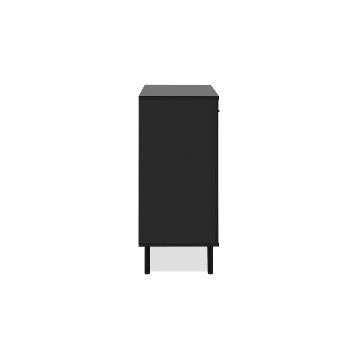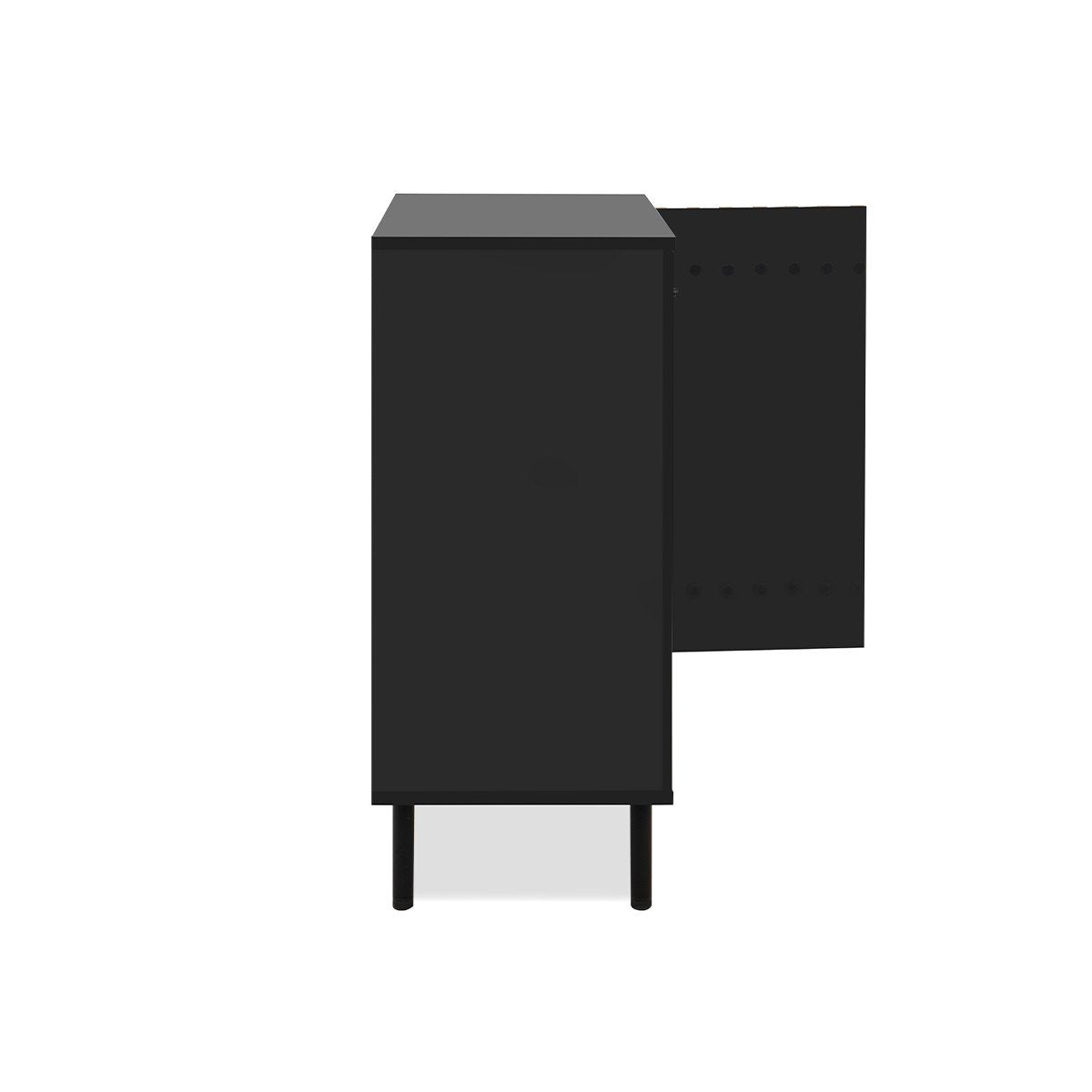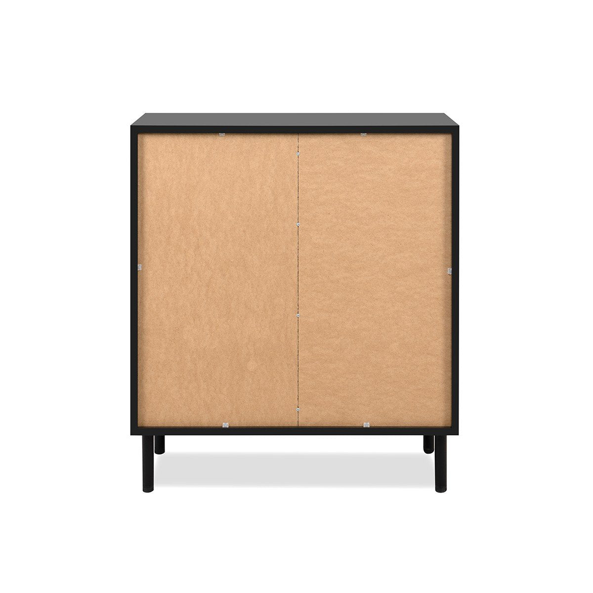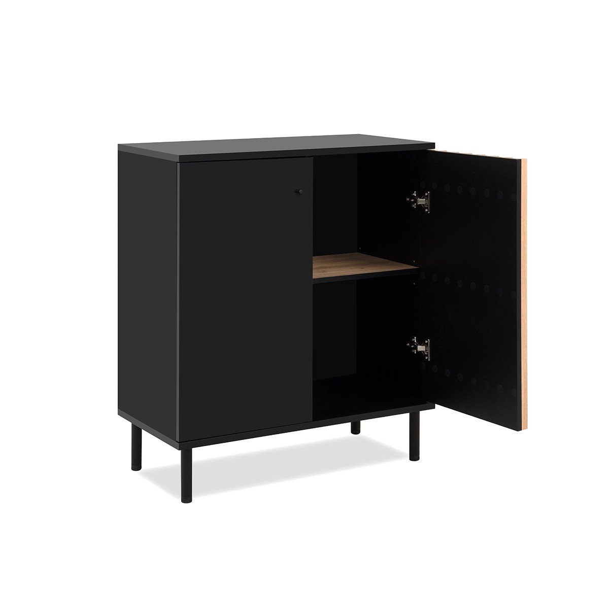Productkenmerken: Lamellen van MDF in eiken ambachtelijke kleur en achterwand in matzwarte kleur. Zwarte metalen handgrepen. Anti-vingerafdruk zwart decor. Afgeronde metalen poten. ABS-randen. 2 deuren (1 massief en 1 met lamellen), 1 plank achter elke deur. Productafmetingen: Lengte 80 cm x breedte 40 cm x hoogte 90 cm - Nettogewicht: 32 kg. Verpakkingsafmetingen: Doos nr. 1: Lengte 89,5 cm x Hoogte 10 cm x Diepte 48 cm - Bruto gewicht: 16 kg. Doos nr. 2: Lengte 97 cm x Hoogte 47,5 cm x Diepte 11,5 cm - Bruto gewicht: 19 kg. Toatl bruto gewicht : 34,5 kg.