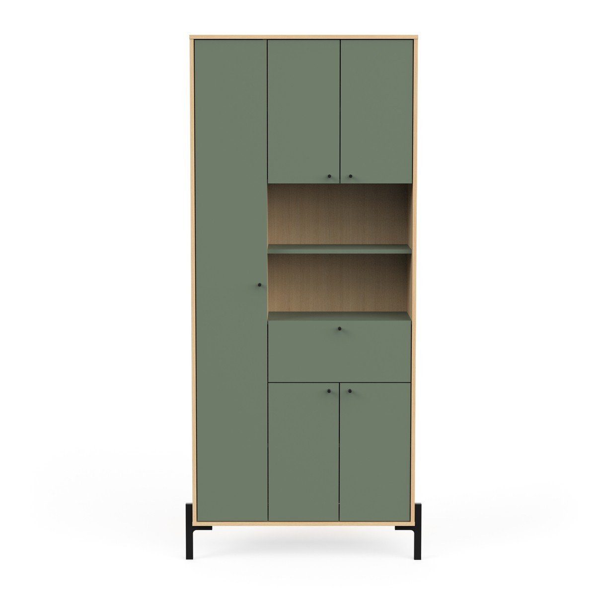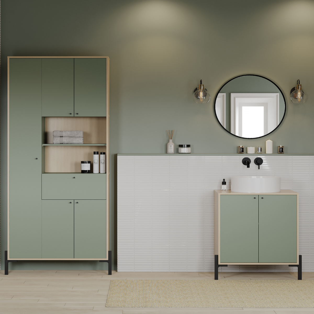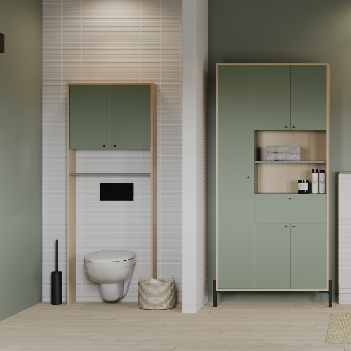 - Kastkolom met 4 deuren, 1 lade en 2 open vakken, gemaakt van 15 mm melaminepanelen in eikenhoutdecor gecombineerd met terracotta of mineraalgroen.