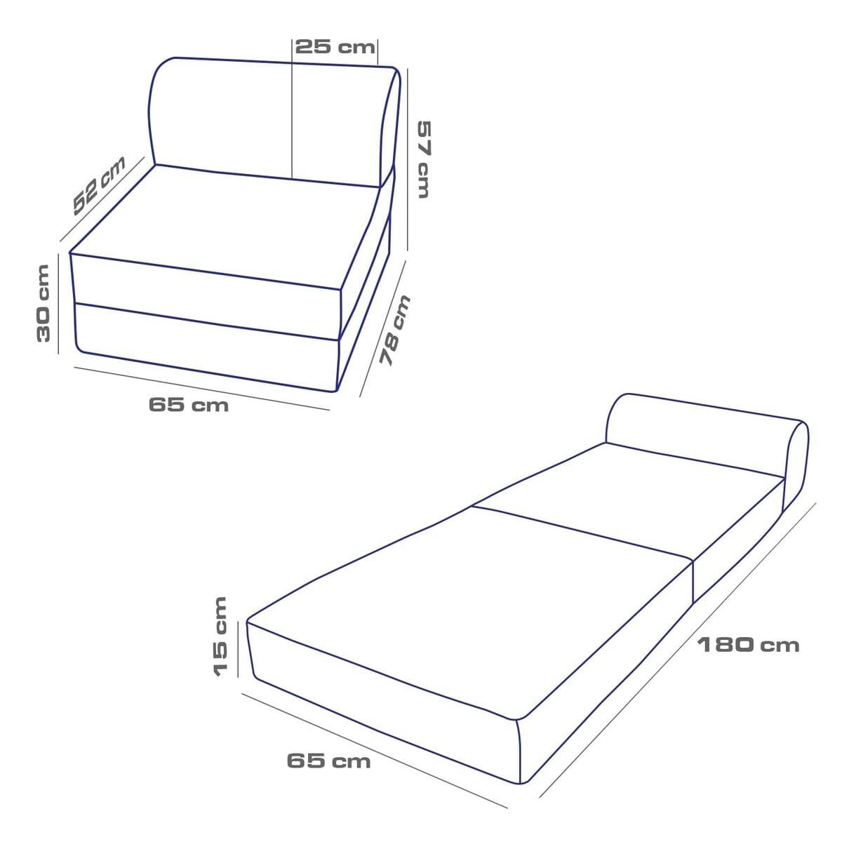 - Afmetingen bed: Breedte 65 cm x Diepte 180 cm x Hoogte 15 cm.