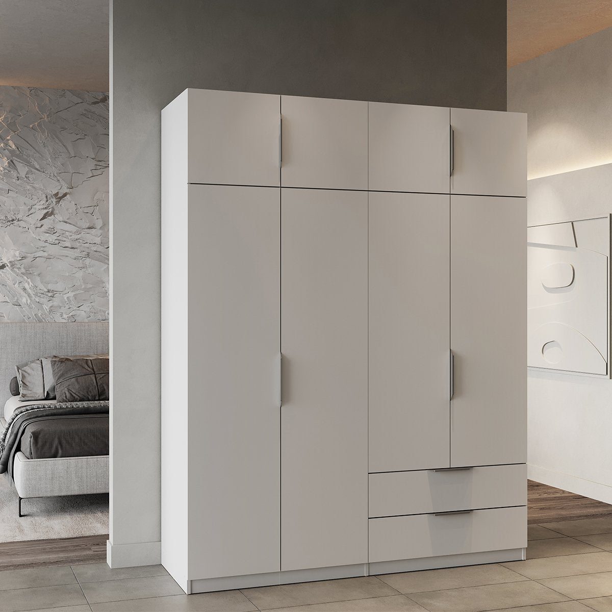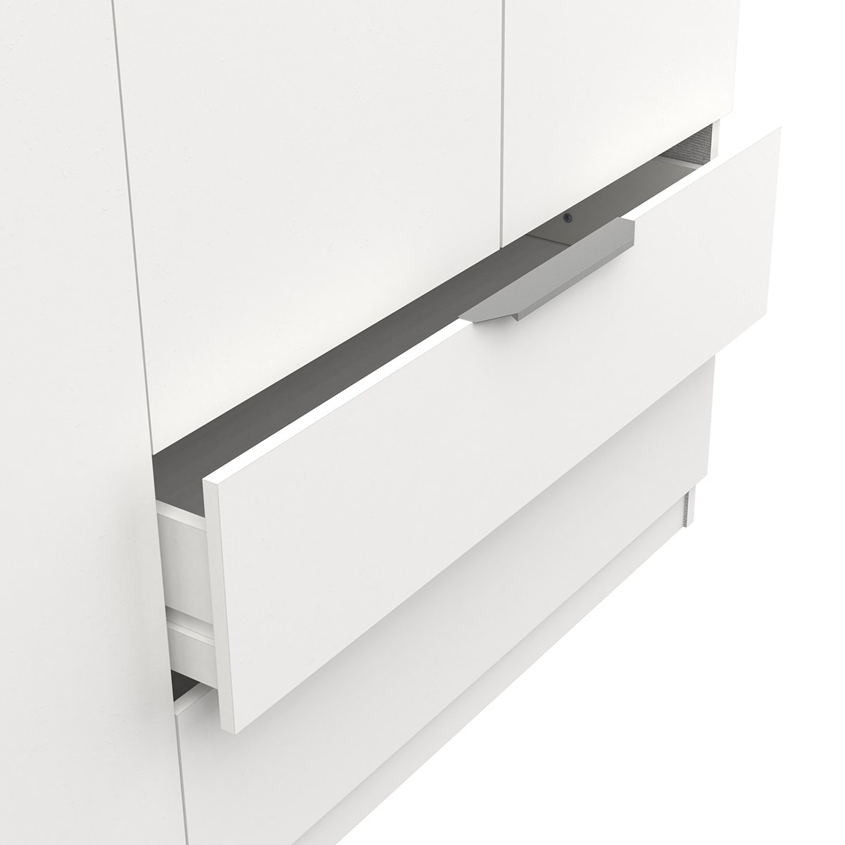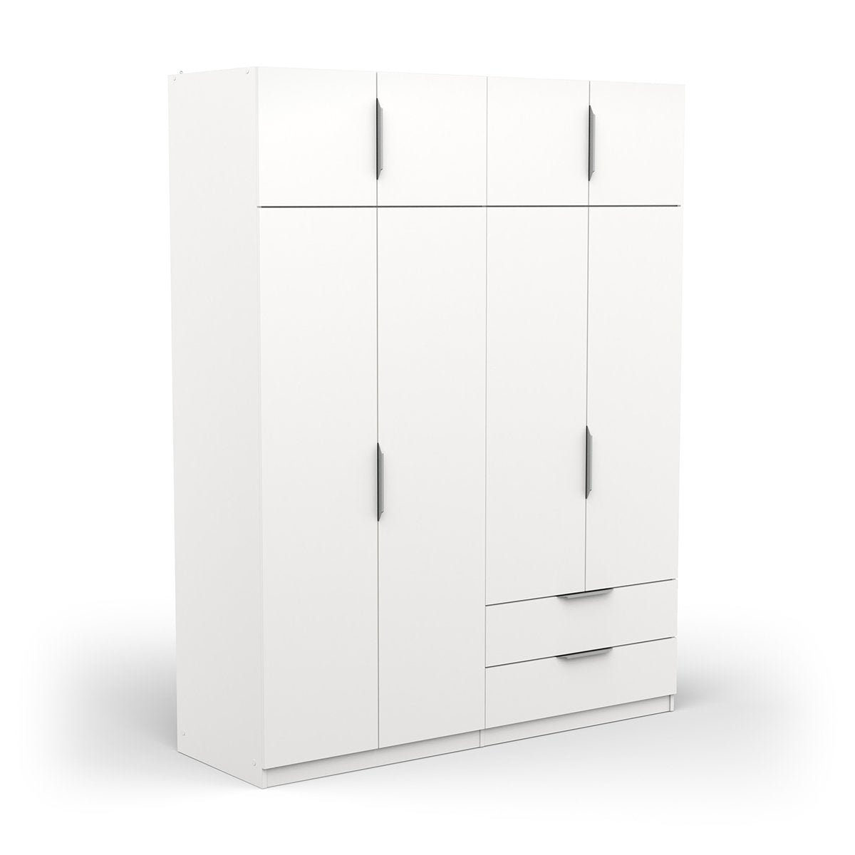 Productkenmerken: Kast met 8 deuren en 2 laden Ghost. Gemaakt van 12 en 15 mm spaanplaat. Indeling: Nissen (L.76,4 x D.49,6 x H.36 cm) Planken (L.76,4 x D.49,6 cm, max. belasting 16 kg) Kledingstang (75,7 cm, max. belasting 19 kg) Bovenpaneel (L.154,3 x D.49,8 cm, max. belasting 32 kg) Laden (L.73,1 x D.38,7 x H.10,6 cm, max. belasting 5 kg). Zelf te monteren. Voor huishoudelijk gebruik. Productafmetingen: Lengte 157,3 cm x breedte 51,1 cm x hoogte 203 cm - Nettogewicht: 99,87 kg. Verpakkingsafmetingen: Verpakking nr. 1: Lengte 40,9 cm x Hoogte 9,9 cm x Diepte 166,5 cm - Brutogewicht: 34,5 kg. Verpakking nr. 2: Lengte 51,7 cm x Hoogte 5,7 cm x Diepte 210,5 cm - Brutogewicht: 35,5 kg. Verpakking nr. 3: Lengte 51,7 cm x Hoogte 7,9 cm x Diepte 162 cm - Brutogewicht: 32,5 kg. Totaal brutogewicht: 102,5 kg.