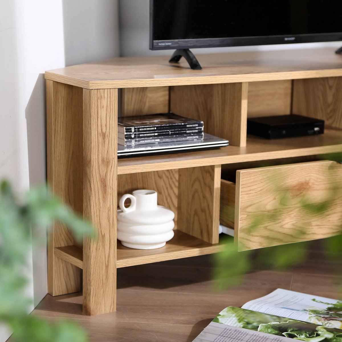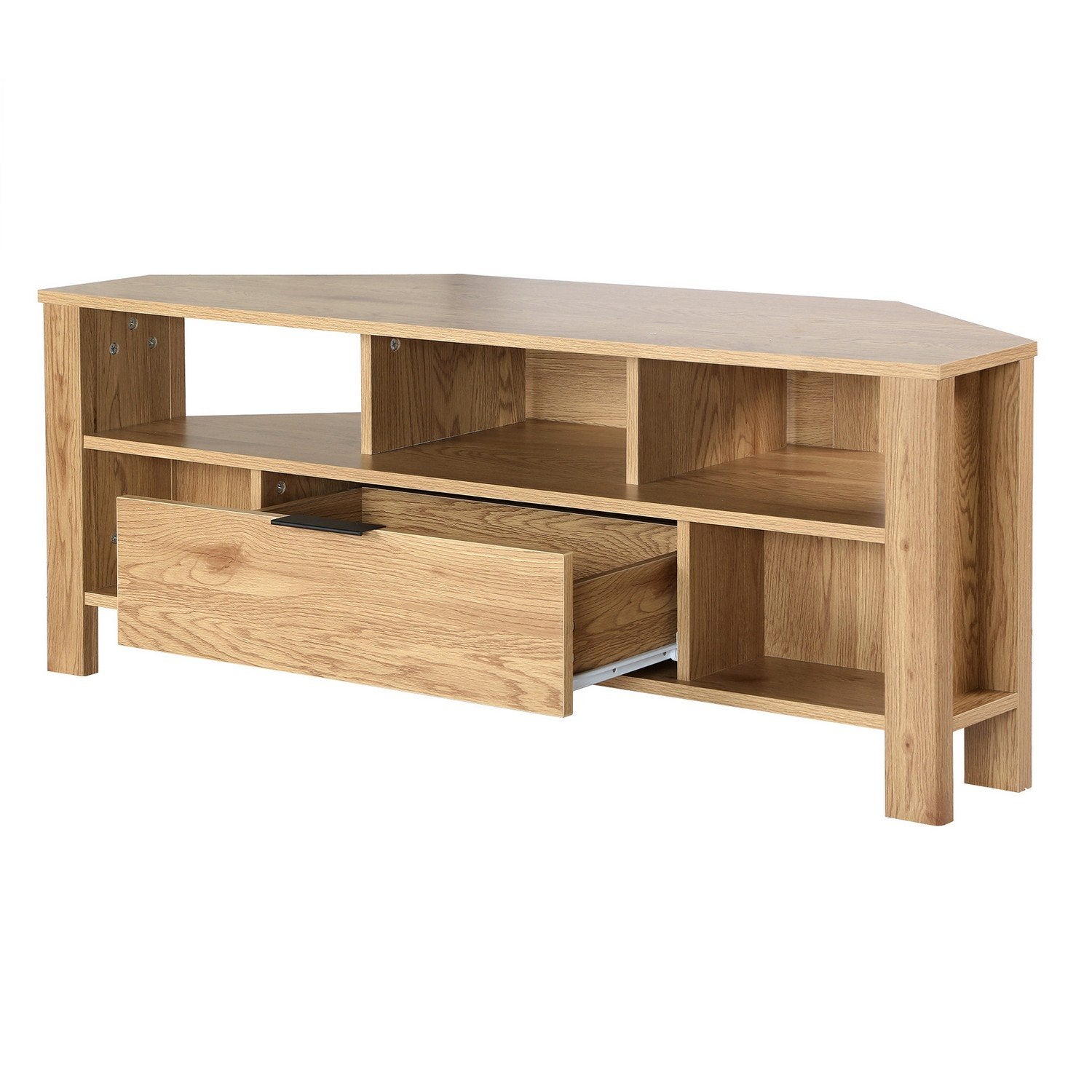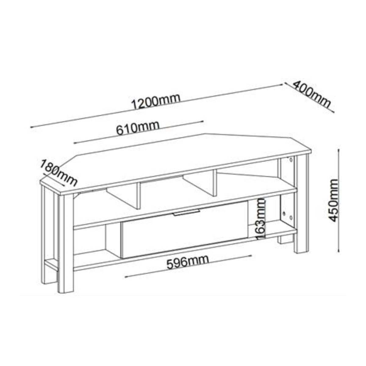 Productkenmerken: Hoek-tv-meubel met meerdere open opbergvakken. 1 lade op metalen rails + metalen handgreep. Ideaal om een hoekruimte te optimaliseren. Productafmetingen: Lengte 120 cm x Breedte 40 cm x Hoogte 45 cm - Netto gewicht: 26,5 kg. Afmetingen van de verpakking: Verpakking nr. 1: Lengte 127 cm x Hoogte 14 cm x Diepte 43 cm - Bruto gewicht: 27,5 kg.