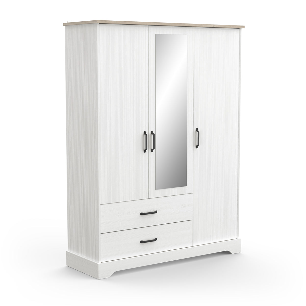 Ontdek onze Cottage 3-deurs kast met 1 spiegel en 2 laden - H199,60 cm. Met veel opbergruimte is deze kast perfect om je slaapkamer te organiseren. Deze kast heeft een kledingstang, 2 laden en 4 verstelbare planken op 3 niveaus. De spiegeldeur is perfect voor je dagelijkse voorbereidingen. De gezellige stijl past bij elk interieur. Productkenmerken: Hoofdmateriaal: Spaanplaat. Interne opslag: 2/3 kledingkast, gesloten met 2 deuren waarvan 1 met spiegel (afmetingen L 32 x H 125,50 cm). Kledingstang van 90,5 cm. 2 laden gemonteerd op rollagers (bruikbare afmetingen L 86,30 x D 43,70 x H 14,60 cm). 4 verstelbare planken op 3 niveaus. 5 antiek grijze gelakte handgrepen, metaallook (asafstand 12,8 cm). Voet met uitsparing. Zelf te monteren. Productafmetingen: Lengte 148,6 cm x Hoogte 199,6 cm x Diepte 57,10 cm - Netto gewicht: 107,59 kg. Verpakkingsafmetingen: Pakket nr. 1: Lengte 54,7 cm x Hoogte 11 cm x Diepte 160,5 cm - Bruto gewicht: 46 kg. Pakket nr. 2: Lengte 52,3 cm x Hoogte 6,5 cm x Diepte 192 cm - Bruto gewicht: 32,3 kg. Pakket nr. 3: Lengte 51,7 cm x Hoogte 6 cm x Diepte 205 cm - Bruto gewicht: 34,2 kg. Totaal bruto gewicht: 112,5 kg.