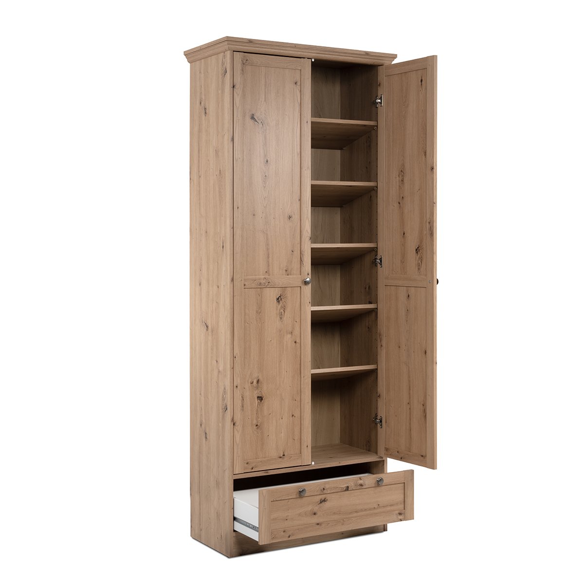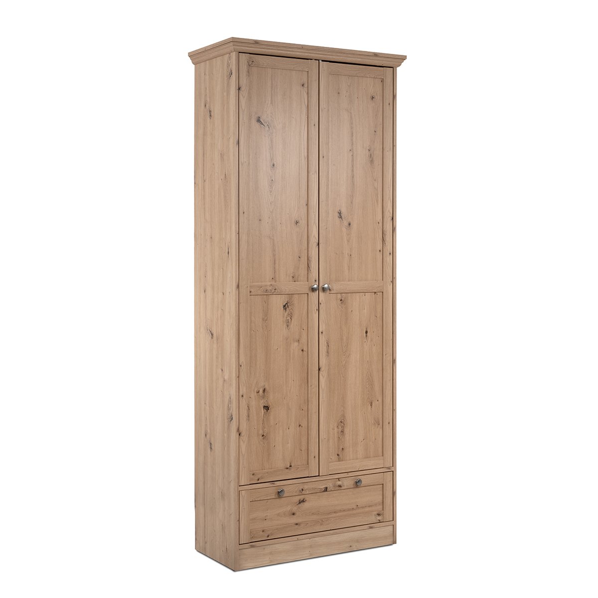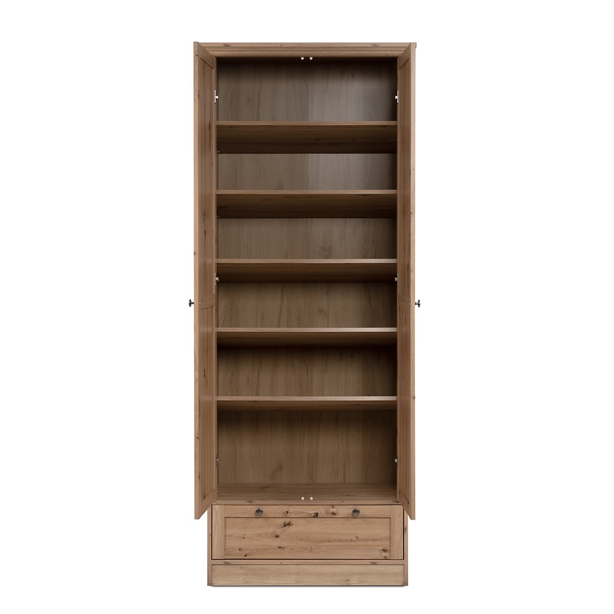 Productkenmerken: Entreekast met 2 deuren in frame, 5 planken aan de binnenkant, 1 lade met metalen geleiders. Metalen handgrepen met vintage uitstraling. Profiel van MDF, ABS-randen en afgewerkt met melamine. Schuine (voor schoenen) of rechte planken. Productafmetingen: Lengte 80 cm x Breedte 39 cm x Hoogte 200 cm - Nettogewicht: 51 kg. Verpakkingsafmetingen: Doos nr. 1: Lengte 208 cm x Hoogte 9 cm x Diepte 47 cm - Bruto gewicht: 28 kg. Doos nr. 2: Lengte 208,5 cm x Hoogte 11 cm x Diepte 45,5 cm - Bruto gewicht: 27 kg.
