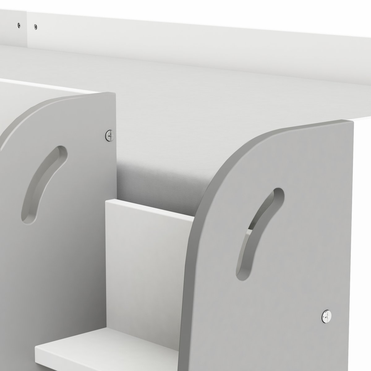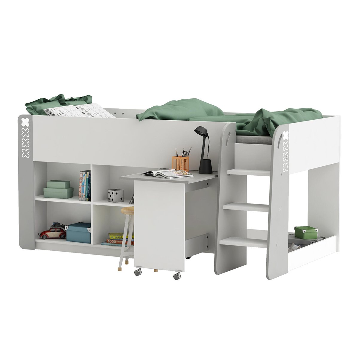 Met zijn ideale kleur voor een gemengde kinderkamer, past het Combinatiebed met Bureau en Opslag 90x200 - Hampton gemakkelijk bij elk type decoratie. Ideaal voor een kinderkamer, heeft het een verhoogd bed waarop een inklapbaar bureau op wieltjes kan worden geïntegreerd. Nissen bieden ruimte om boeken en speelgoed op te bergen. De zachte en neutrale kleuren met speelse zeefdrukken zijn gemakkelijk te combineren. Productkenmerken: Opslag: 4 nissen (53x29 cm). Geïntegreerd bureau op wieltjes (85x50 cm). Afgeronde vormen voor de veiligheid van het kind, gelakte grijze fronten met verf op waterbasis zonder zware metalen. Veiligheidsladder met handgrepen. Gemaakt in Frankrijk. Afmetingen product: Breedte 210,3 cm x Hoogte 97,8 cm x Diepte 124,2 cm - Nettogewicht: 93,2 kg.