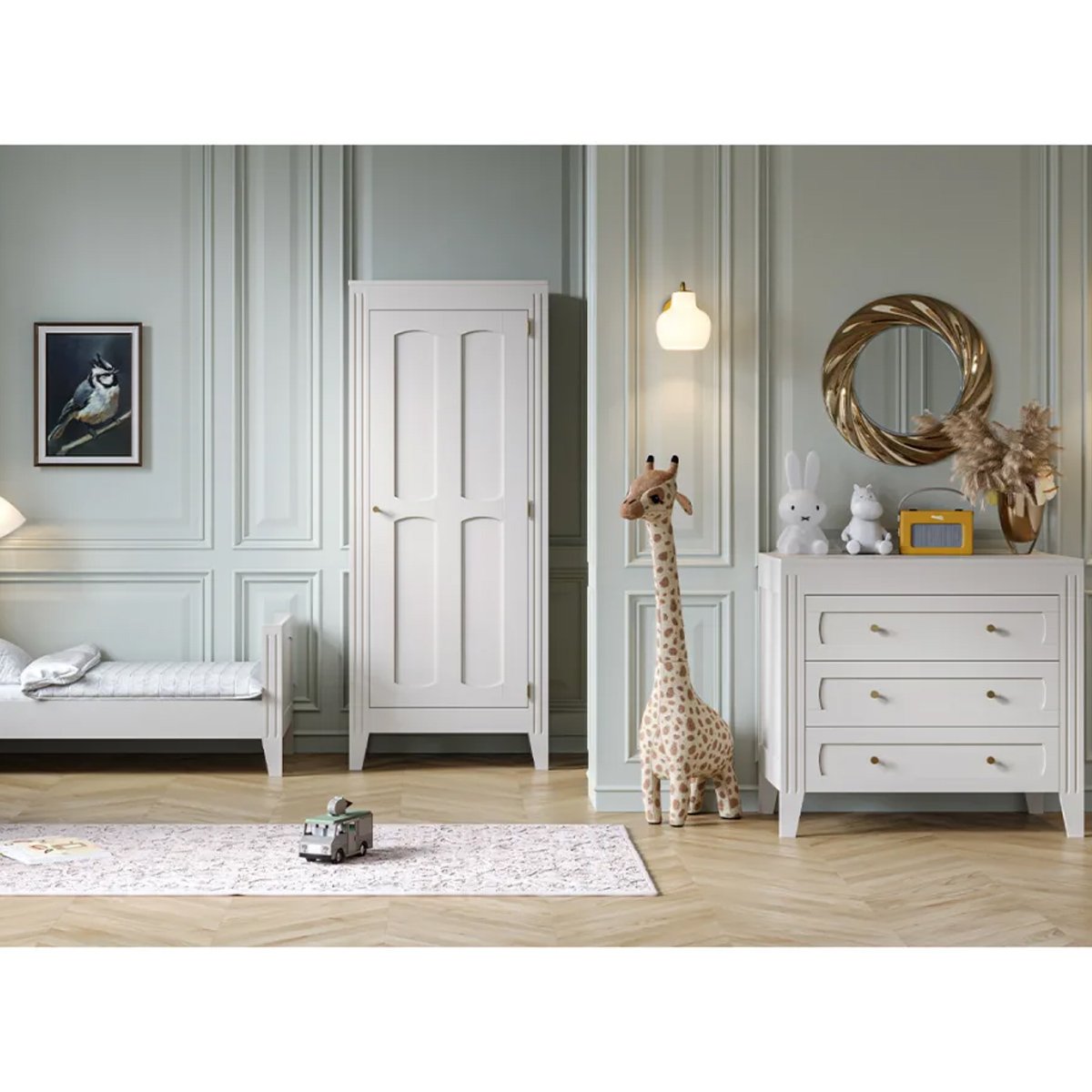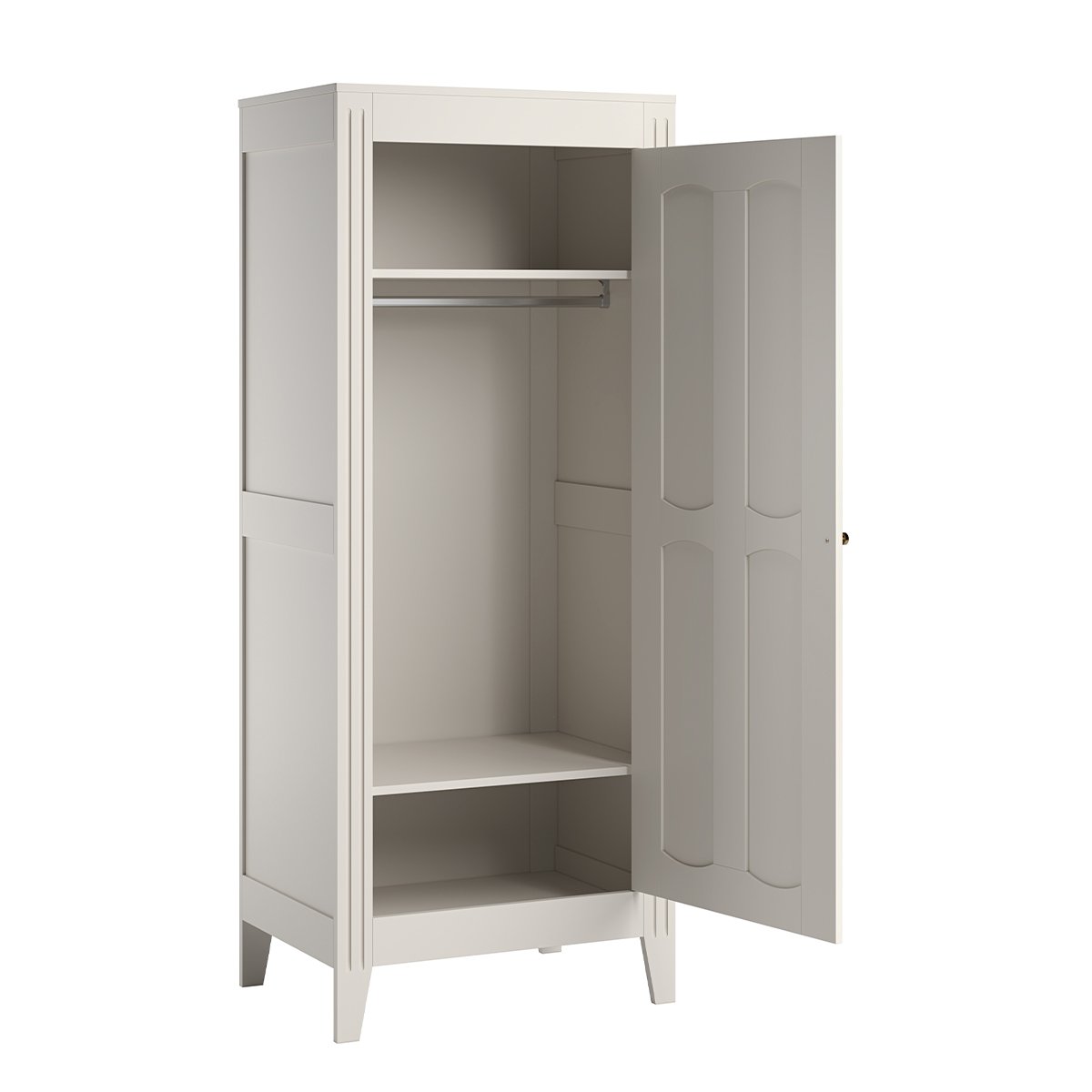 Met zijn gedetailleerde moulure-geest op de structuur en de deuren, evenals de gouden metalen handgrepen, biedt onze Kledingkast met 1 Deur, Planken en Garderobe L80.5 x H196.8 cm - Milenne een echte stijl geïnspireerd op de mooiste Parijse appartementen. De enkele deur opent naar een garderobe gedeelte om uw kleding op te hangen, compleet met twee planken boven en onder om uw spullen op te vouwen of uw reistassen op te bergen. Productbeschrijving: Kleur: verkrijgbaar in wit, grijs of blauw Gemaakt van gelamineerde spaanplaat. Gouden metalen handgrepen. Kast uitgerust met 2 in hoogte verstelbare planken en 1 kledingstang. Verkrijgbaar in het Milenne-assortiment: Kledingkast / Commode Ontworpen in Europa Productafmetingen: Diepte 80,5 cm x Breedte 55,25 cm x Hoogte 196,8 cm - Netto gewicht 52 kg Verpakkingsafmetingen: Pakket nr. 1: Breedte 73 cm x Diepte 202 cm x Hoogte 9,5 cm - Bruto gewicht: 28 kg Pakket nr. 2: Breedte 63 cm x Diepte 88 cm x Hoogte 14,5 cm - Bruto gewicht: 26 kg