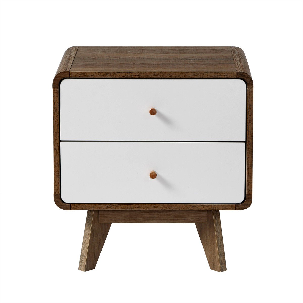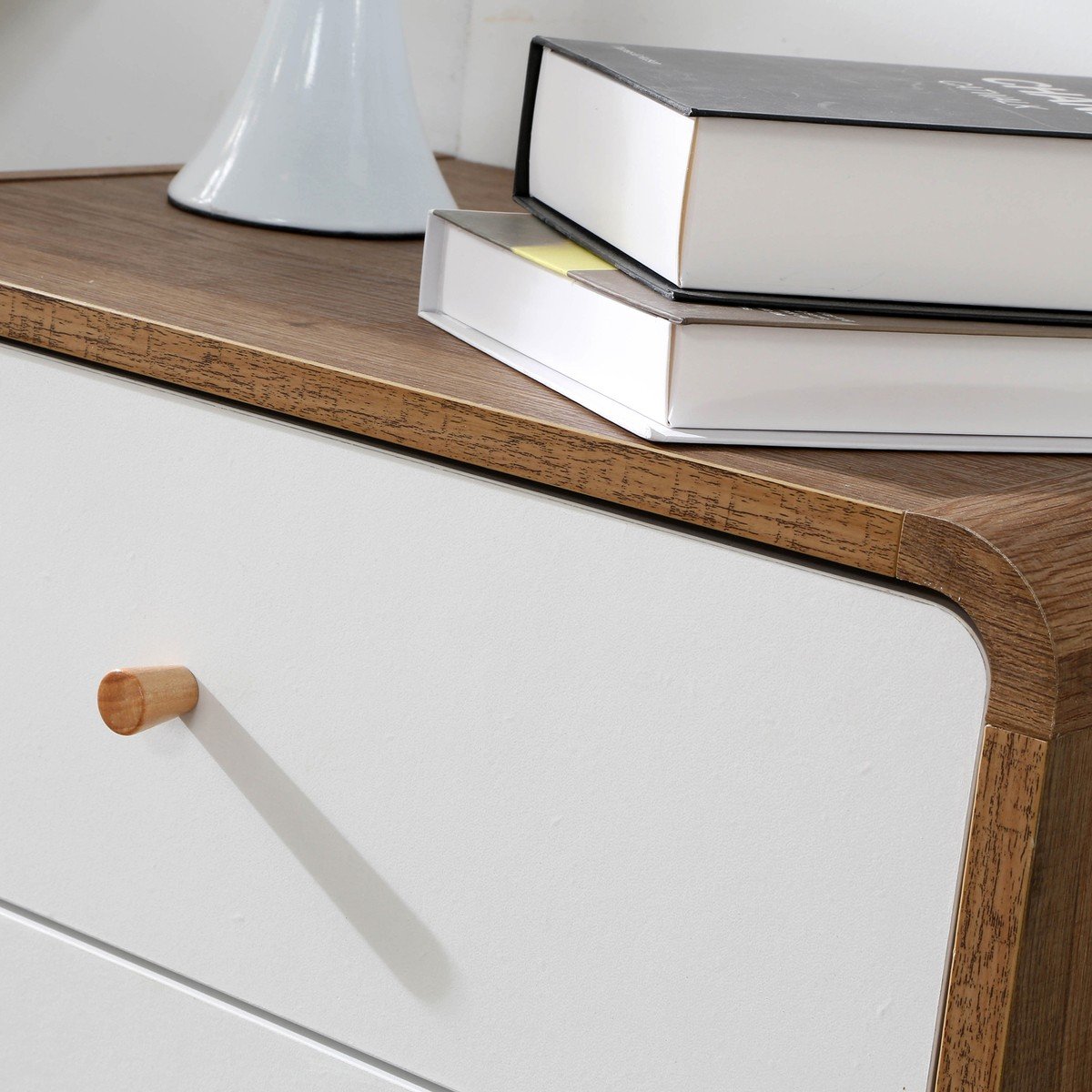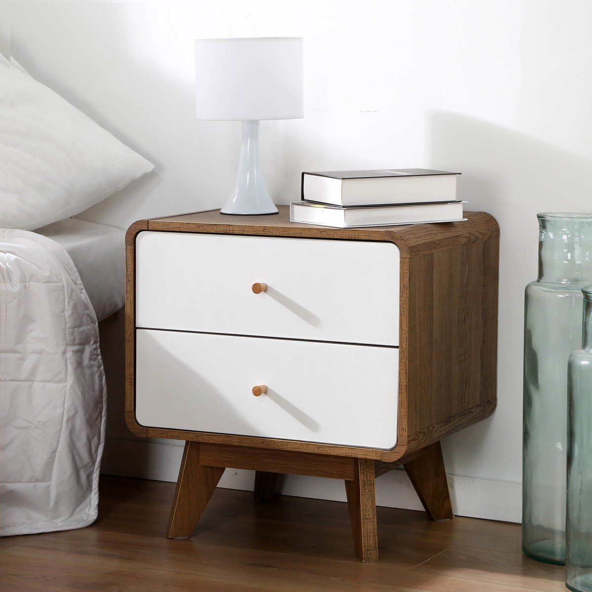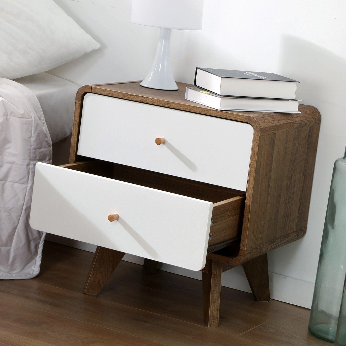 Nachtkastje met 2 laden, ontworpen in hoogwaardig melaminepanelen. De ladefronten zijn wit en versierd met houten knoppen, terwijl het frame en de poten in houtdecor zijn, wat een elegante en natuurlijke touch aan uw interieur toevoegt.