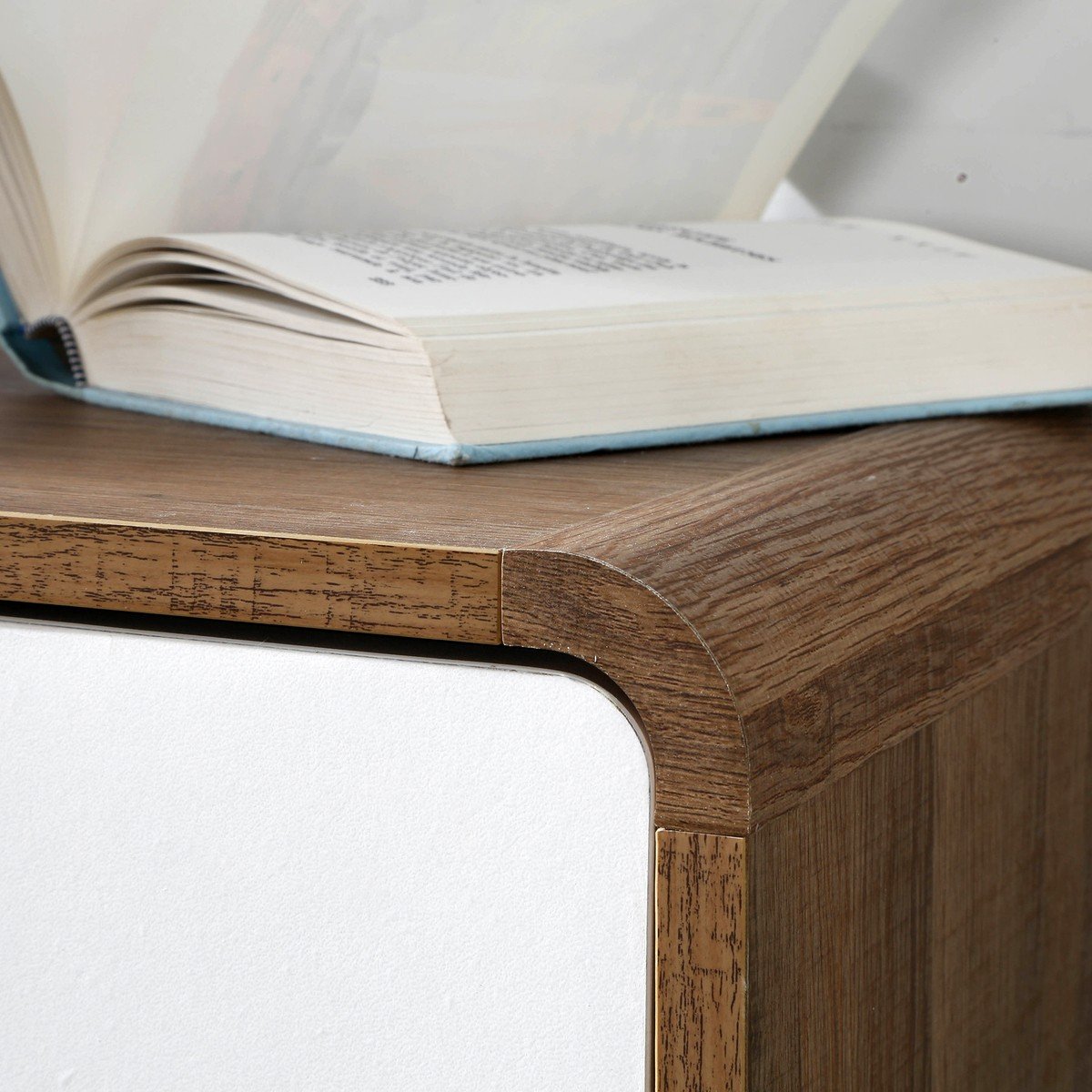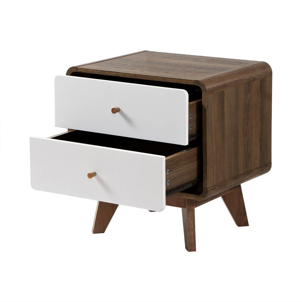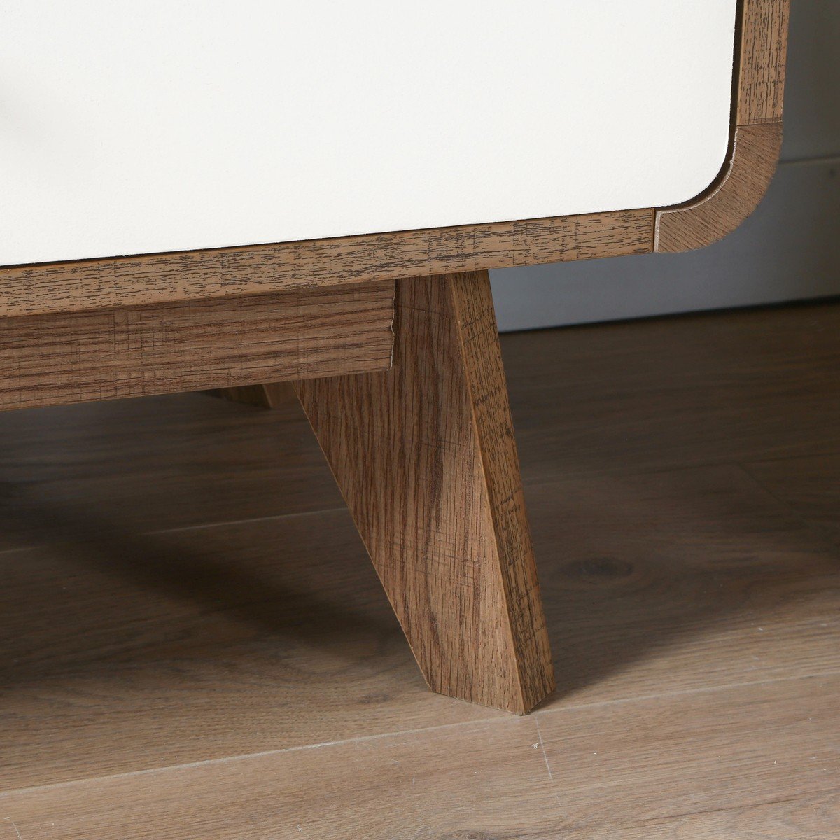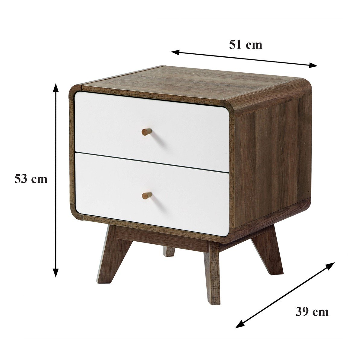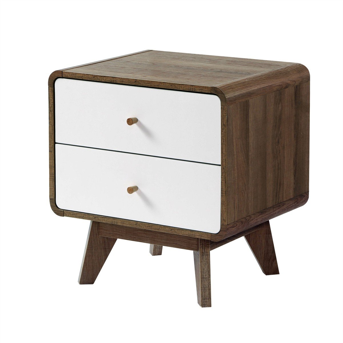 Nachtkastje met 2 laden, ontworpen in hoogwaardig melaminepanelen. De ladefronten zijn wit en versierd met houten knoppen, terwijl het frame en de poten in houtdecor zijn, wat een elegante en natuurlijke touch aan uw interieur toevoegt.