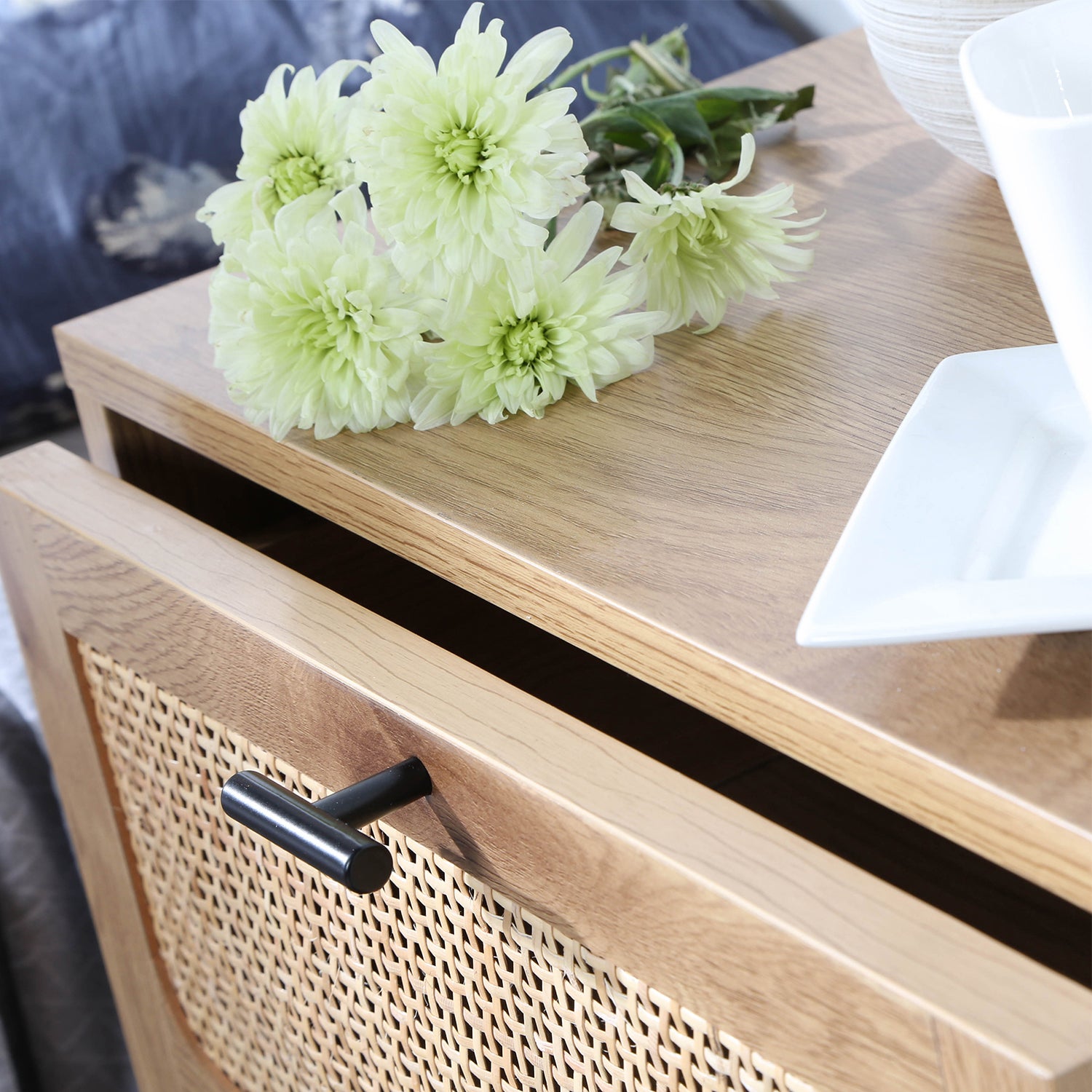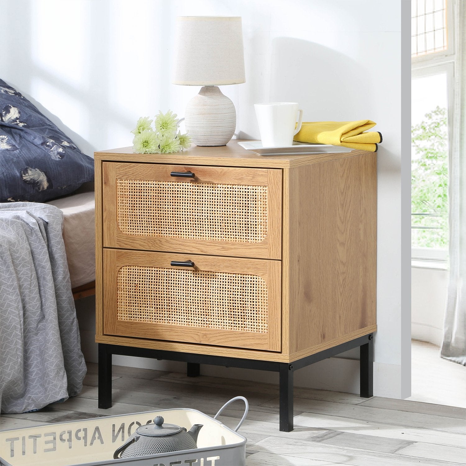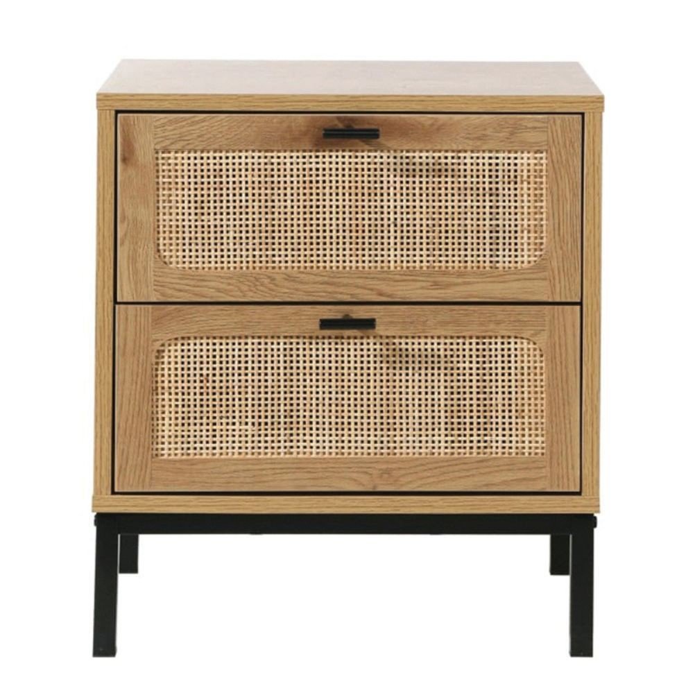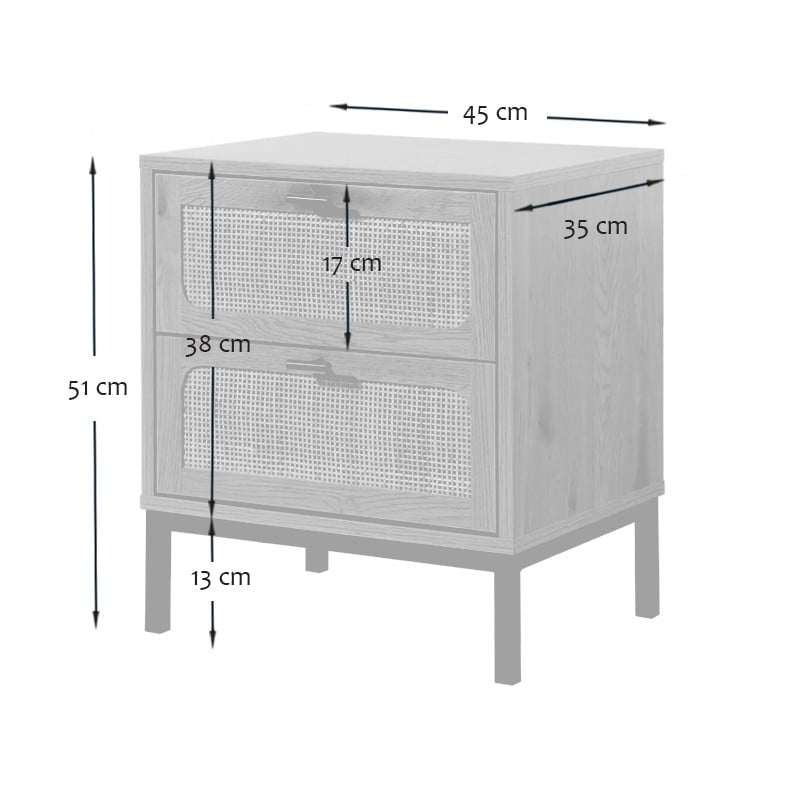 Deze tafel zal prachtig staan in uw woonkamer! Een combinatie van opslag en decoratie, het zal perfect zijn in uw huis! Voeg met dit nachtkastje extra opbergruimte toe aan uw kamer, dankzij de twee grote lades kunt u uw dagelijkse spullen opbergen. De voorkant van rotan geeft het een natuurlijke en warme uitstraling en past bij elke inrichting. Met zijn compacte afmetingen en zijn stijl tussen industrieel en natuurlijk, kan dit nachtkastje in uw slaapkamer of zelfs in uw woonkamer of kantoor. Gemaakt van duurzame houten panelen, zal dit dressoir u een unieke stijl geven en een meubelstuk dat jaren zal meegaan! Dit meubel wordt geleverd in een KIT met genummerde onderdelen en duidelijke montage-instructies en alle benodigde schroeven en bouten. Producteigenschappen : Samenstelling : Front in natuurlijk rotan / Onderstel en handvaten in zwart metaal / Spaanplaat met eiken afwerking Afmetingen : B 45 cm x D 35 cm x H 51 cm Gewicht : 9,3 Kg