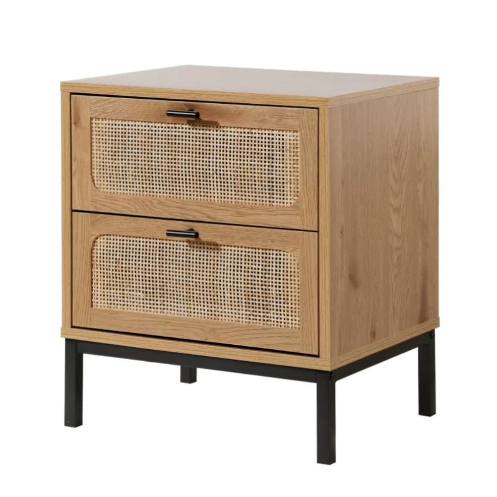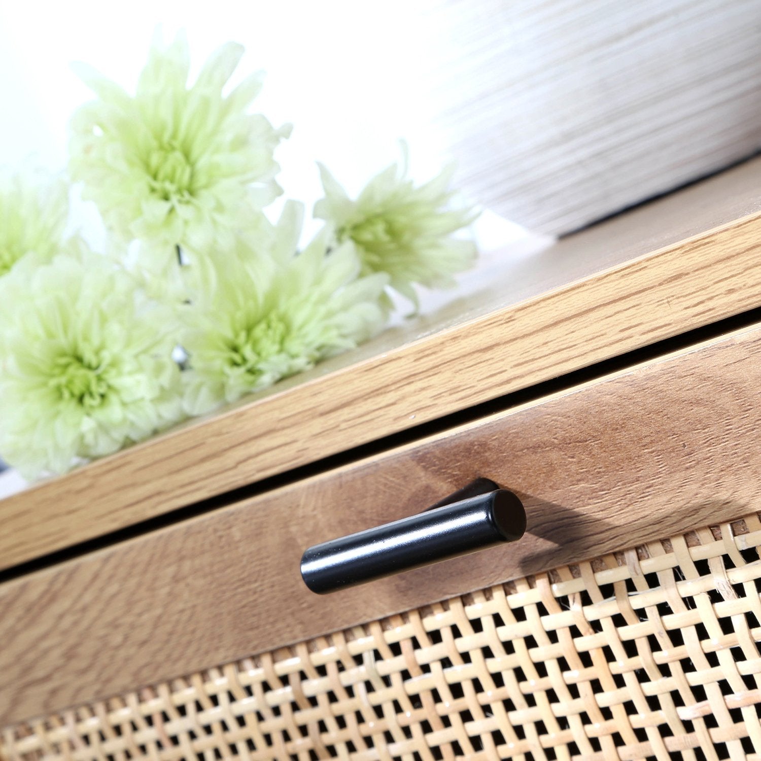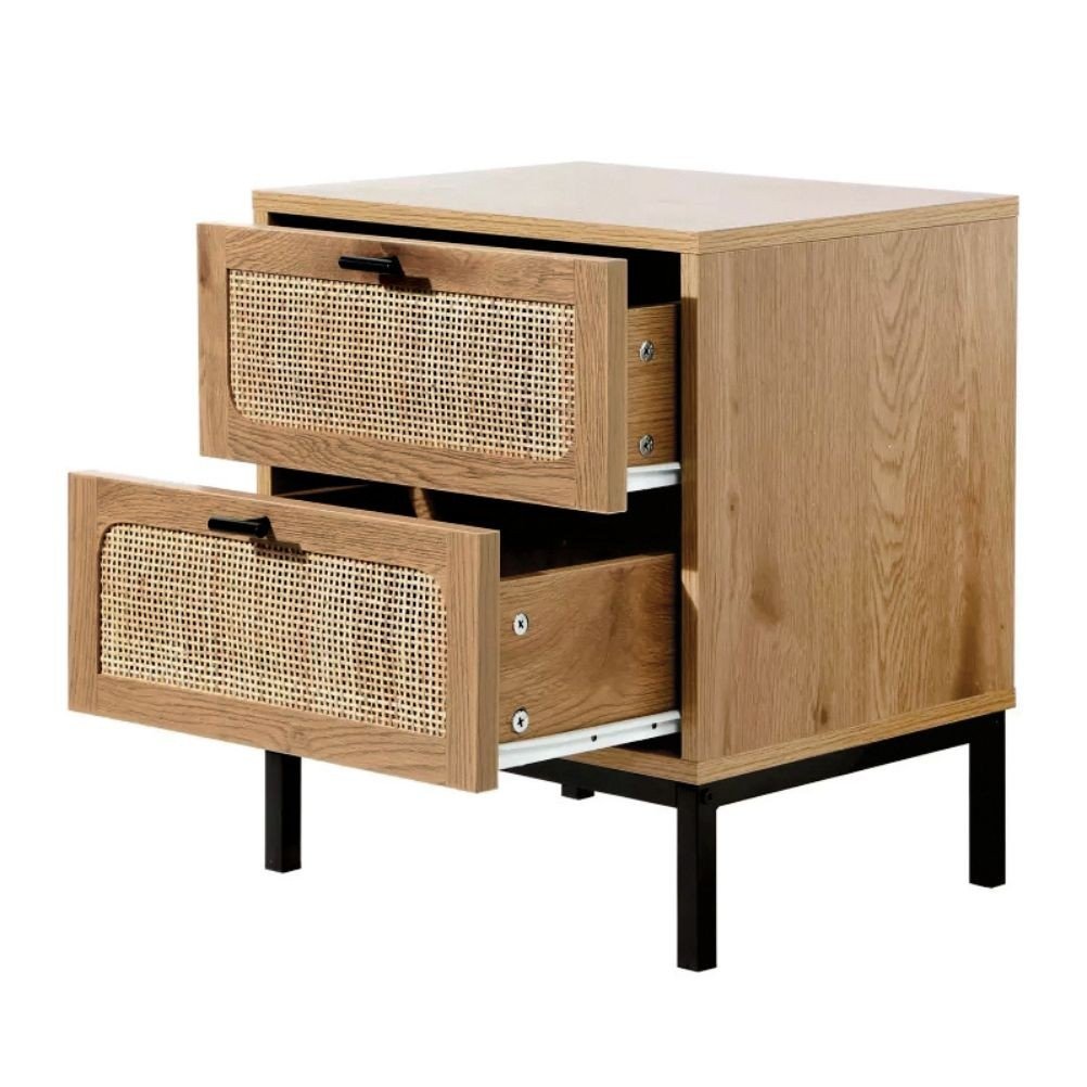 Deze tafel zal prachtig staan in uw woonkamer! Een combinatie van opslag en decoratie, het zal perfect zijn in uw huis! Voeg met dit nachtkastje extra opbergruimte toe aan uw kamer, dankzij de twee grote lades kunt u uw dagelijkse spullen opbergen. De voorkant van rotan geeft het een natuurlijke en warme uitstraling en past bij elke inrichting. Met zijn compacte afmetingen en zijn stijl tussen industrieel en natuurlijk, kan dit nachtkastje in uw slaapkamer of zelfs in uw woonkamer of kantoor. Gemaakt van duurzame houten panelen, zal dit dressoir u een unieke stijl geven en een meubelstuk dat jaren zal meegaan! Dit meubel wordt geleverd in een KIT met genummerde onderdelen en duidelijke montage-instructies en alle benodigde schroeven en bouten. Producteigenschappen : Samenstelling : Front in natuurlijk rotan / Onderstel en handvaten in zwart metaal / Spaanplaat met eiken afwerking Afmetingen : B 45 cm x D 35 cm x H 51 cm Gewicht : 9,3 Kg